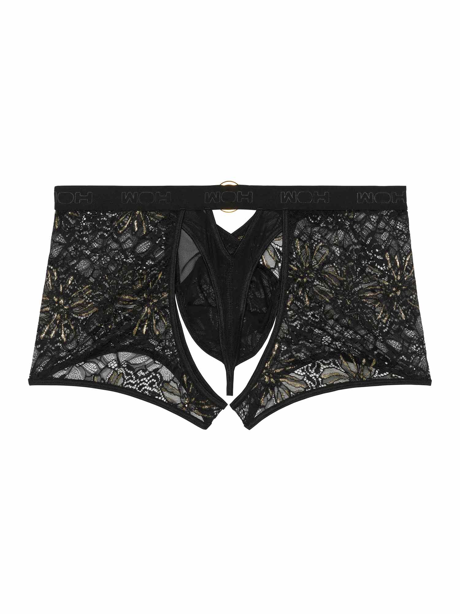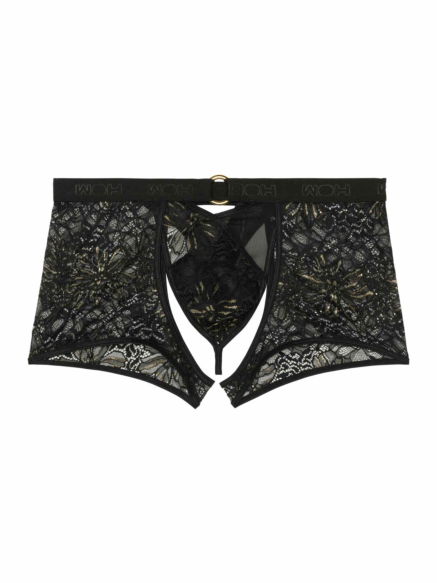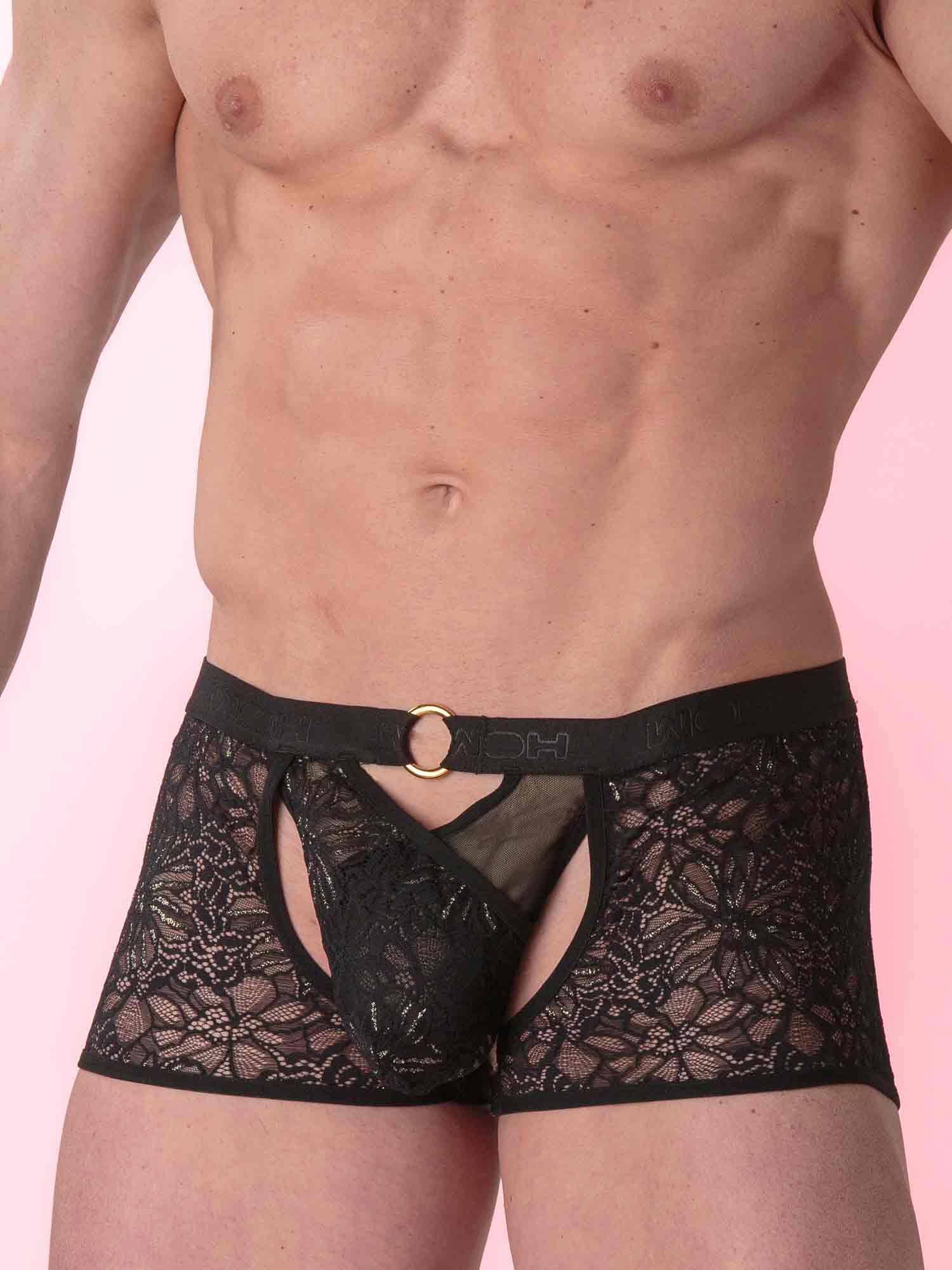 El Boxer String Pure Seduction de WOH es a la vez un bóxer y un tanga. Una declaración audaz en el mundo de la lencería masculina. Confeccionado con encaje negro y detalles dorados y tul transparente, esta prenda combina perfectamente estilo y seducción. El recorte frontal con anillo dorado aporta un detalle divertido, mientras que la espalda completamente abierta con tanga añade un extra de erotismo.