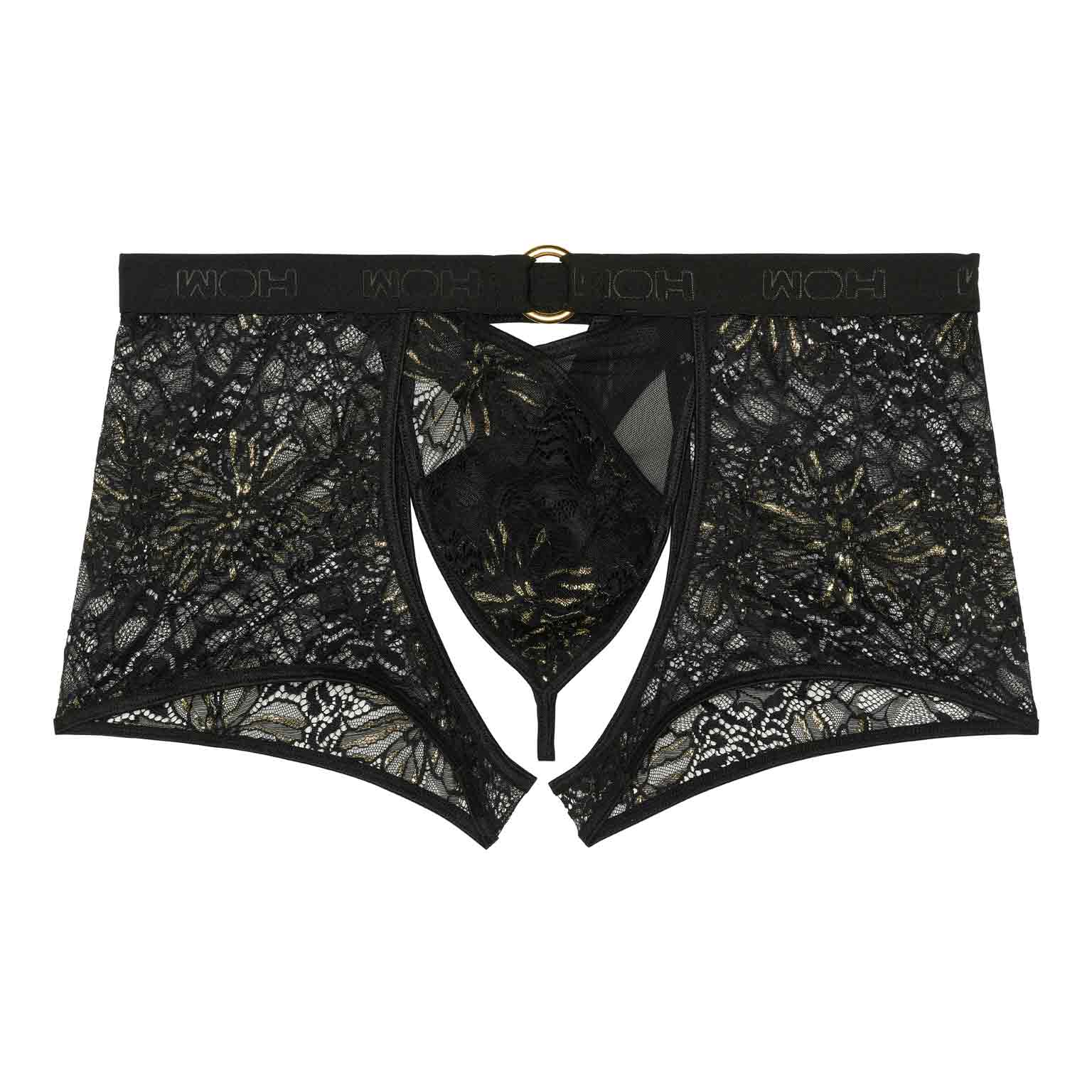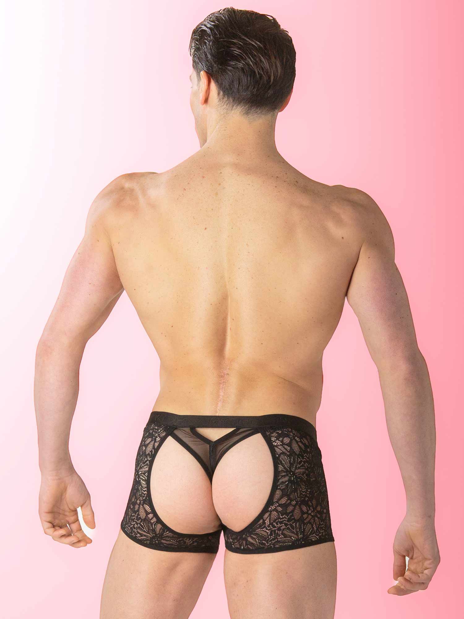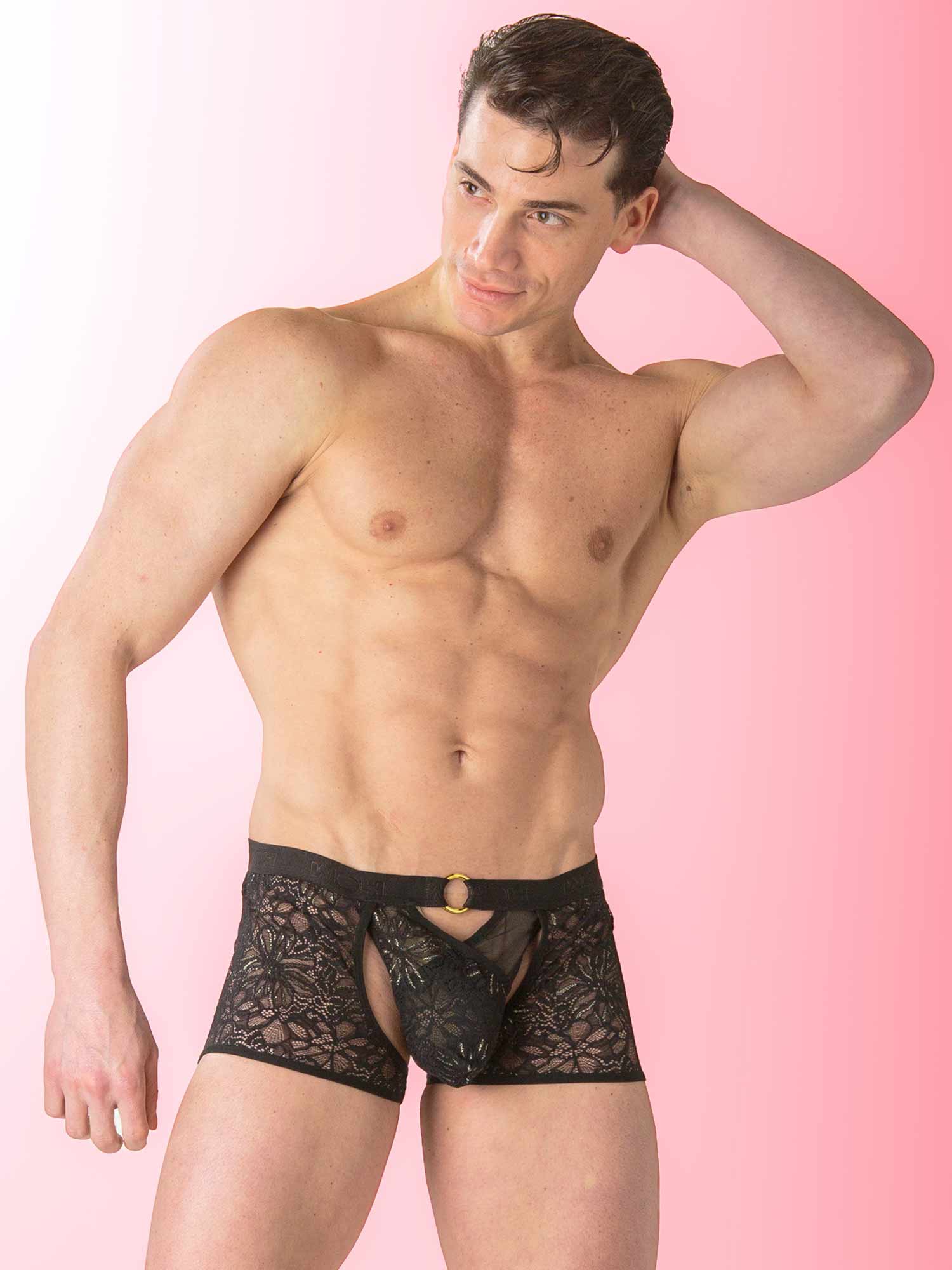 El Boxer String Pure Seduction de WOH es a la vez un bóxer y un tanga. Una declaración audaz en el mundo de la lencería masculina. Confeccionado con encaje negro y detalles dorados y tul transparente, esta prenda combina perfectamente estilo y seducción. El recorte frontal con anillo dorado aporta un detalle divertido, mientras que la espalda completamente abierta con tanga añade un extra de erotismo.