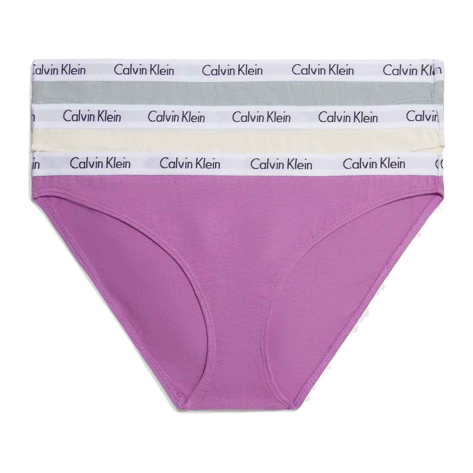 3 braguitas cómodas de Calvin Klein en un multipack, hechas de algodón elástico suave y transpirable en lila, blanco y gris melange, para variar, con el logo de Calvin Klein en la cinturilla elástica.