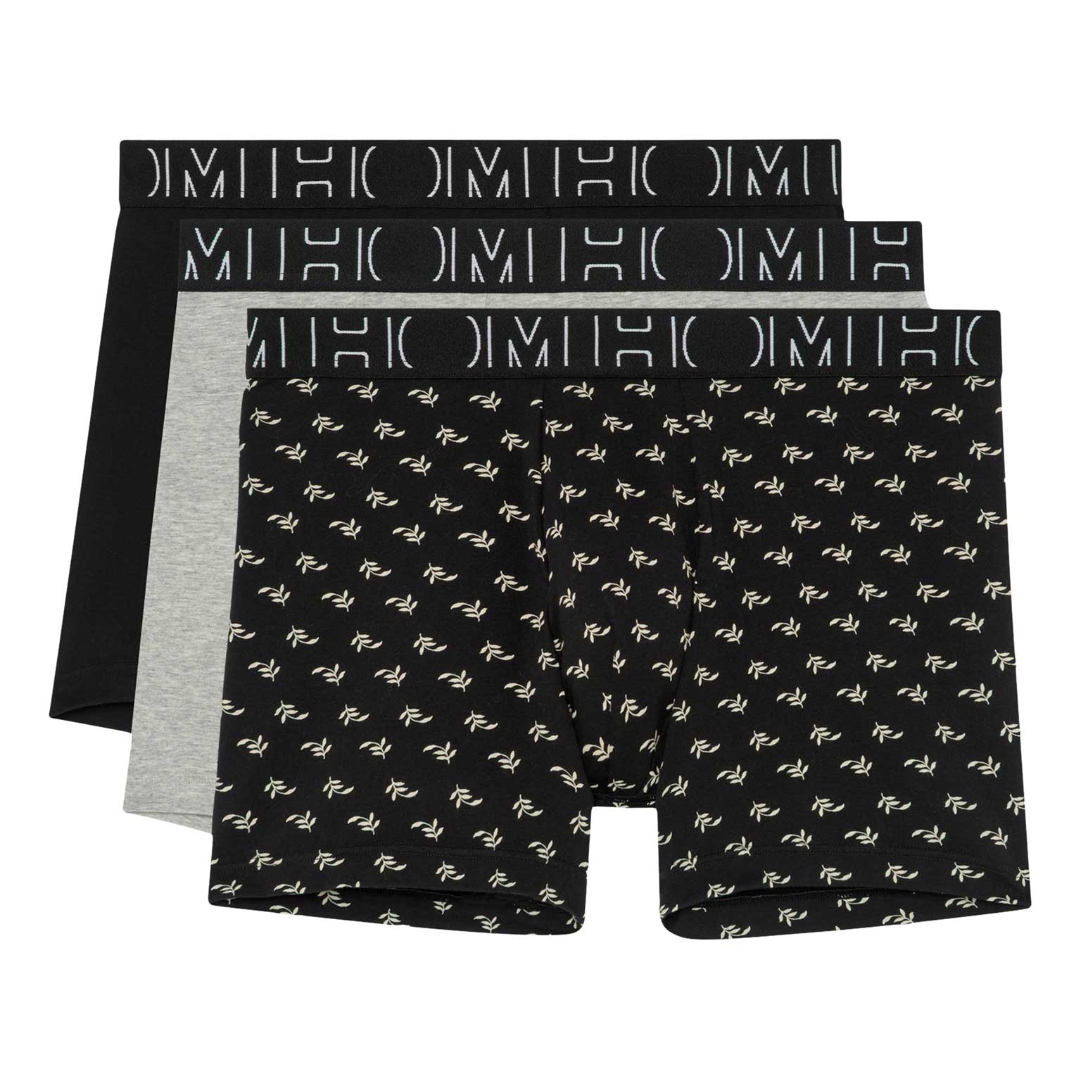 Long - Boxers en un pack económico hecho de algodón elástico 95/5 para un buen ajuste. Este set de bóxers es parte de la serie boxerlines y está hecho de algodón peinado. Este pack incluye tres bóxers con piernas más largas que los bóxers normales. Los bóxers tienen una cinturilla negra con el logo de HOM, con un bóxer con un elegante estampado de hojas sobre un fondo negro y los otros dos bóxers en negro y gris. Estos bóxers para hombre son adecuados para el uso diario y están diseñados con una bolsa en la parte delantera para mayor soporte y comodidad. La serie boxerlines está hecha de un algodón más ligero que los packs individuales, lo que los hace menos duraderos.