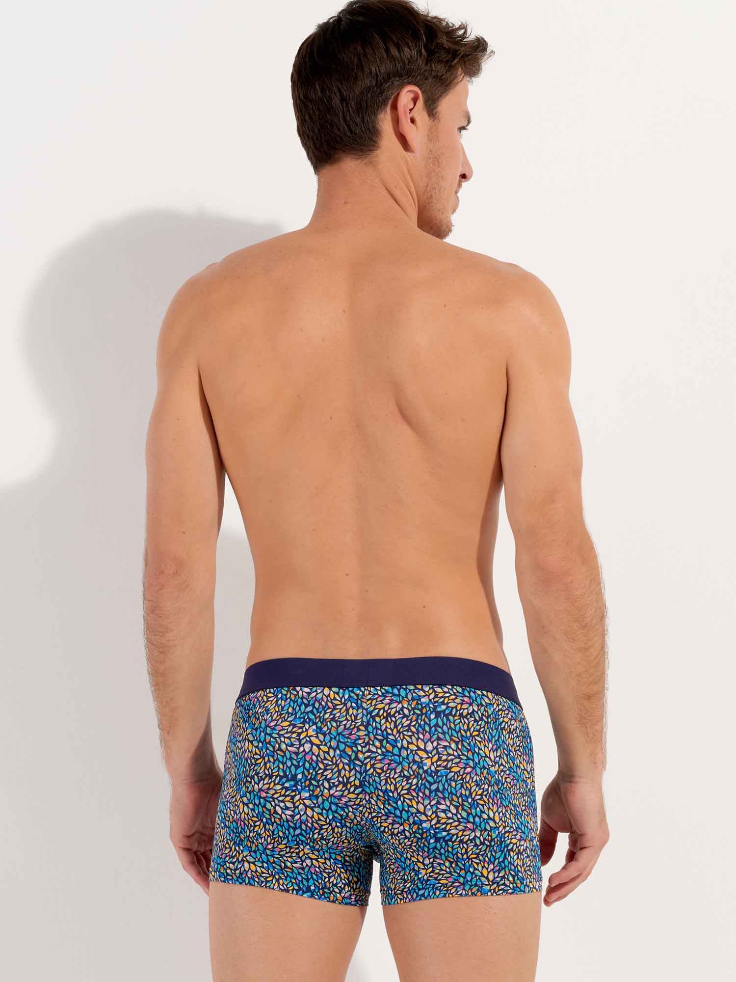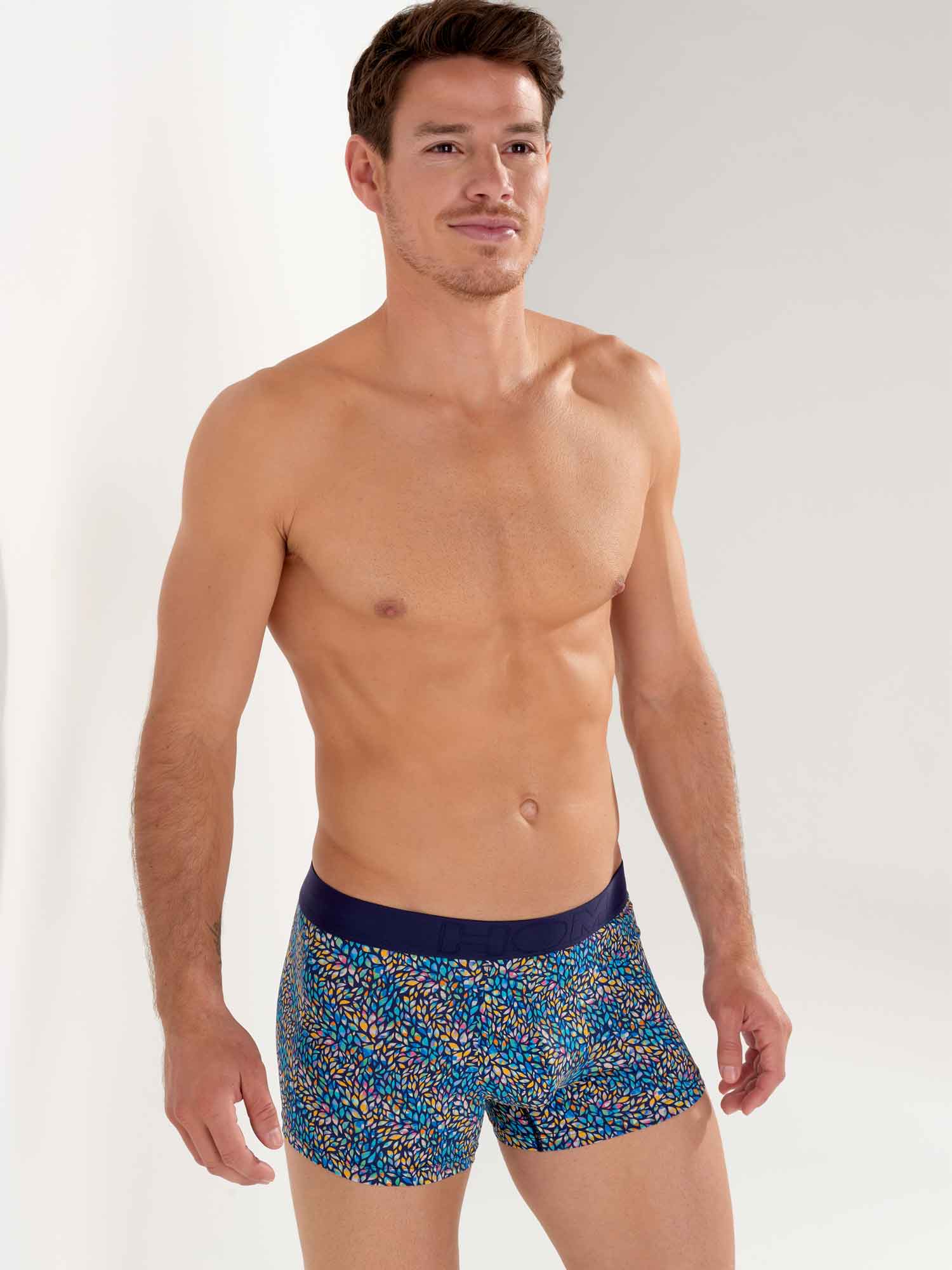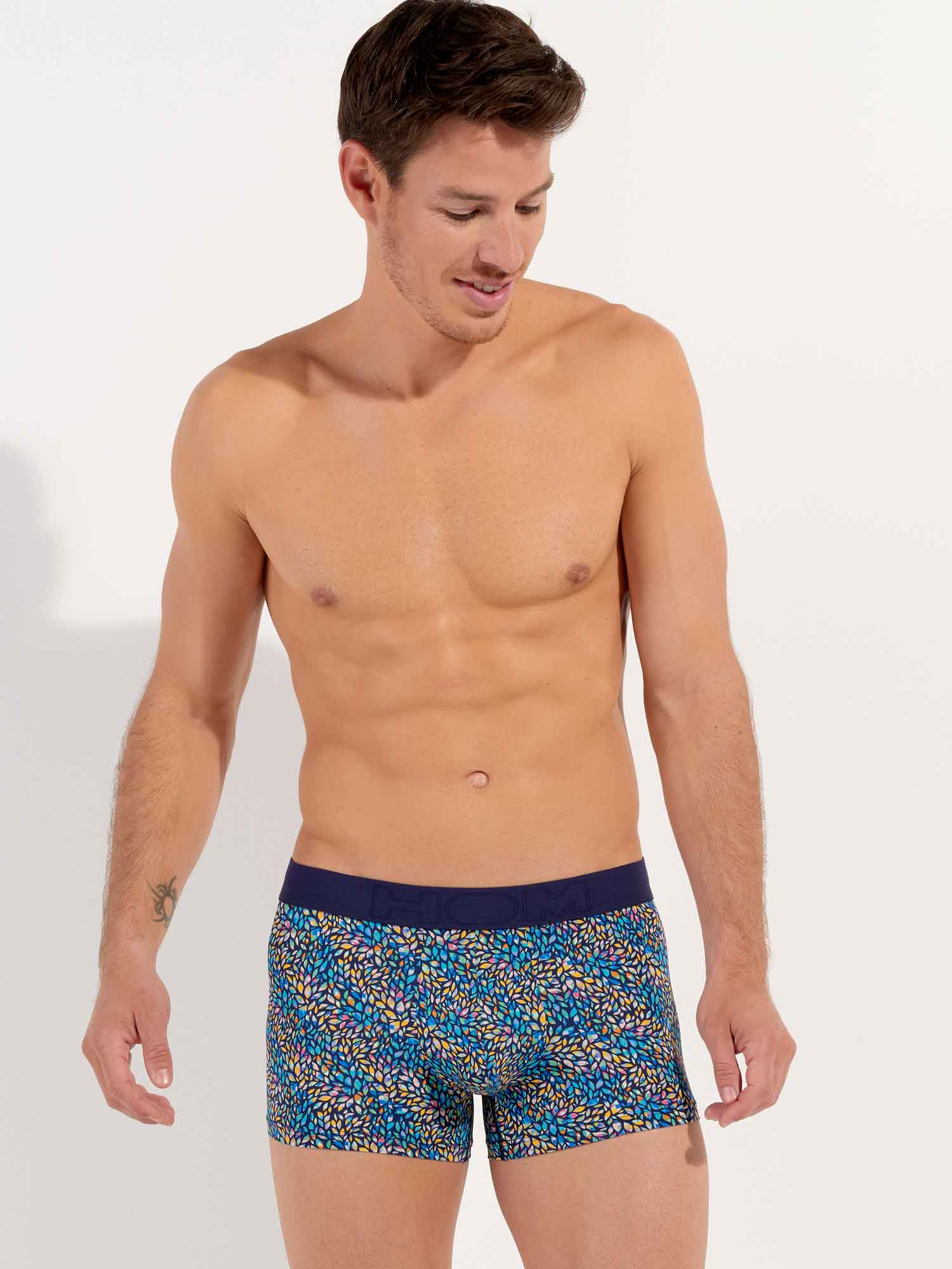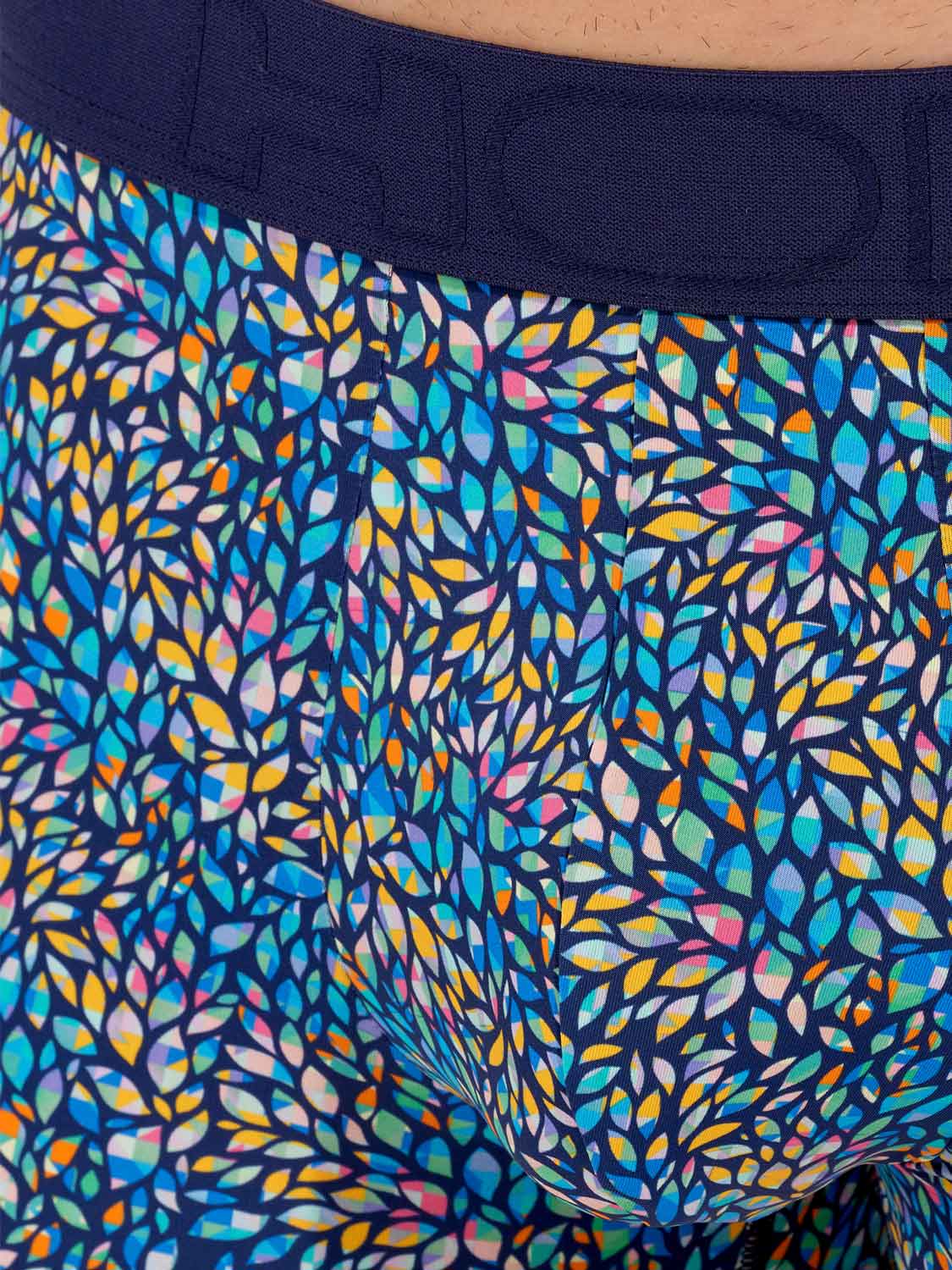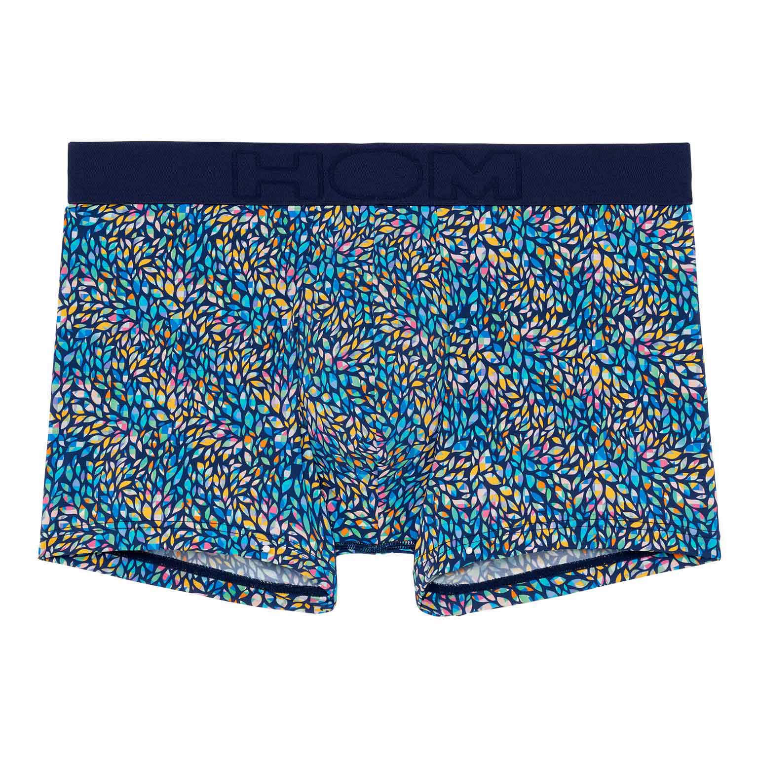 Los Buddy - Boxer Briefs están hechos de una cómoda microfibra. Estos boxers para hombre presentan un estampado con pequeñas hojas multicolores incrustadas con motivos geométricos sobre un fondo azul marino. Los Buddy tienen una cintura elástica de algodón con el logotipo HOM en tono sobre tono.