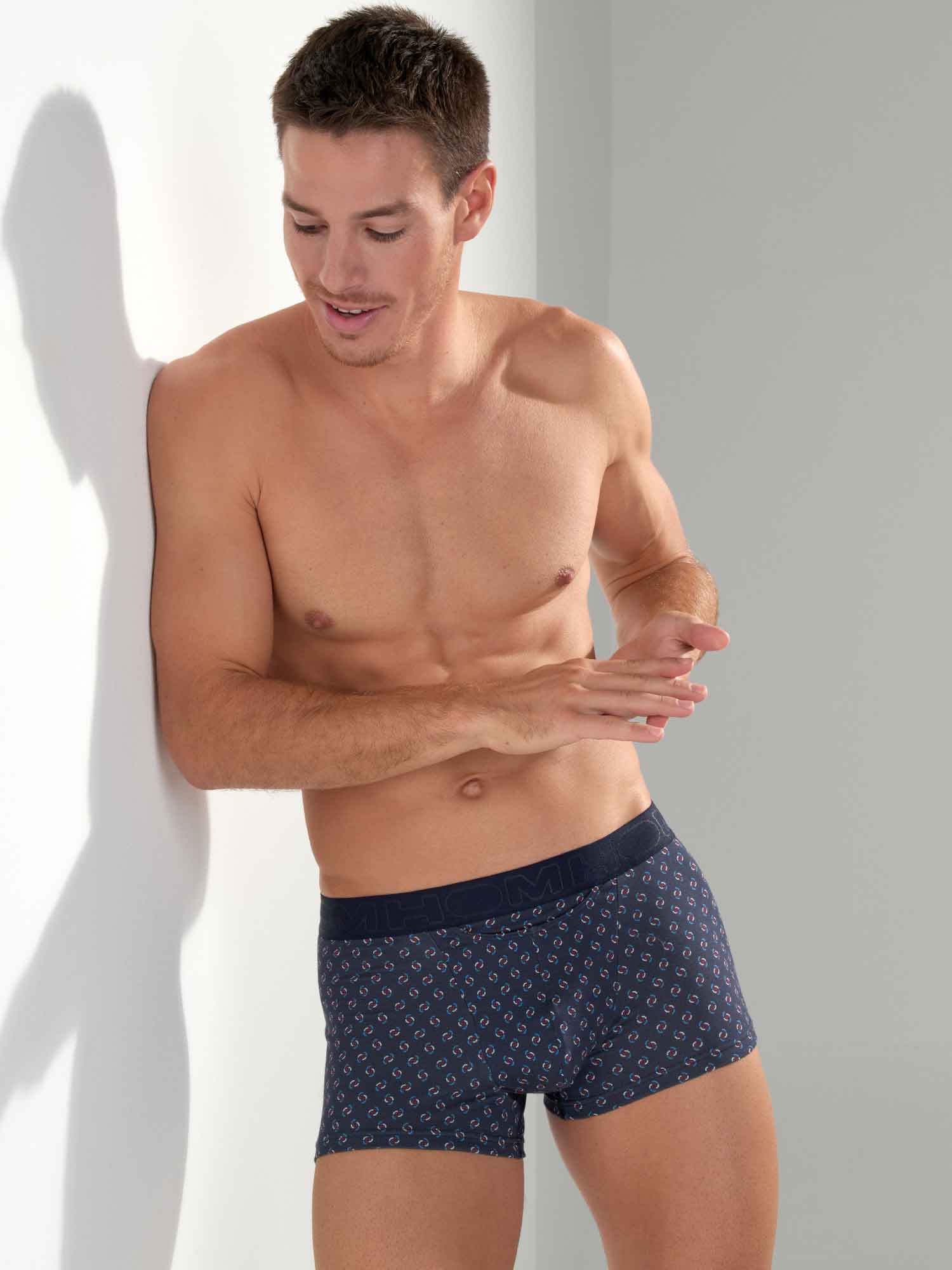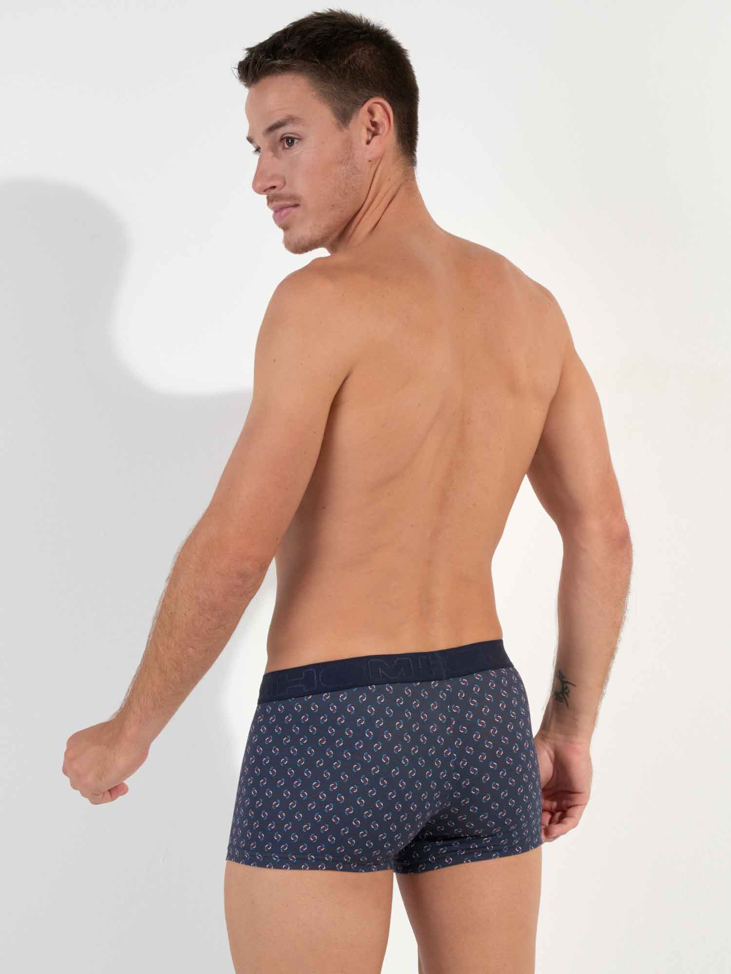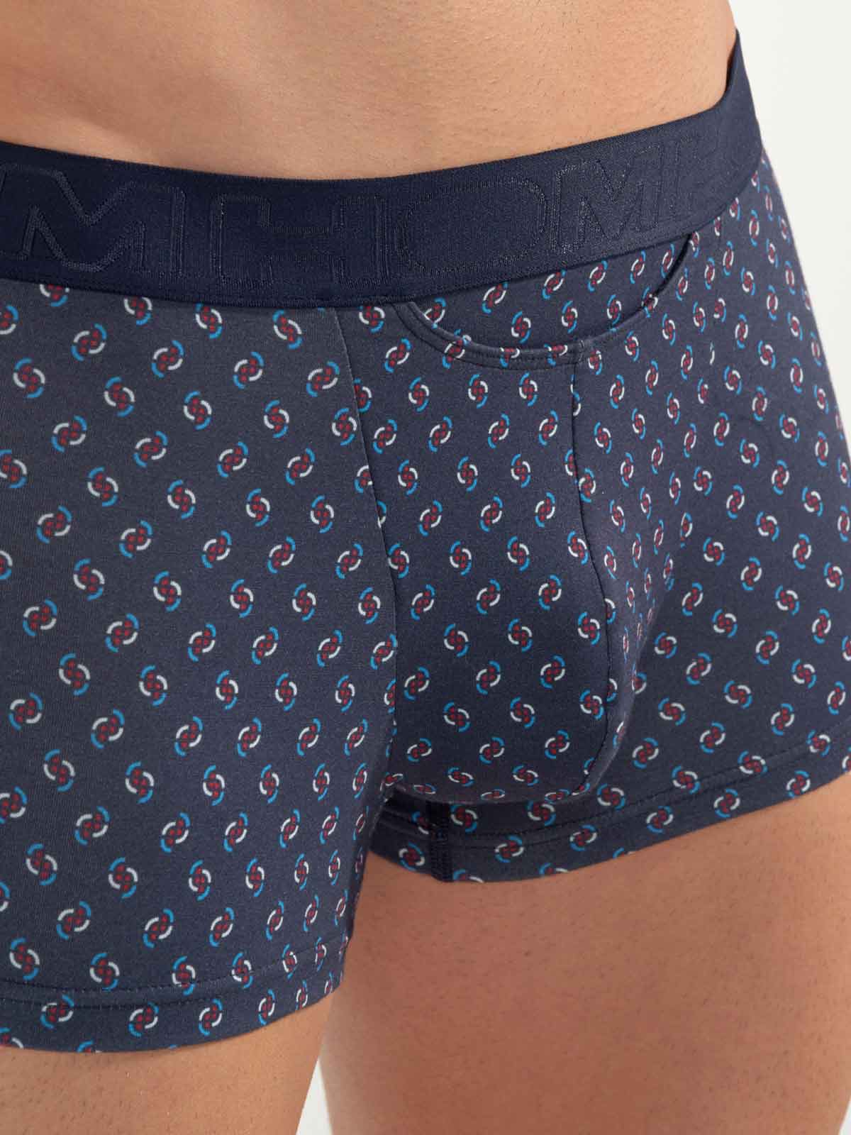 Los Cyrus - HO1 Boxer Briefs están hechos de algodón modal y cuentan con la 'apertura horizontal', la bragueta especial para mayor comodidad, por la que HOM es famosa. Este bóxer para hombre tiene un diseño único de tres colores sobre un fondo azul marino. Los Cyrus están diseñados con una cintura elástica de algodón que se ajusta cómodamente a la piel. La cintura tiene el logotipo de HOM alrededor.