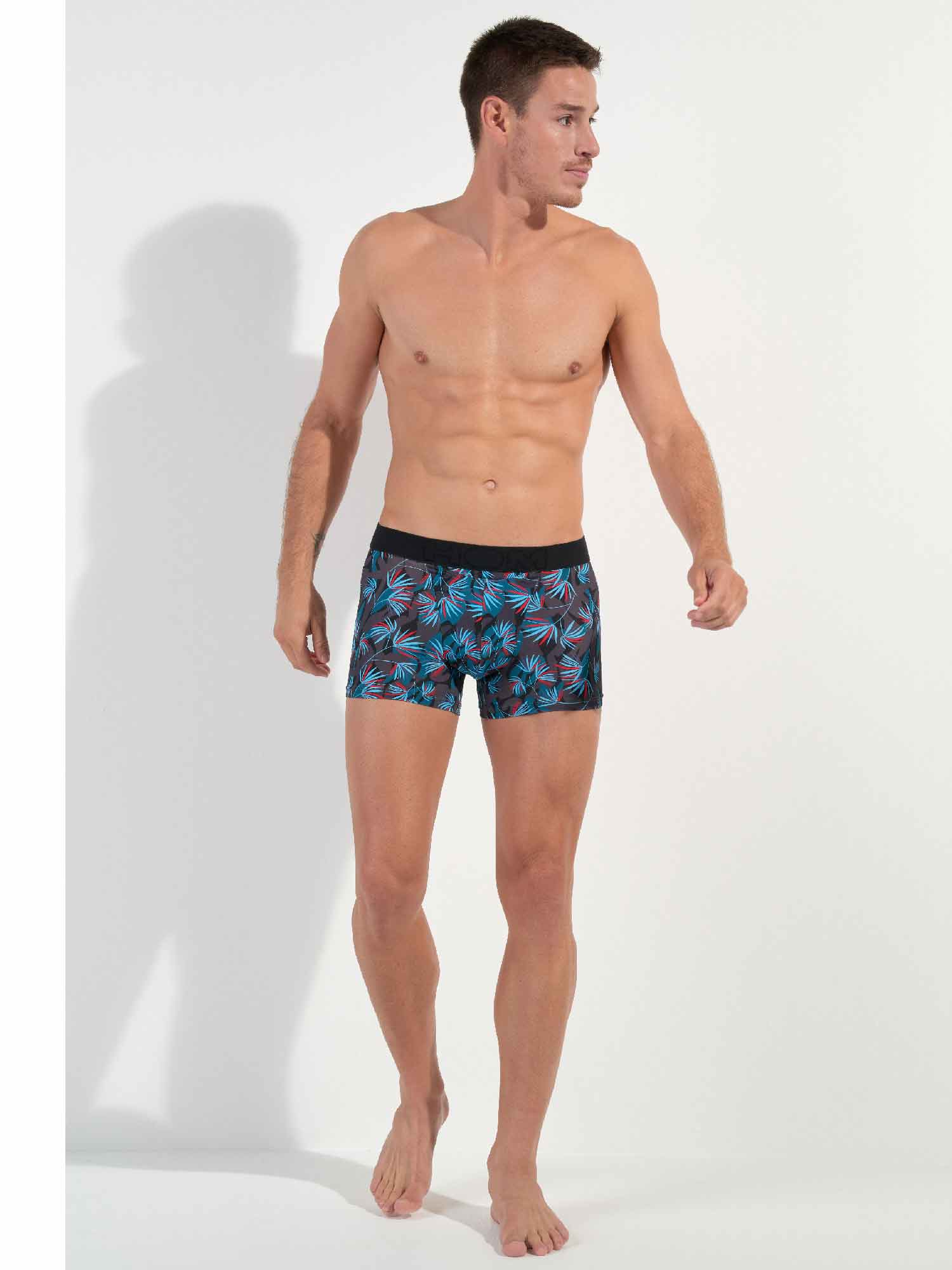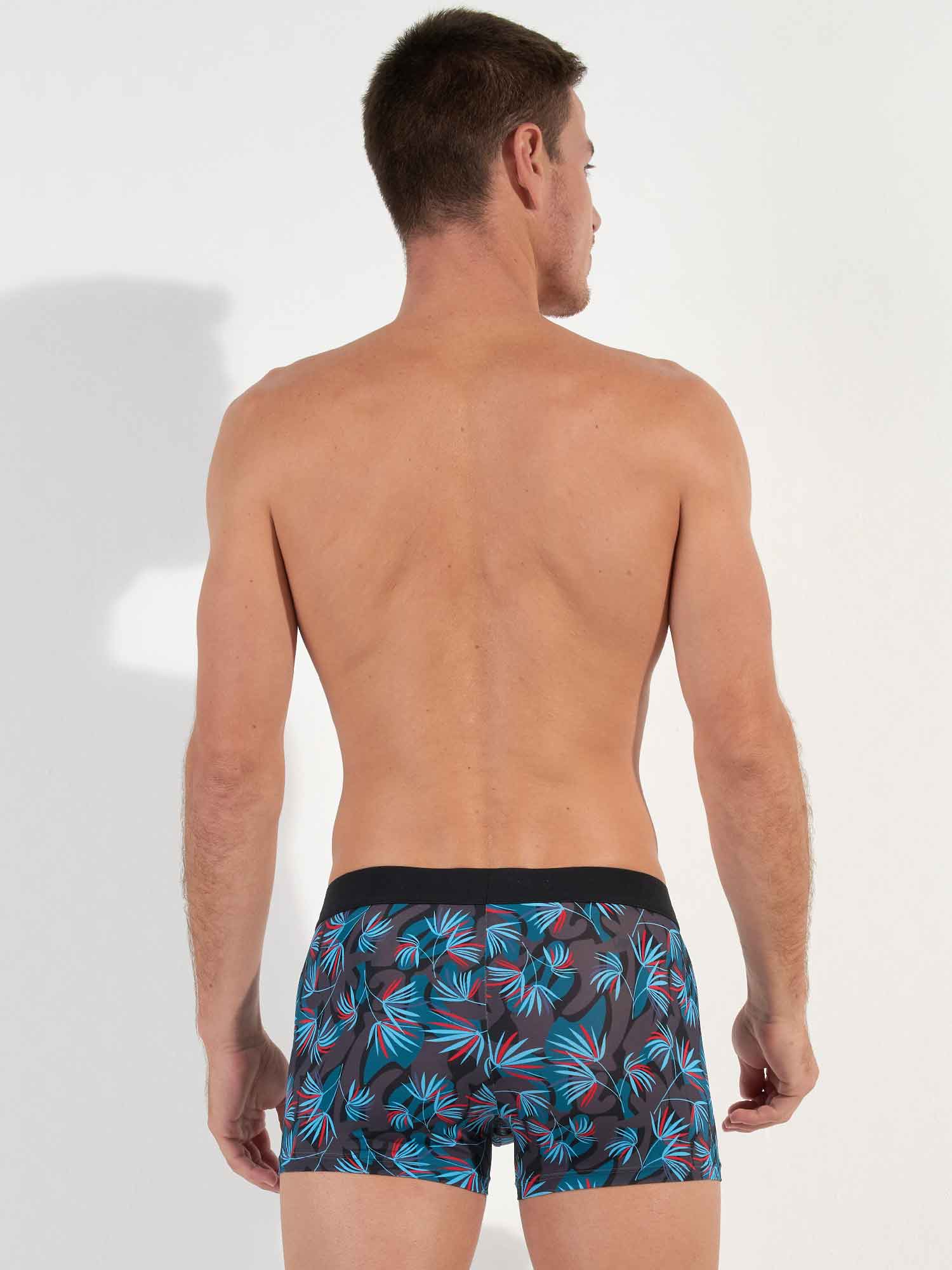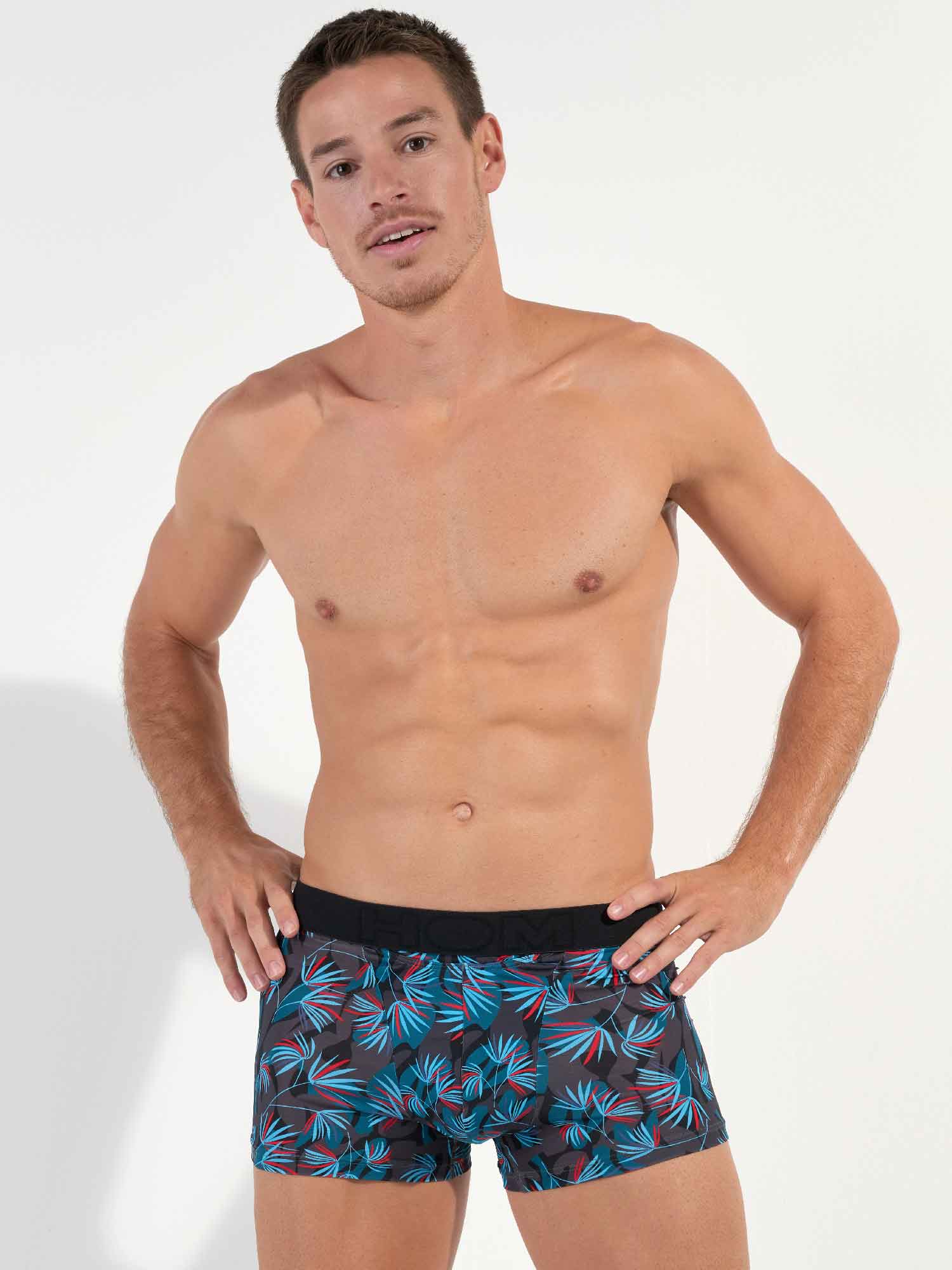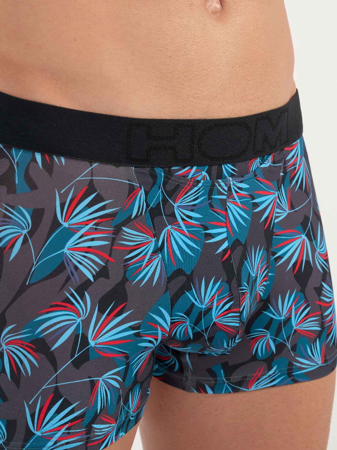 Los Hanoï - HO1 Boxer Briefs están hechos de una cómoda microfibra y cuentan con la "apertura horizontal", la bragueta especial para mayor comodidad, por la que HOM es conocido. Estos bóxers para hombre tienen un llamativo estampado de plantas exóticas en azul turquesa, azul celeste y naranja, sobre un fondo de camuflaje gris y azul. El Hanoï tiene una cintura elástica hecha de algodón con el logotipo de HOM en tono sobre tono.