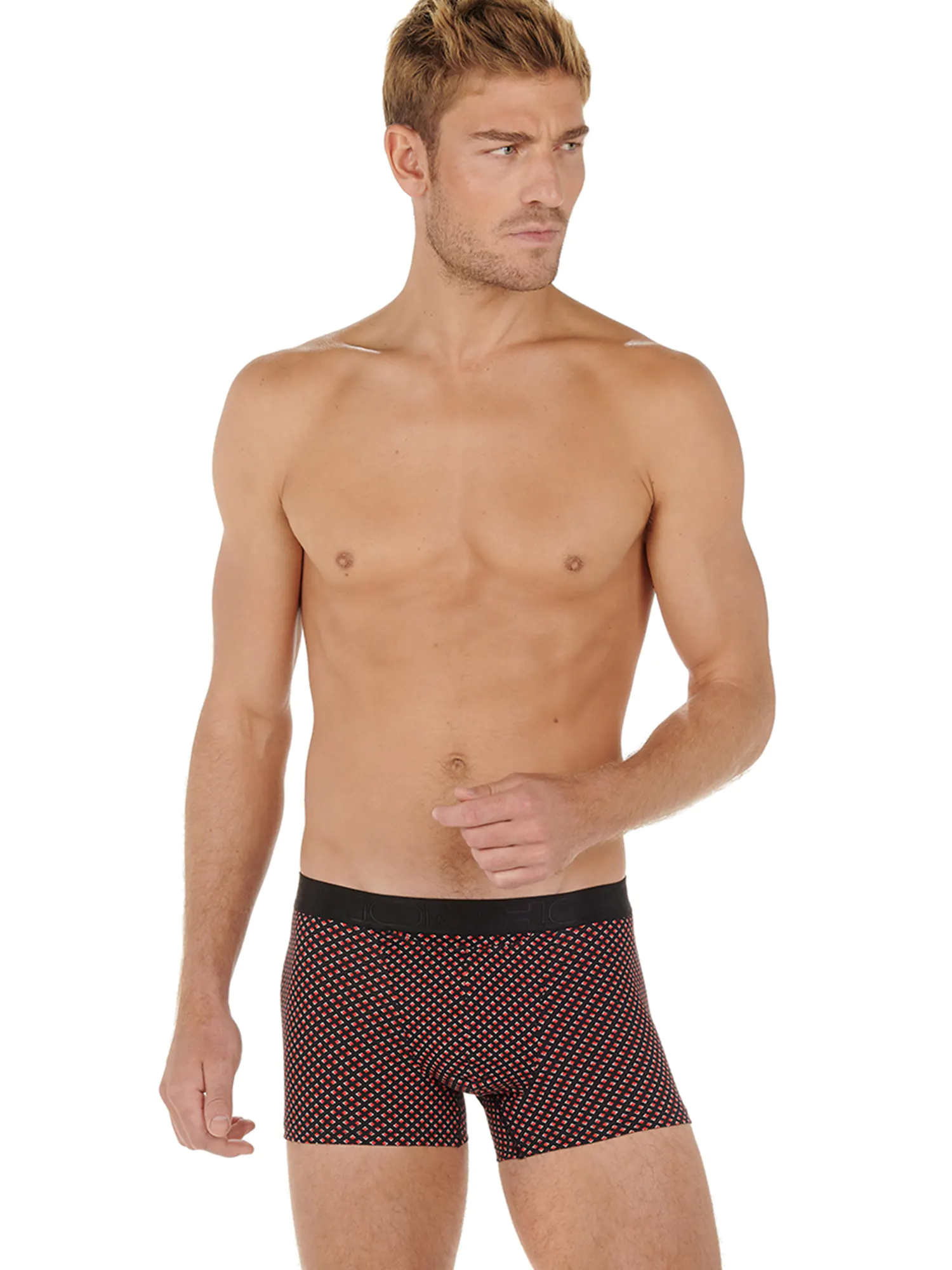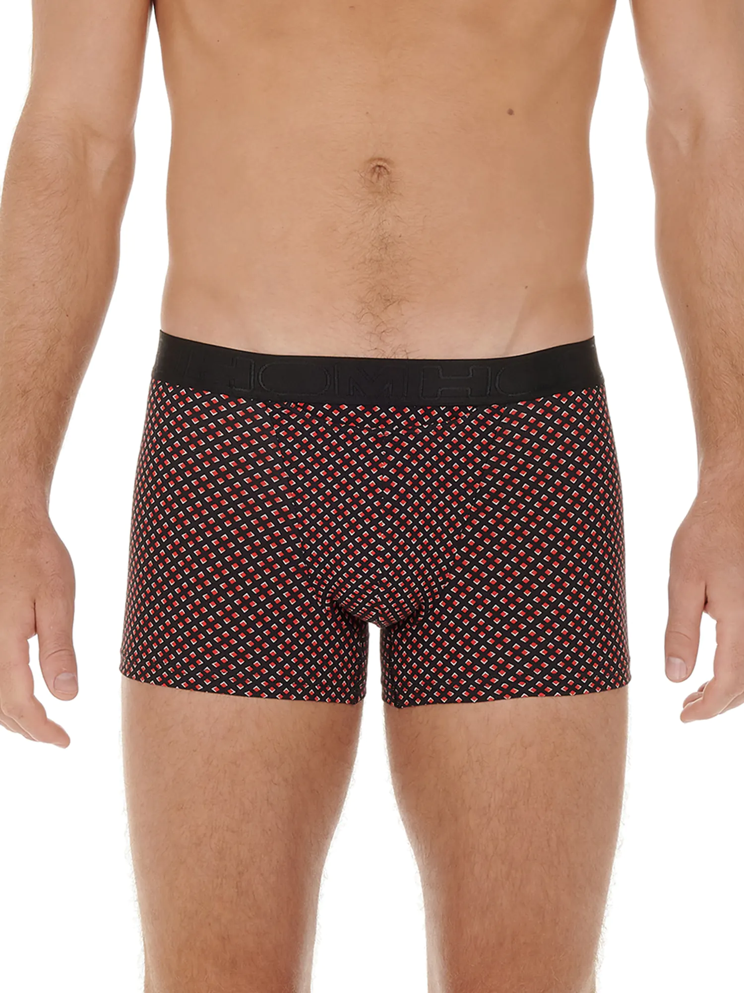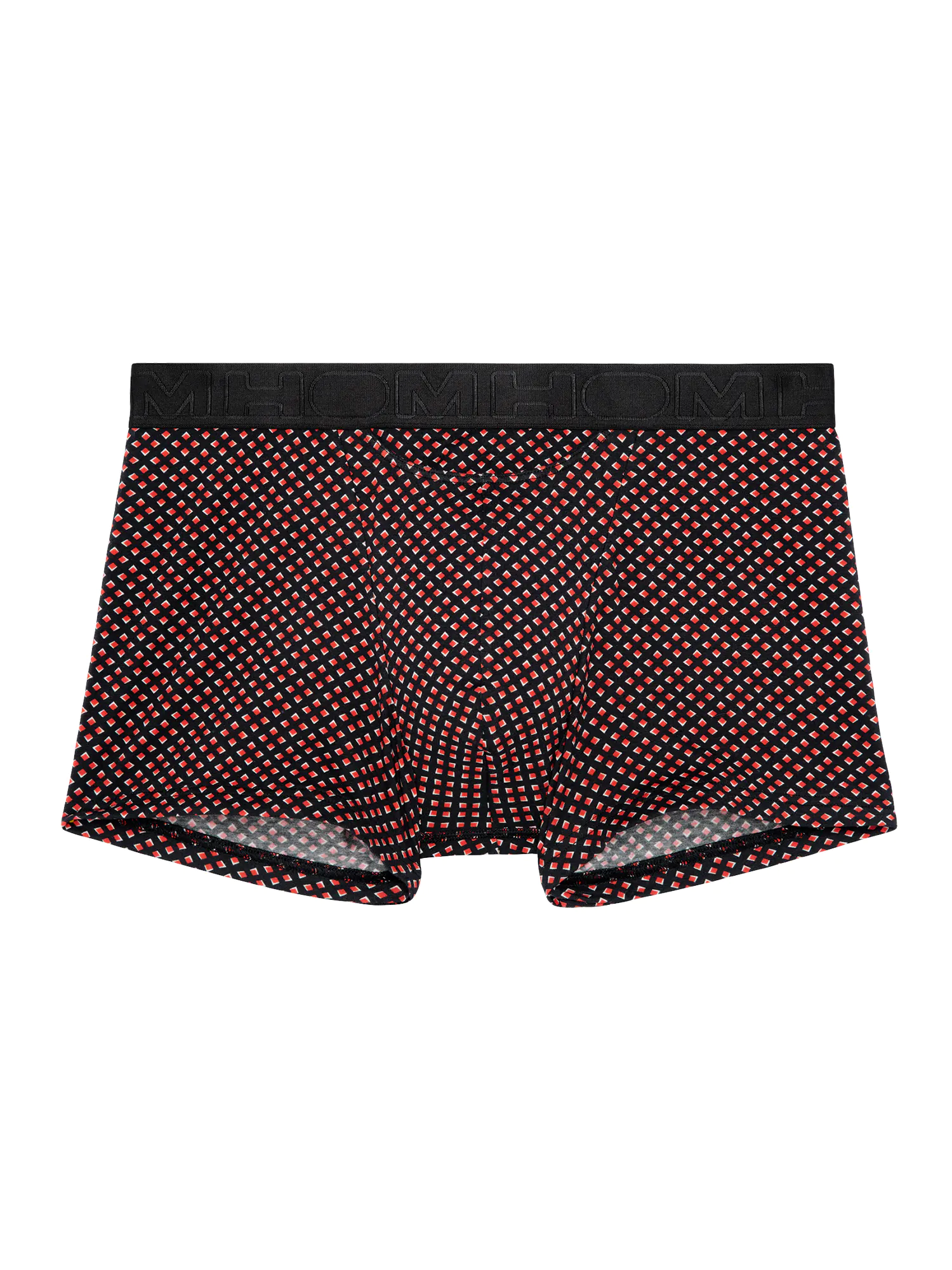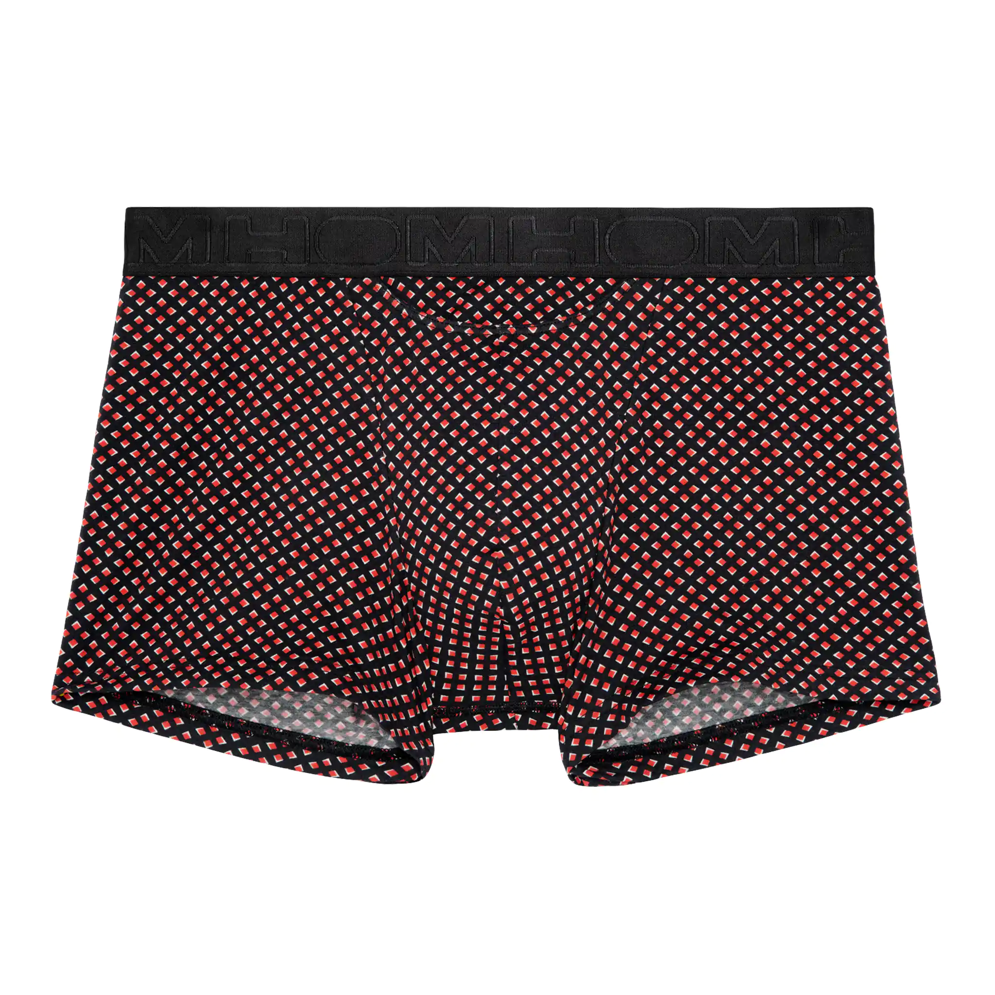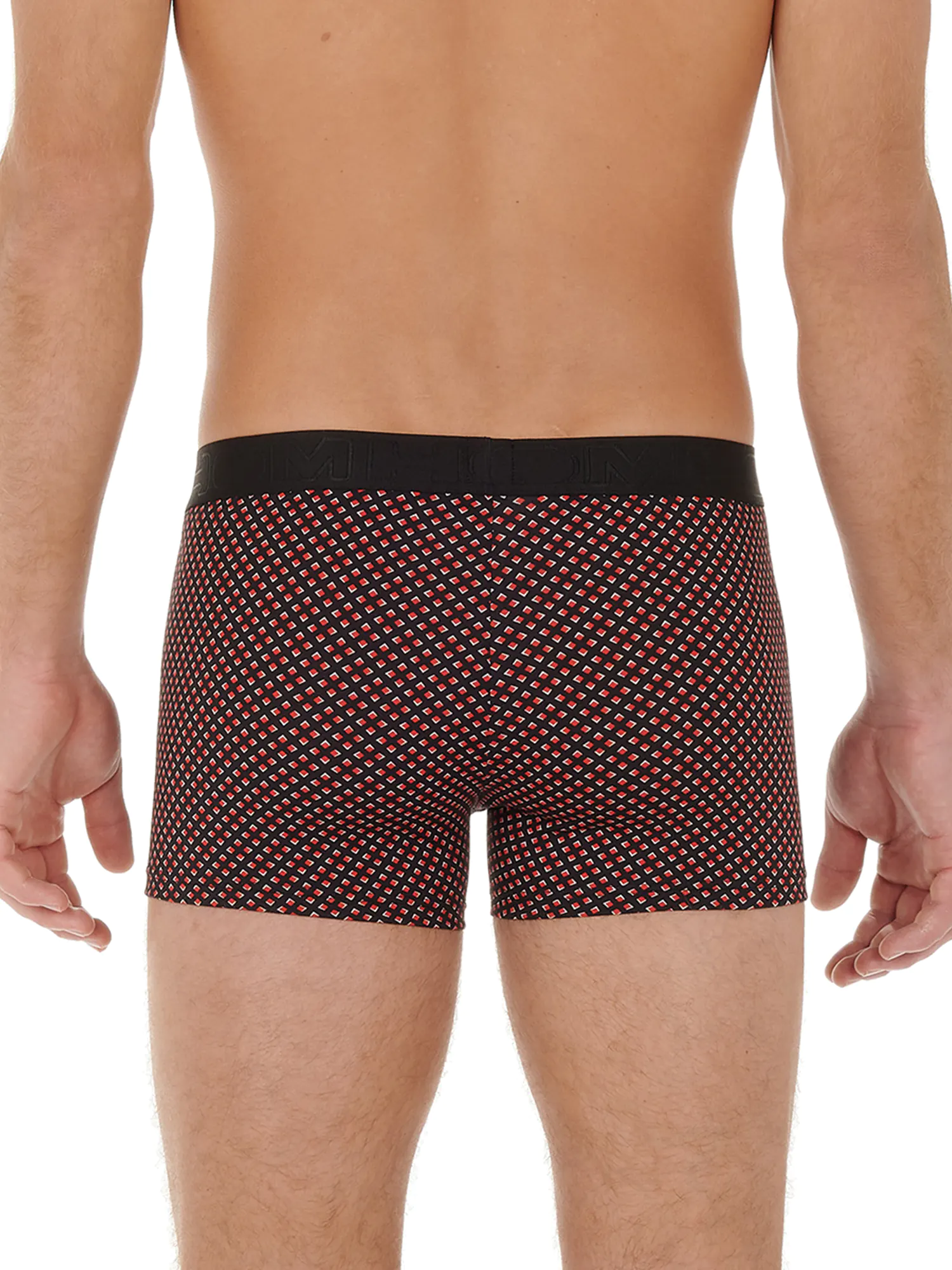El Murray - HO1 Boxer Brief está hecho de una cómoda mezcla de algodón-modal y presenta la característica 'bragueta horizontal' de HOM. El Murray tiene un estampado bicolor con un patrón de diamantes en blanco y rojo sobre un fondo negro. La mezcla de algodón-modal se siente suave y asegura un ajuste que se adapta estrechamente al cuerpo. Además, el algodón-modal tiene excelentes propiedades absorbentes y transpirables, por lo que es mucho menos probable que tengas áreas cálidas y húmedas en tu ropa interior. Dado que tanto el algodón como el modal tienen un origen natural, el Murray es adecuado para cualquier hombre que le guste usar tejidos naturales. Con el uso normal, la tela es resistente al encogimiento y a la abrasión. El bóxer tiene una amplia cintura elástica, con el logo de HOM alrededor.