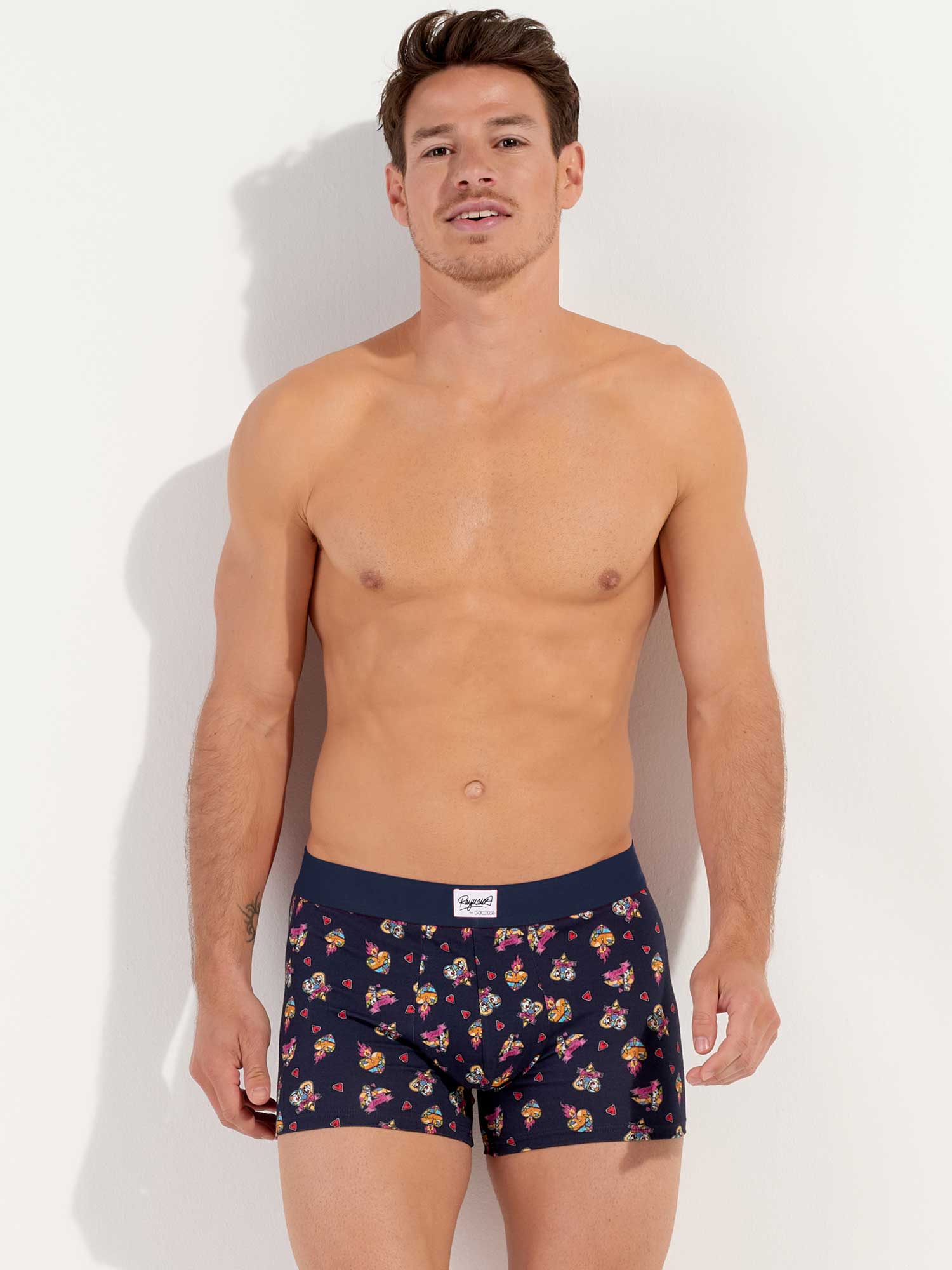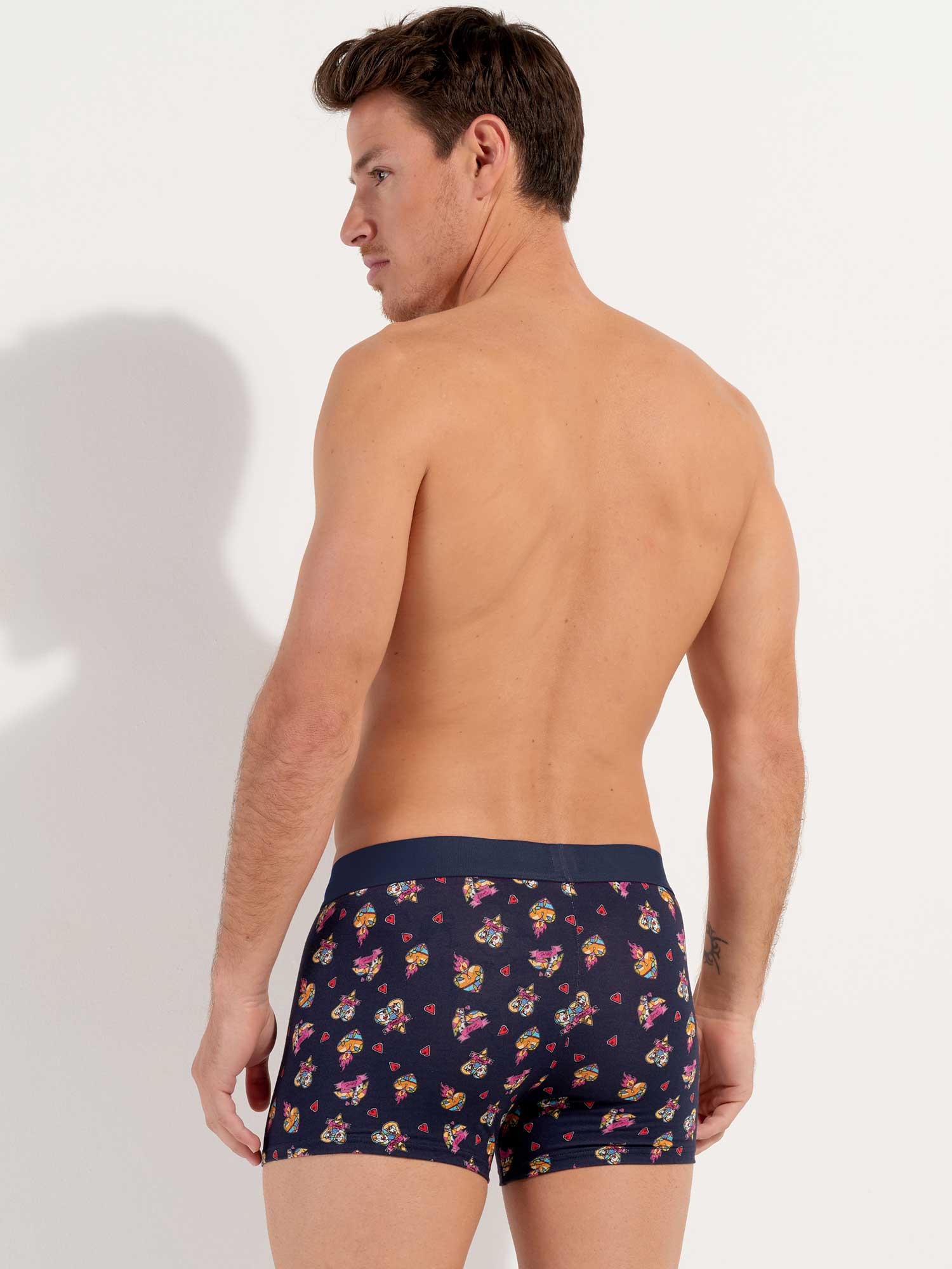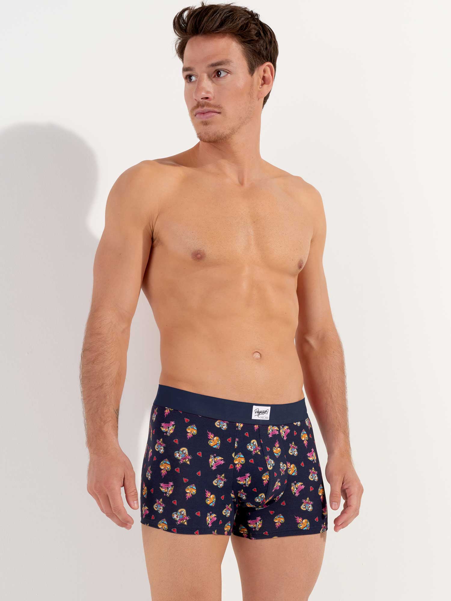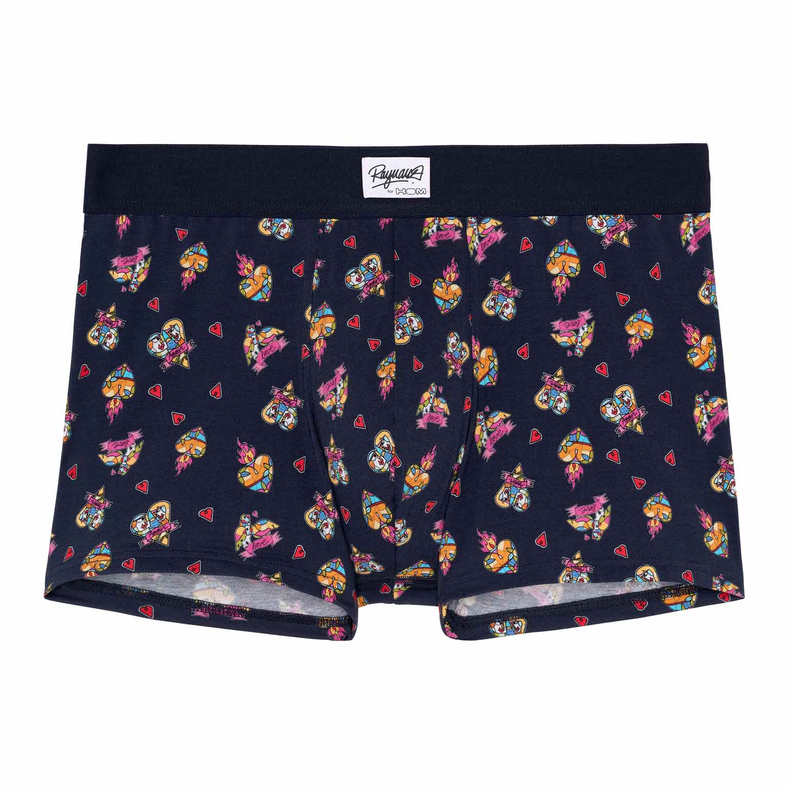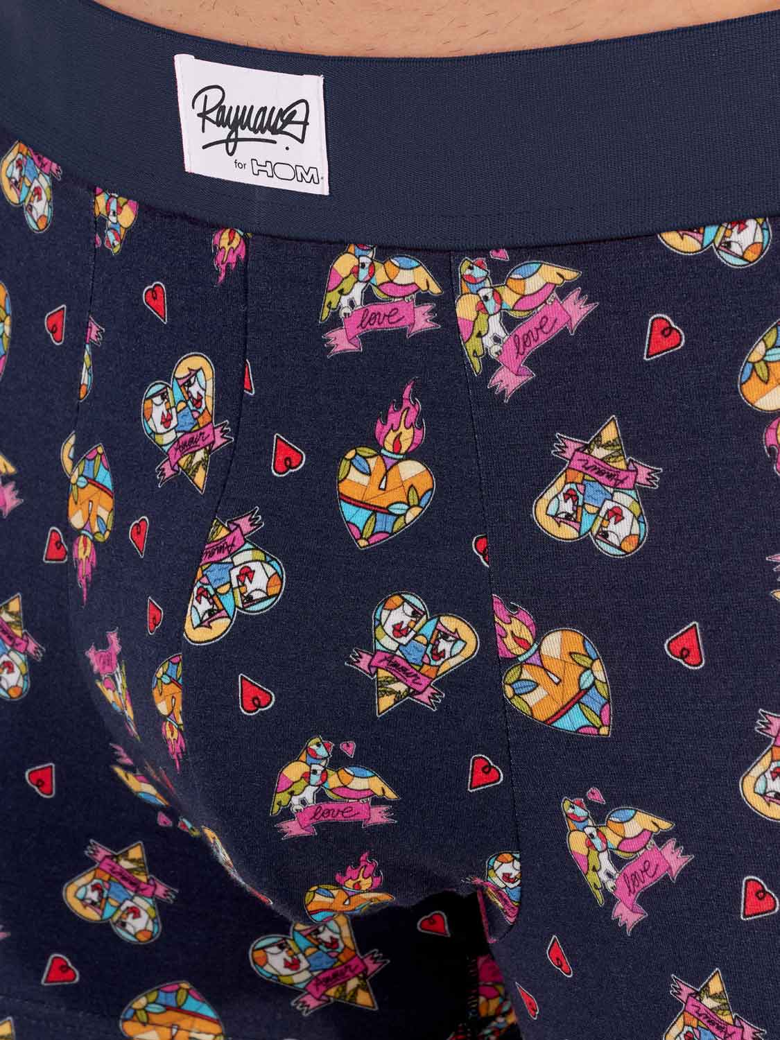Los Love Story - Boxer Briefs es uno de los dos diseños del diseñador invitado Julien Raynaud. Esta edición especial está hecha de algodón-modal de alta calidad y presenta dibujos que evocan el amor, con pequeños corazones ilustrados a través de figuras geométricas en mosaicos multicolores sobre un fondo azul marino. La cintura elástica está diseñada en un rojo llamativo, como una expresión adicional de amor, con un logotipo único y la firma de Julien Raynaud.