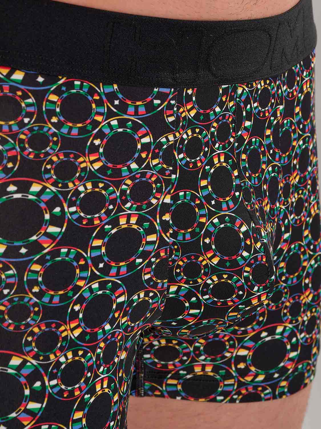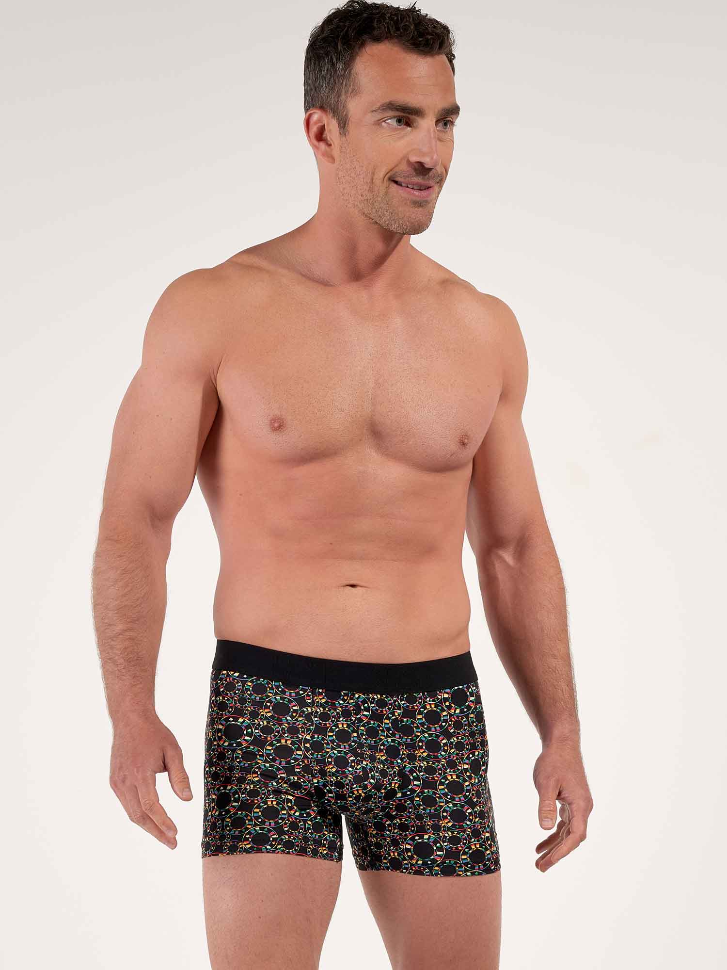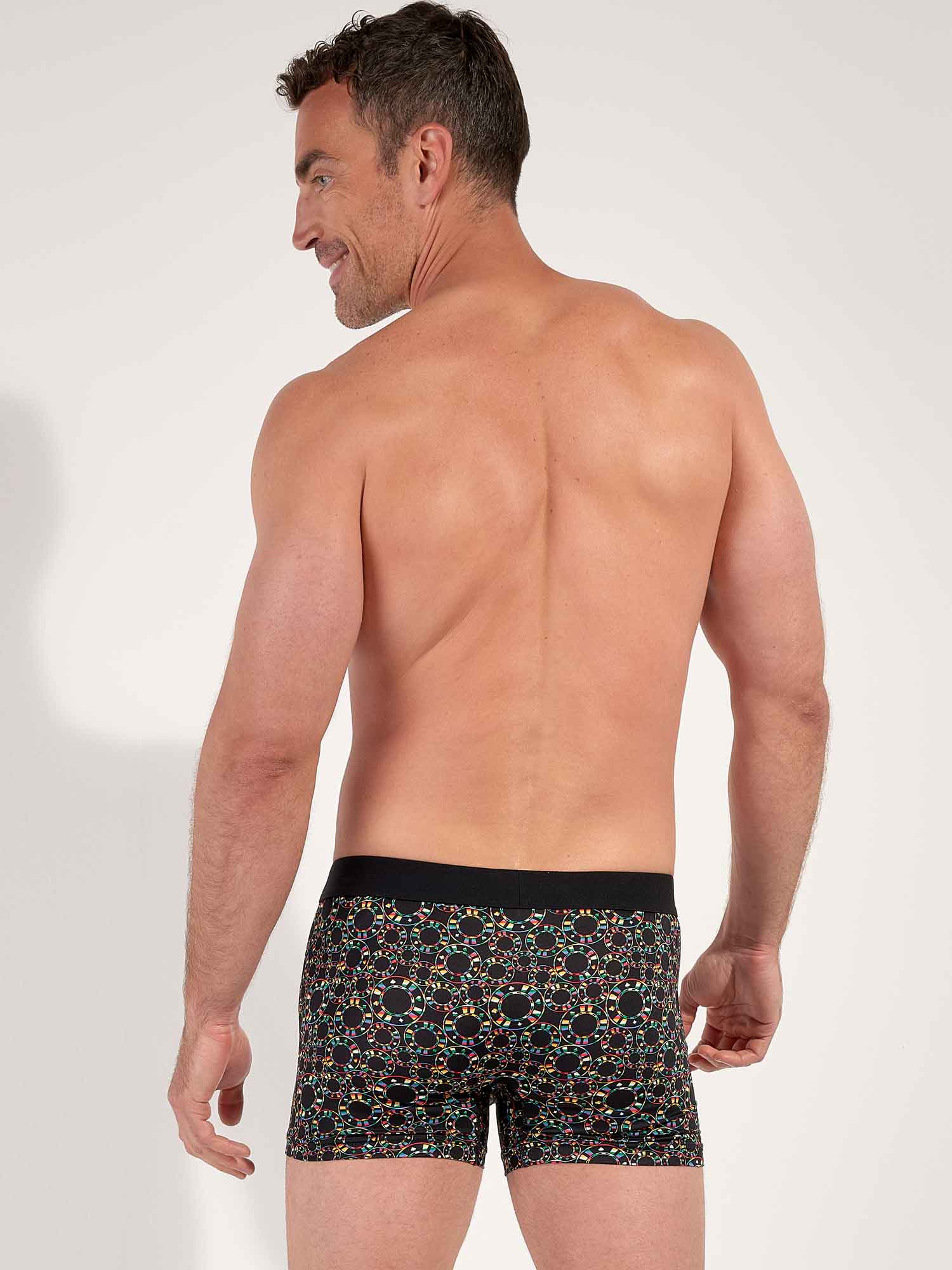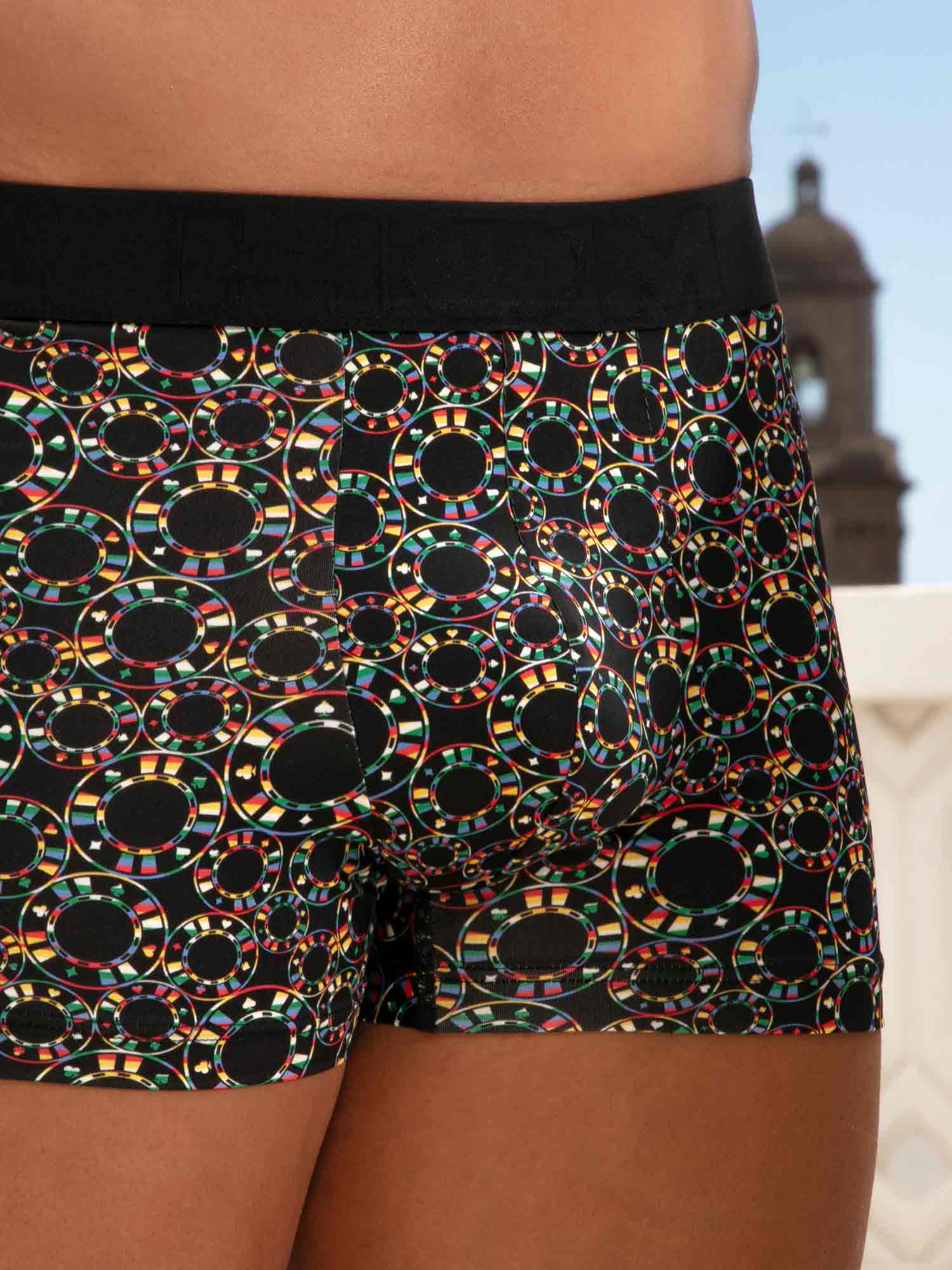 Los bóxers Red Rock te llevan al universo silencioso y electrizante de los casinos. El llamativo estampado de fichas destaca sobre el negro profundo, combinando rojos y verdes intensos con blanco limpio y discretos acentos dorados, para un look gráfico y seguro. La microfibra suave y elástica se adapta al cuerpo con una sensación ligera de segunda piel. La cintura sin costuras ofrece una sujeción estable sin oprimir, mientras que el elástico interior frontal aporta un soporte discreto y preciso. Un acabado refinado en la pierna ayuda a evitar que el tejido se suba, incluso al sentarte, y la etiqueta desmontable mantiene el confort sin irritaciones durante todo el día.