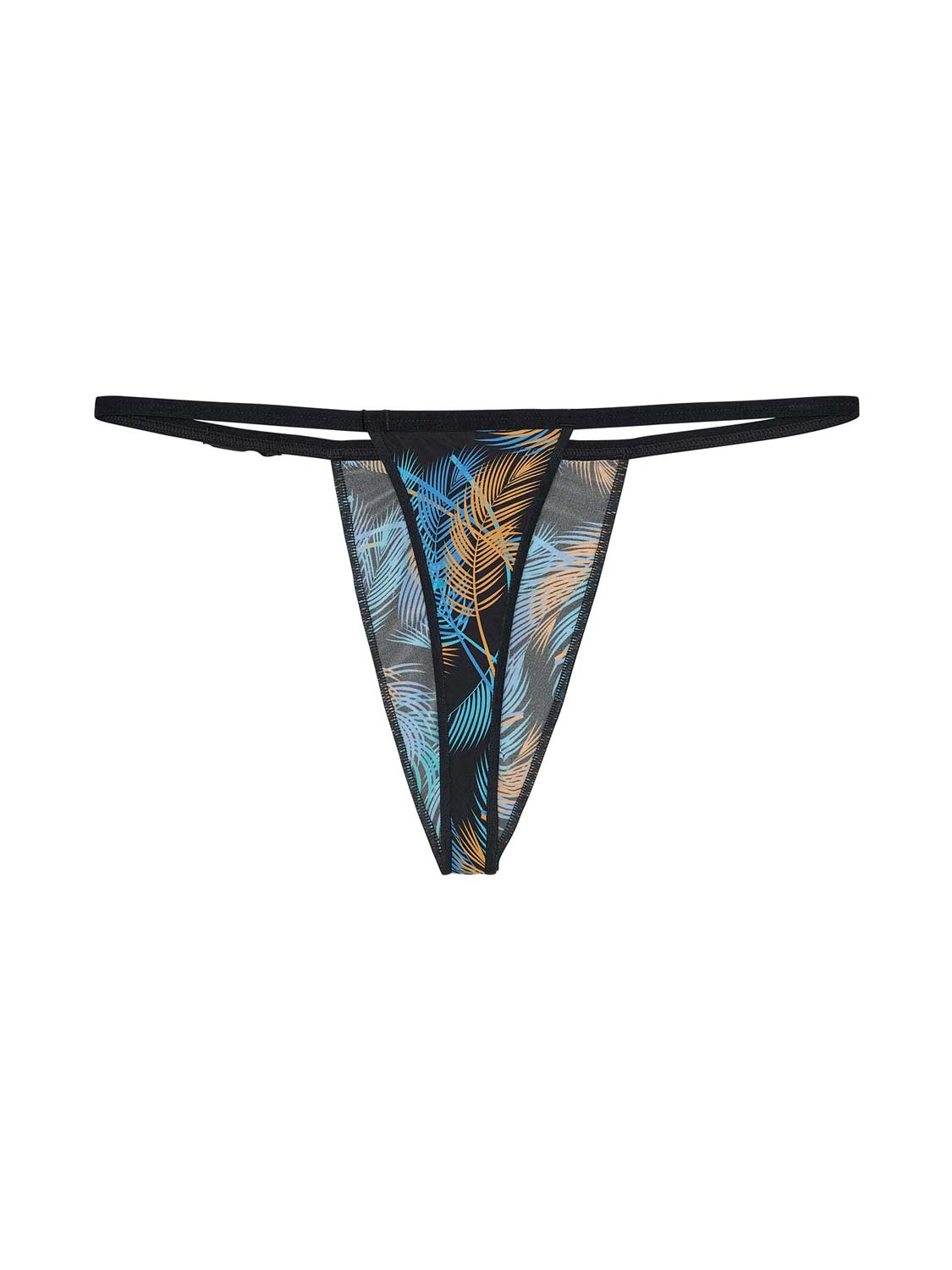 The Chico - G-string es una adición sensual a la colección HOM. Esta tanga está hecha del mismo tejido que la tanga Plumes regular, una poliamida semitransparente con un estampado divertido de plumas grandes en azul y naranja sobre un fondo negro.