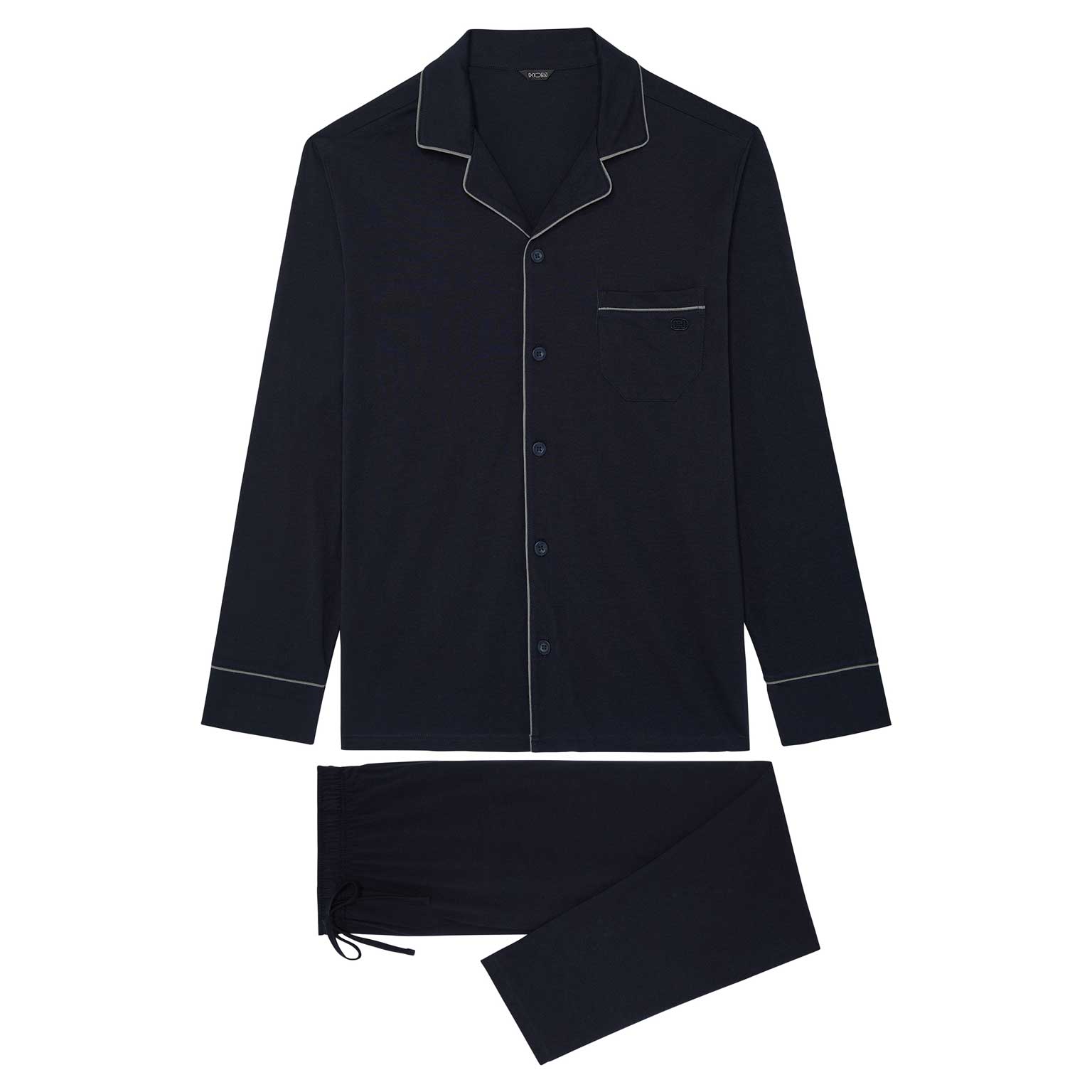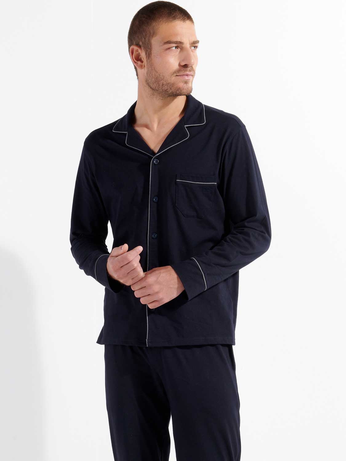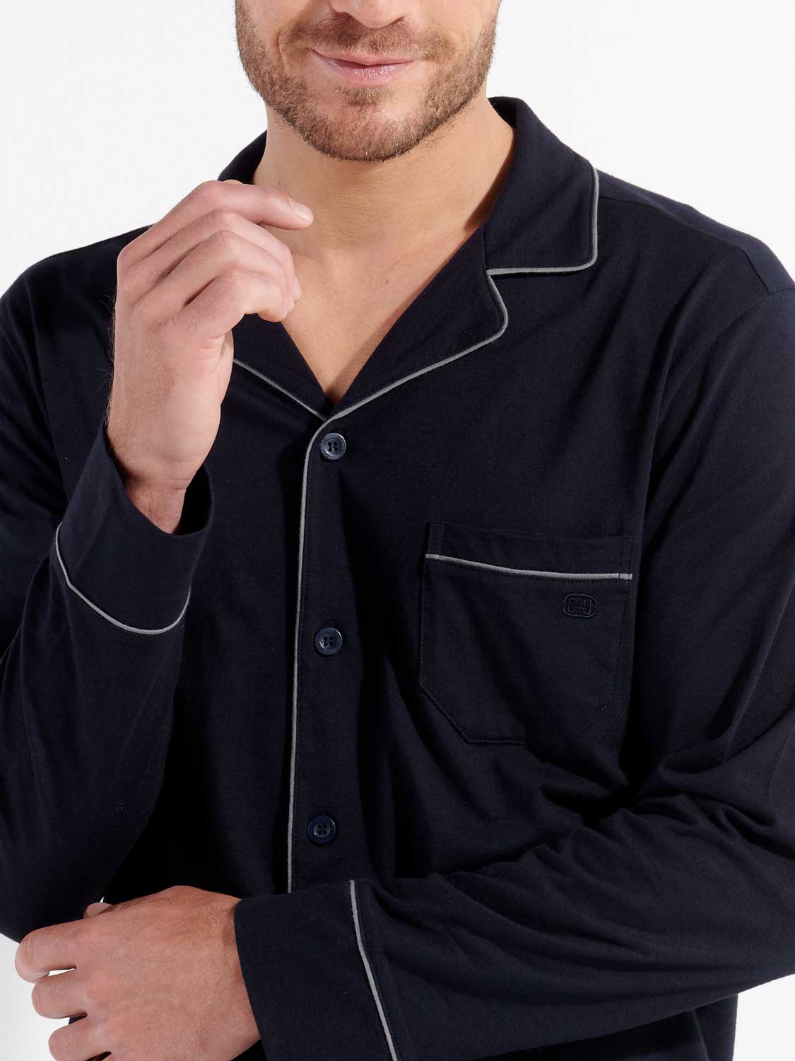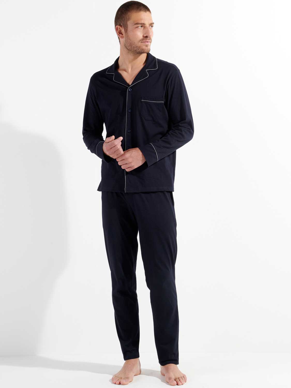 The Albert Long Sleepwear es un pijama clásico "de botones" con un toque moderno, hecho de algodón jersey 100%. El pijama cuenta con una camisa de manga larga con un bolsillo en el pecho en el lado izquierdo. Los pantalones largos vienen con un cordón para ajustarlos perfectamente al tamaño.