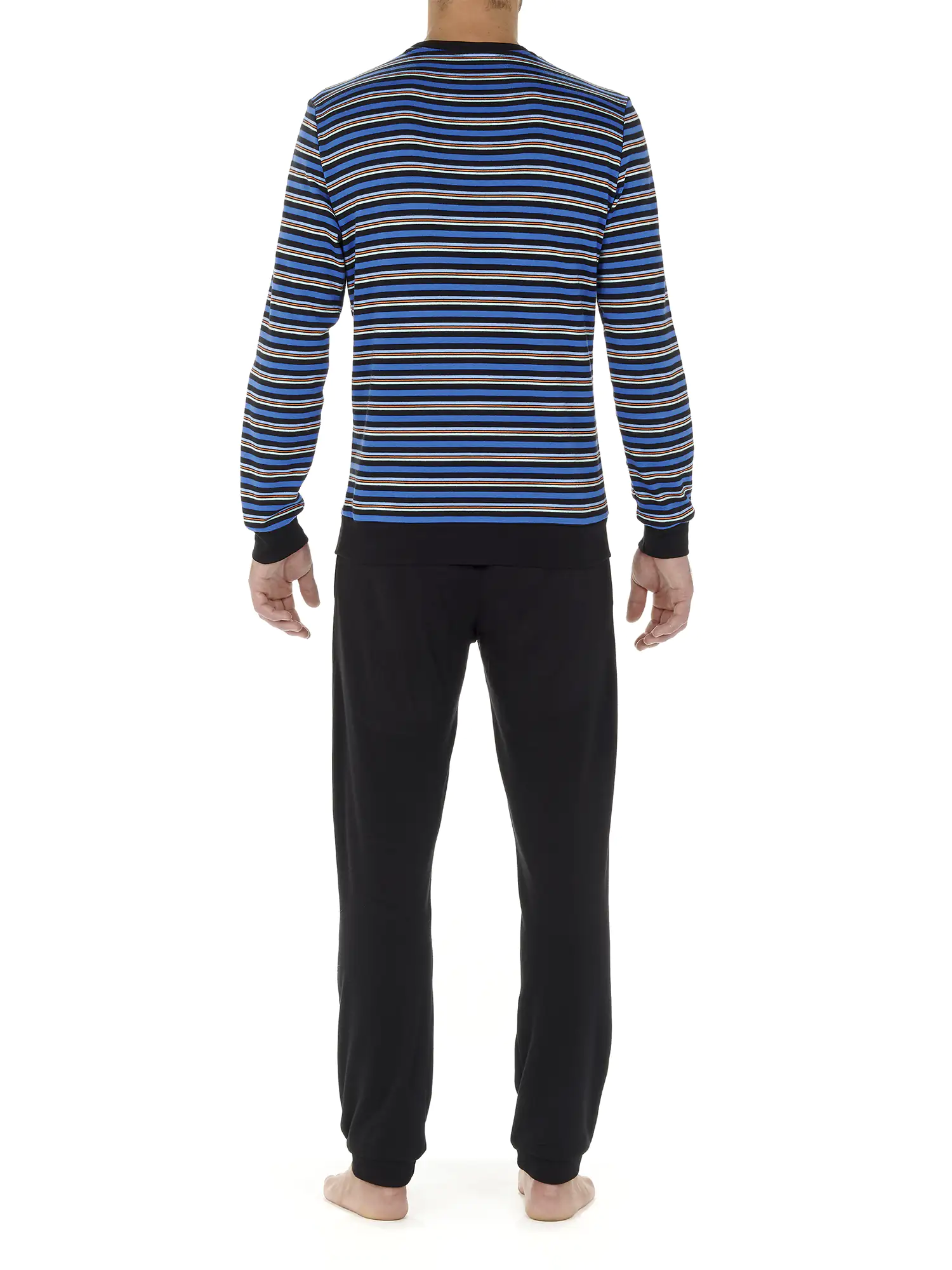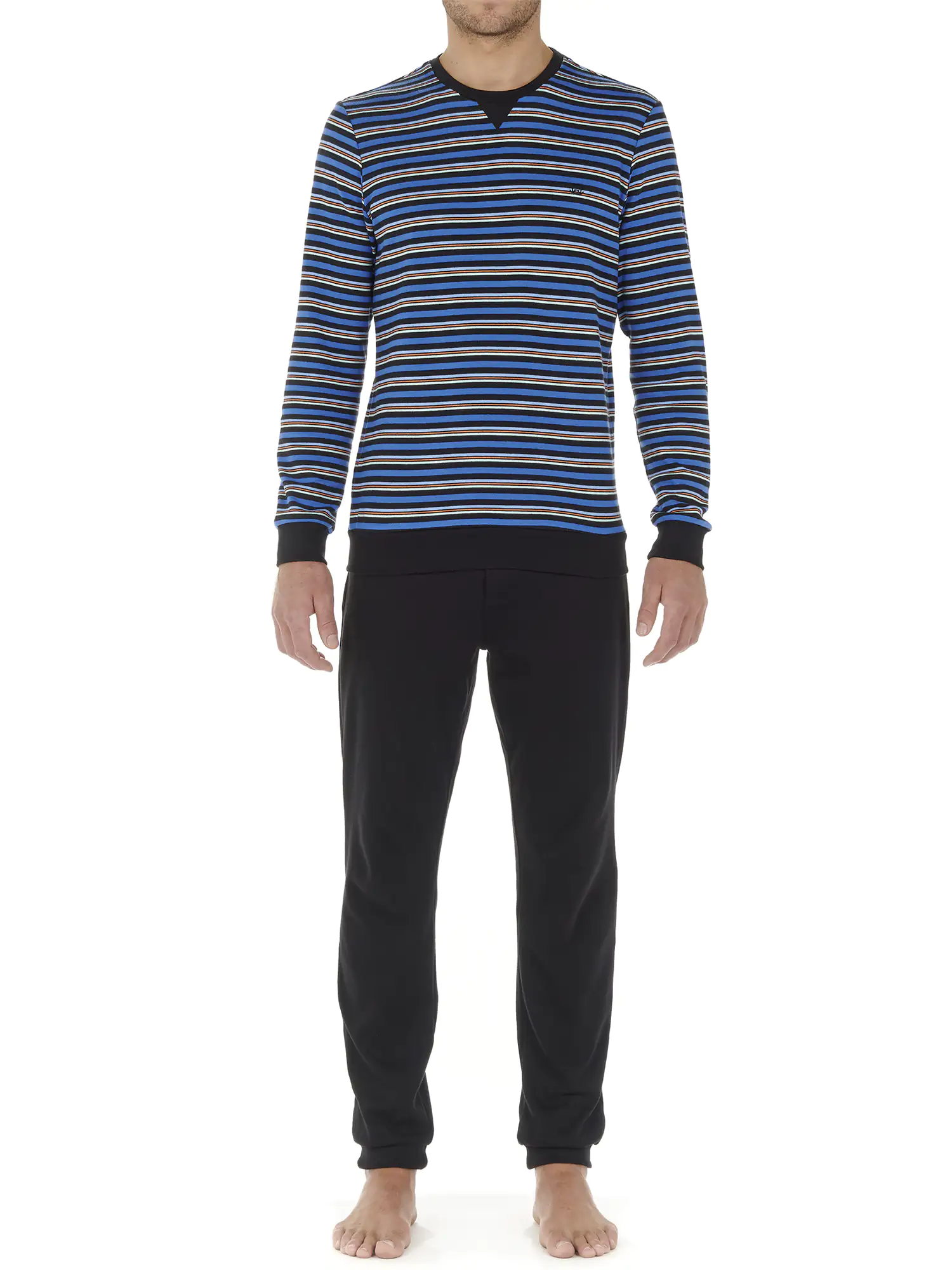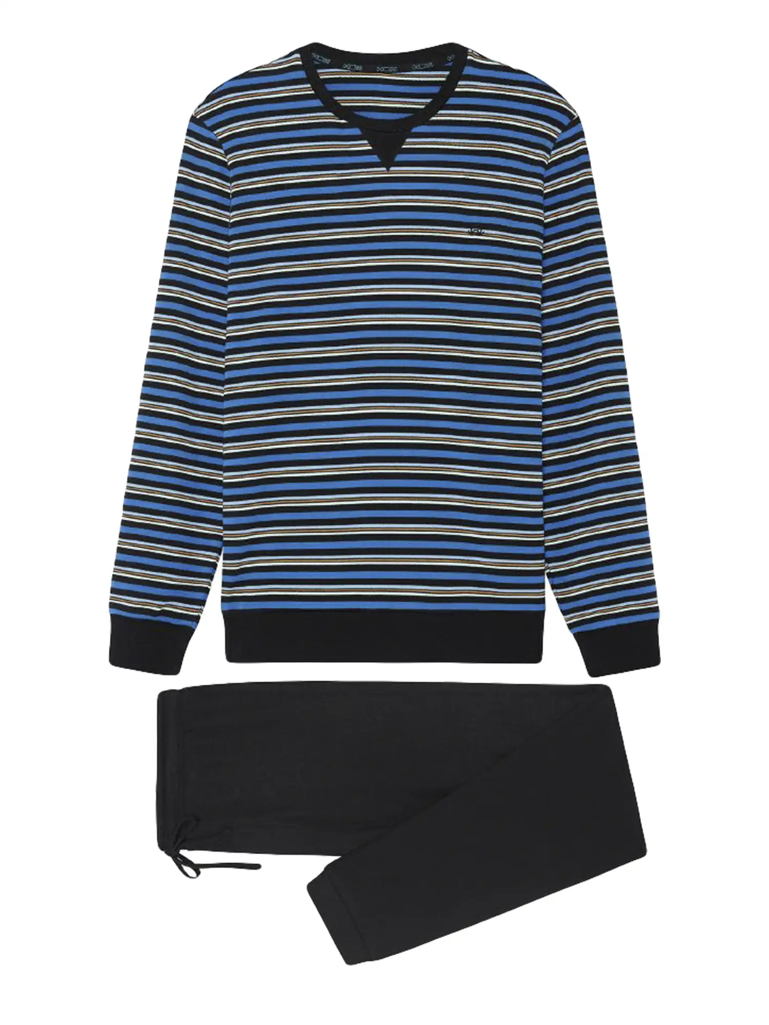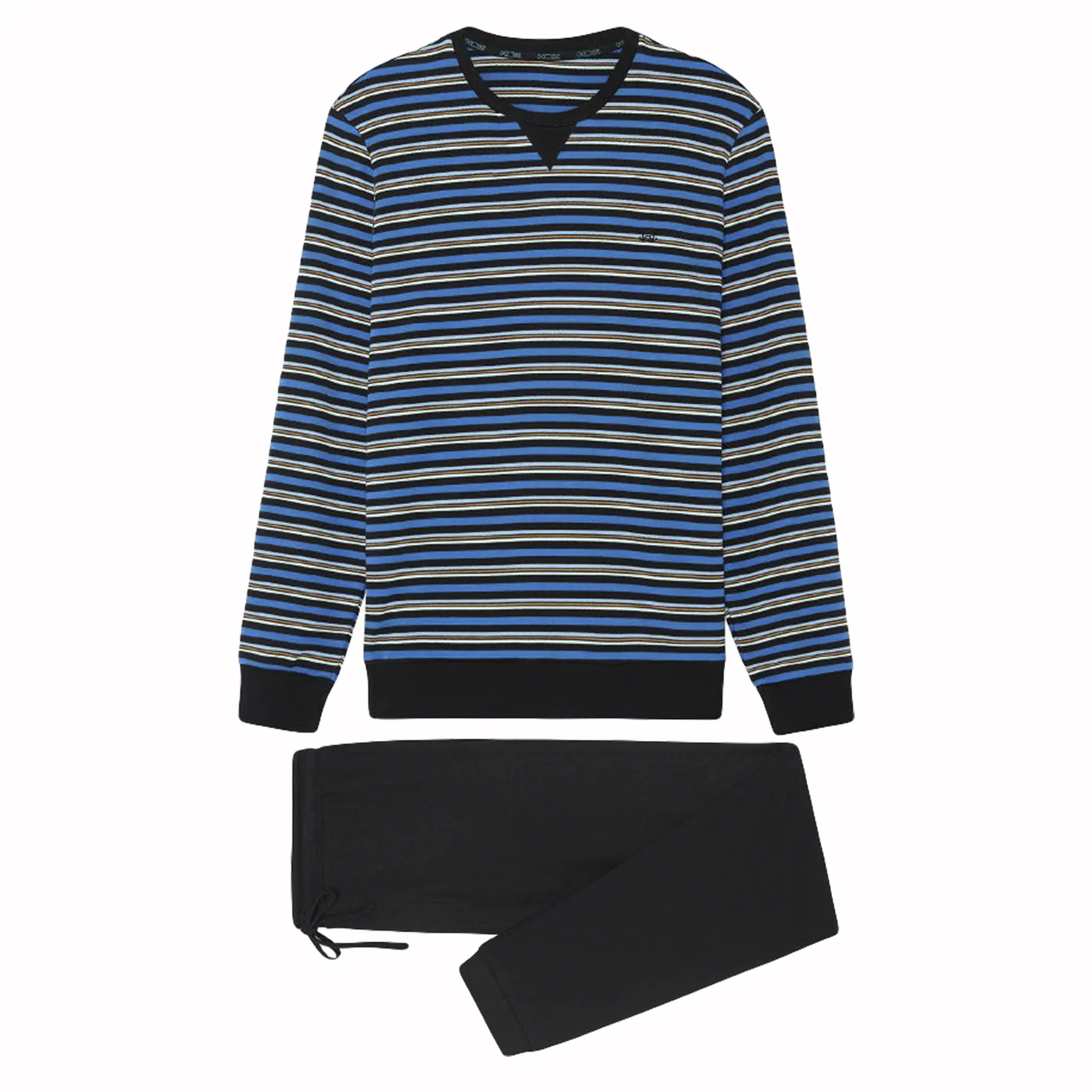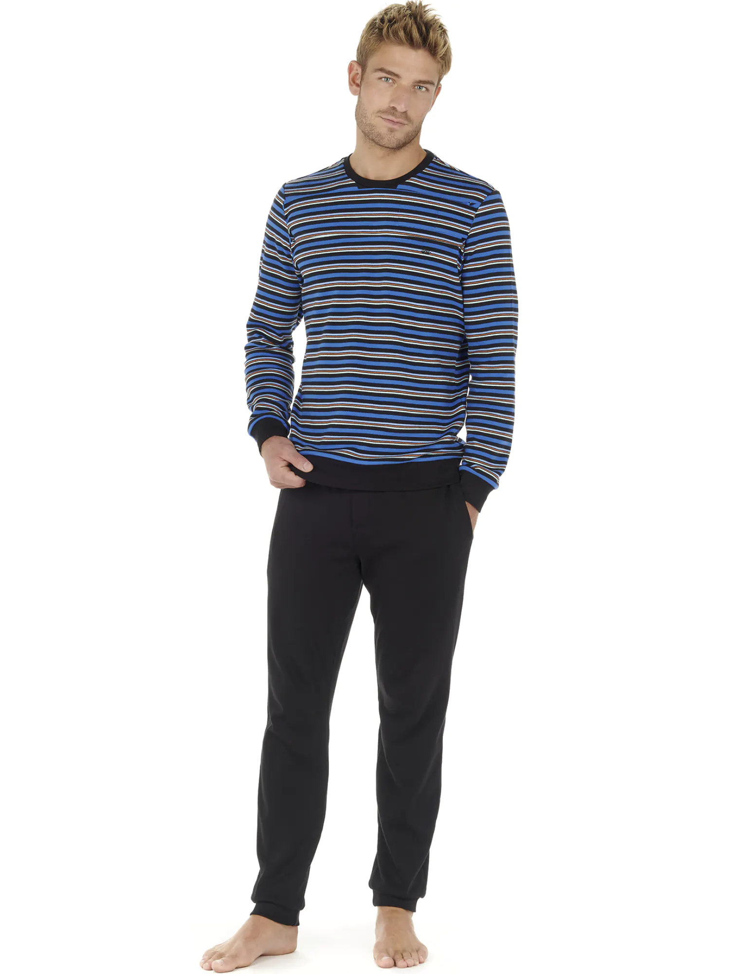 El pijama para hombre Don está hecho de 100% algodón y tejido en un patrón de interlock, lo que lo hace más grueso y resistente. La camiseta de manga larga presenta un cuello redondo. La camiseta tiene llamativas líneas horizontales. Los pantalones largos sólidos a juego tienen bolsillos laterales en los lados izquierdo y derecho. La cintura es elástica y tiene un cordón. Debido a que el pijama está hecho de algodón, es fácil de limpiar y transpirable. Perfecto para el hombre que le gusta usar telas naturales.