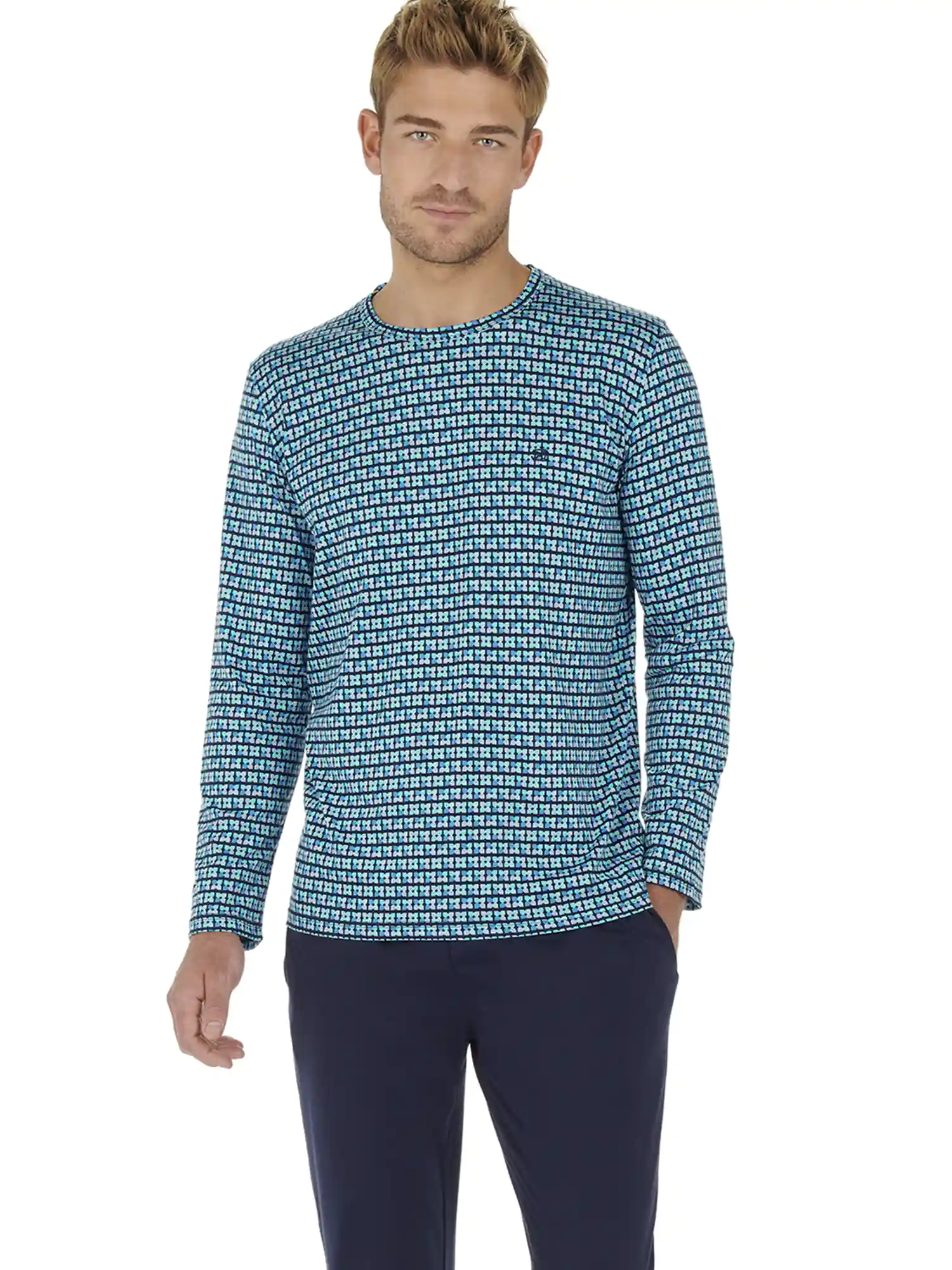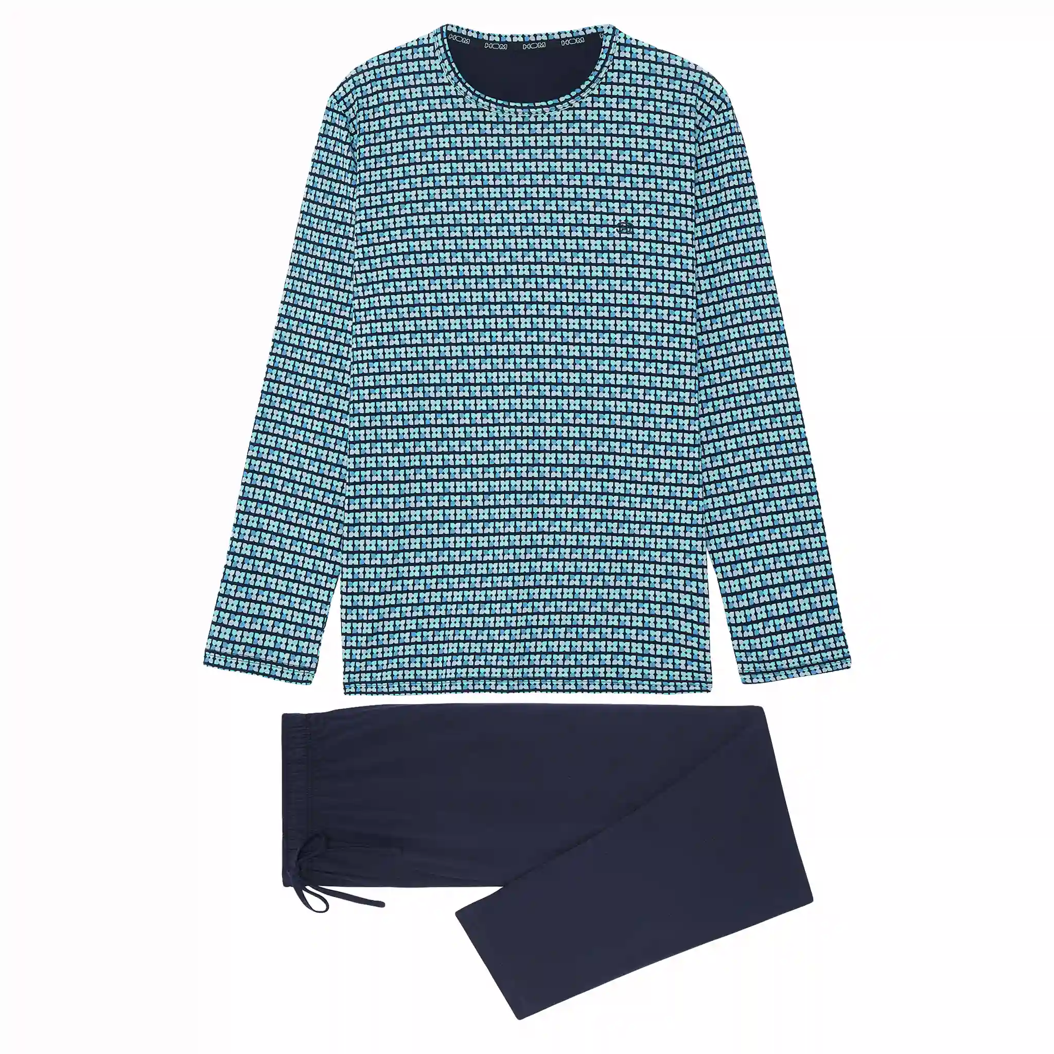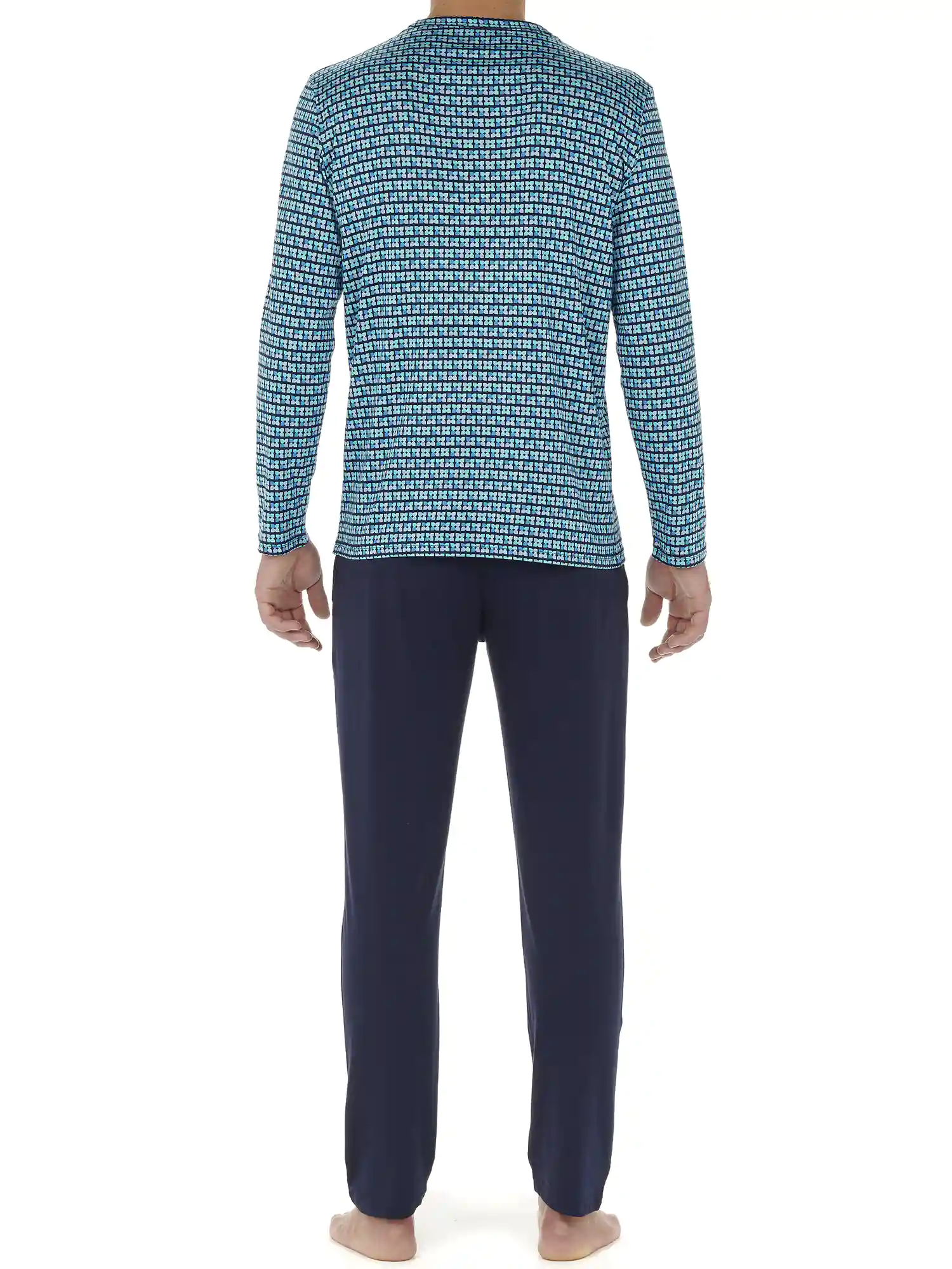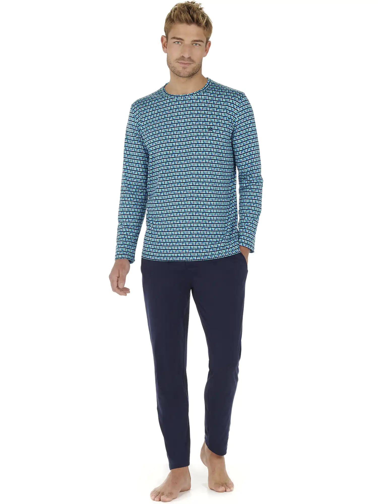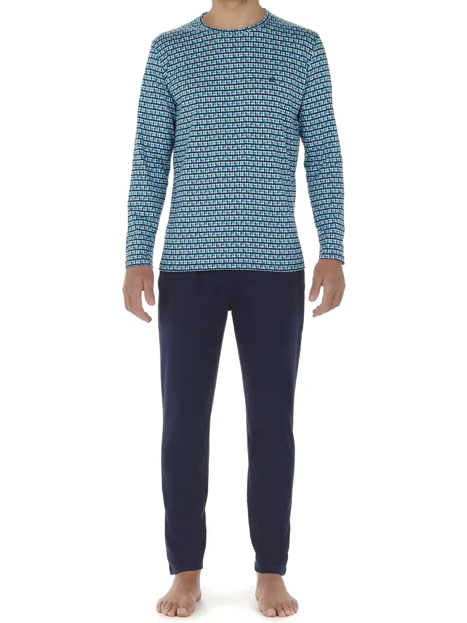 El pijama de hombre Andy está hecho de 100% algodón de jersey. La camiseta de manga larga presenta un cuello redondo y una apertura clásica. La camiseta tiene un estampado de óvalos en tonos verde claro sobre un fondo azul marino. Los pantalones largos en negro sólido tienen bolsillos laterales en las costuras a ambos lados. La cintura es elástica y tiene un cordón. Debido a que el pijama está hecho de algodón, es fácil de limpiar y transpirable. Perfecto para el hombre que le gusta usar telas naturales.