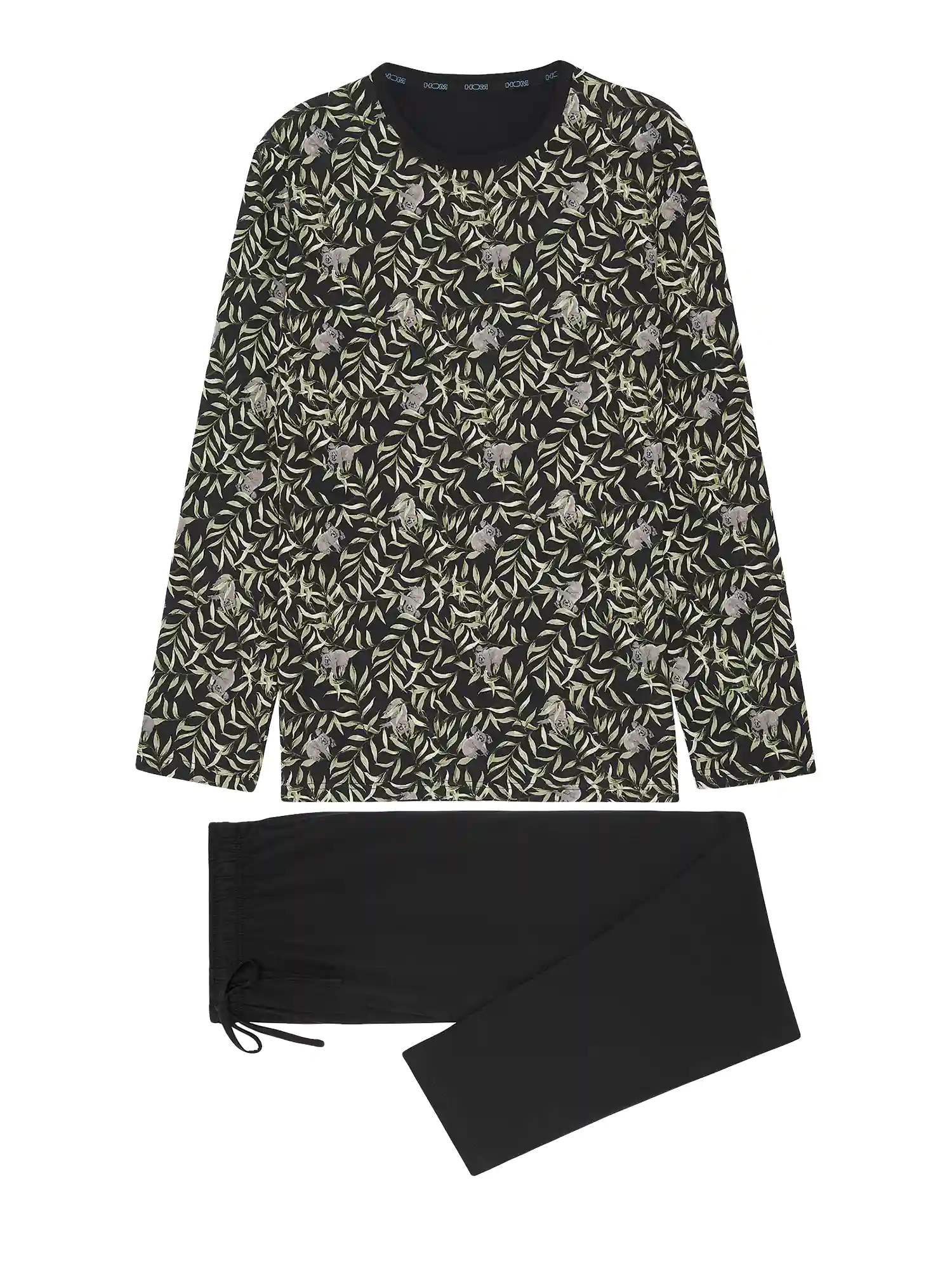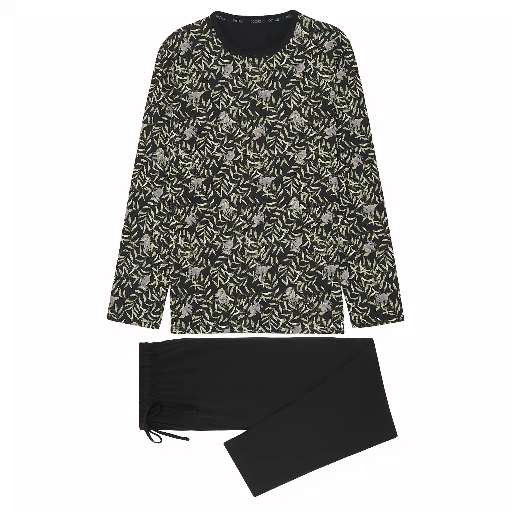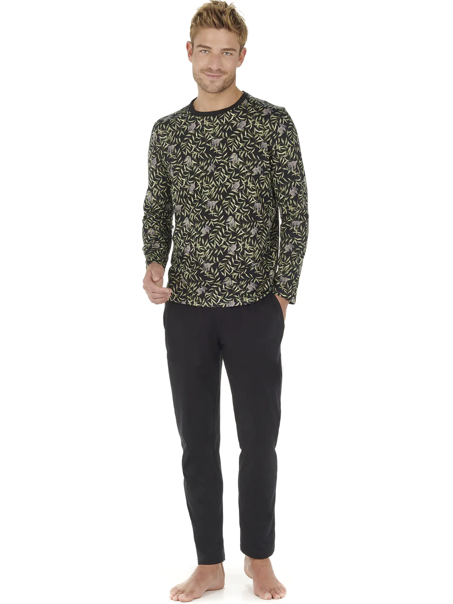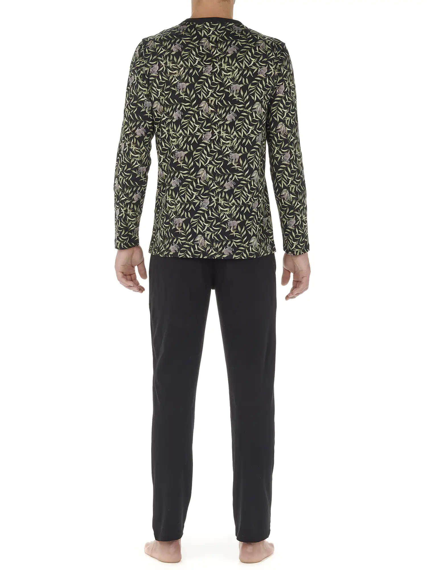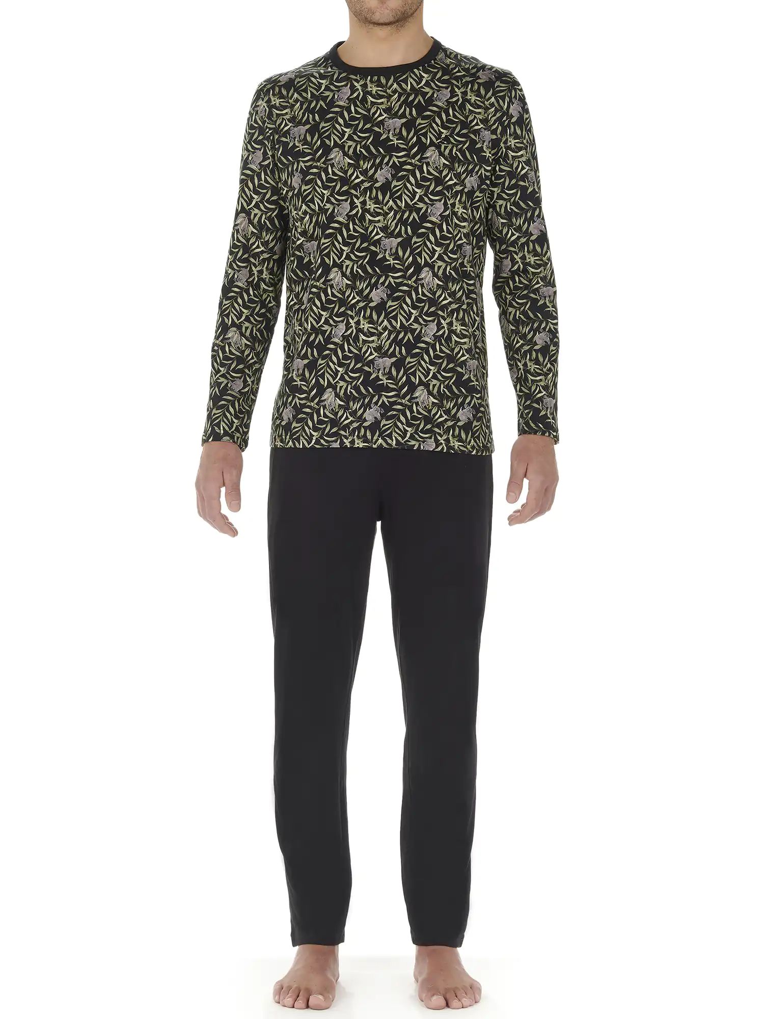 El pijama para hombre Teden está hecho de 100% algodón jersey. La camiseta de manga larga presenta un cuello redondo. La camiseta tiene un llamativo estampado animal con koalas escondidos entre las hojas sobre un fondo negro. Los pantalones largos negros a juego tienen bolsillos laterales en los lados izquierdo y derecho. La cintura es elástica y tiene un cordón. Debido a que el pijama está hecho de algodón, es fácil de limpiar y transpirable. Perfecto para el hombre que le gusta usar telas naturales.