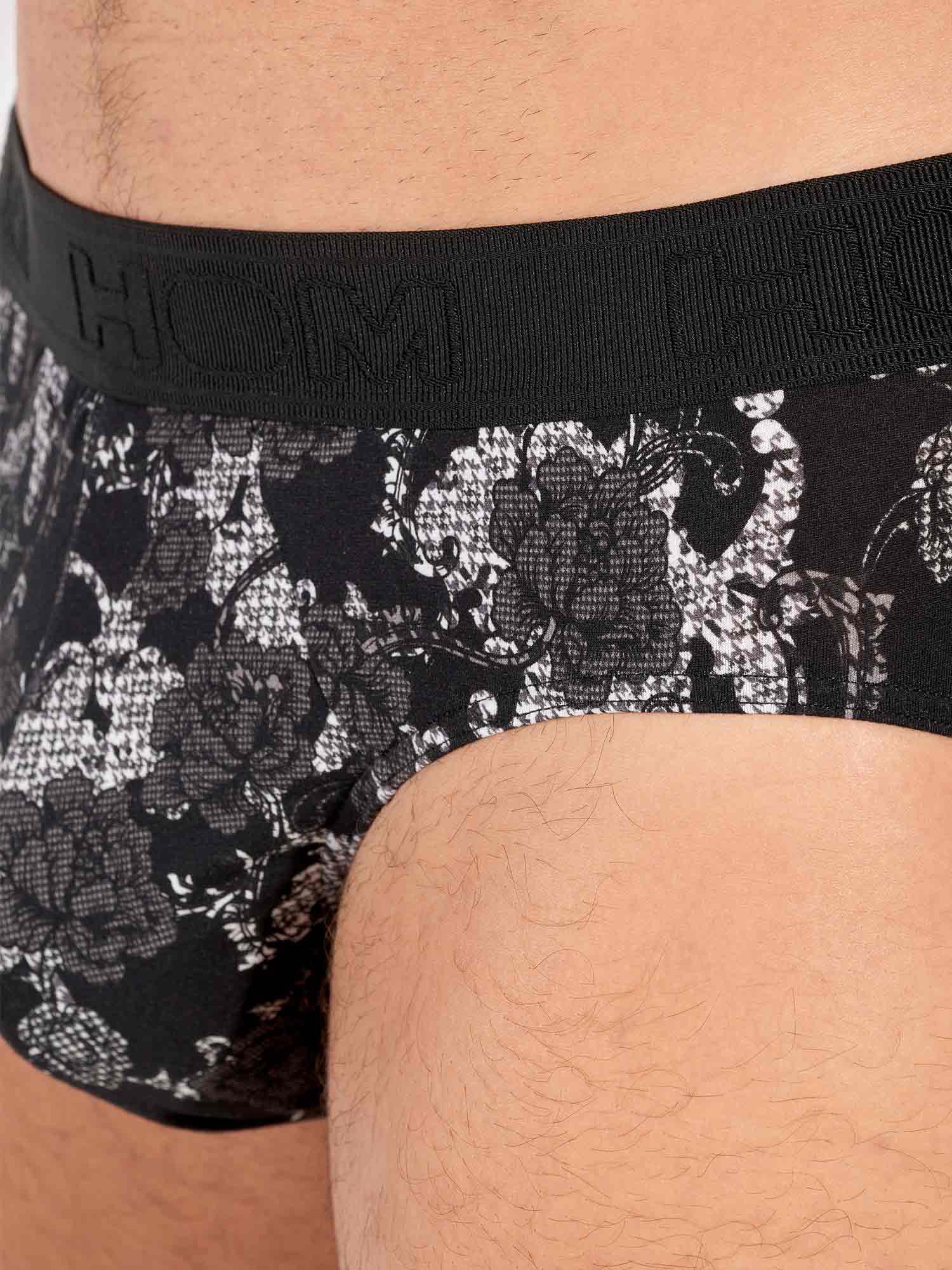 Fairmont – mini briefs de HOM combinan sofisticación con una comodidad excepcional. La lujosa mezcla de algodón y modal se siente suave y permite una excelente transpiración. El elegante tejido jacquard presenta un sutil motivo floral sobre un diseño gráfico de pata de gallo en negro y gris. Gracias a los bordes elásticos, se adaptan perfectamente al cuerpo, mientras que la bolsa forrada con elástico garantiza un ajuste firme y cómodo. Para el hombre moderno que valora los detalles.