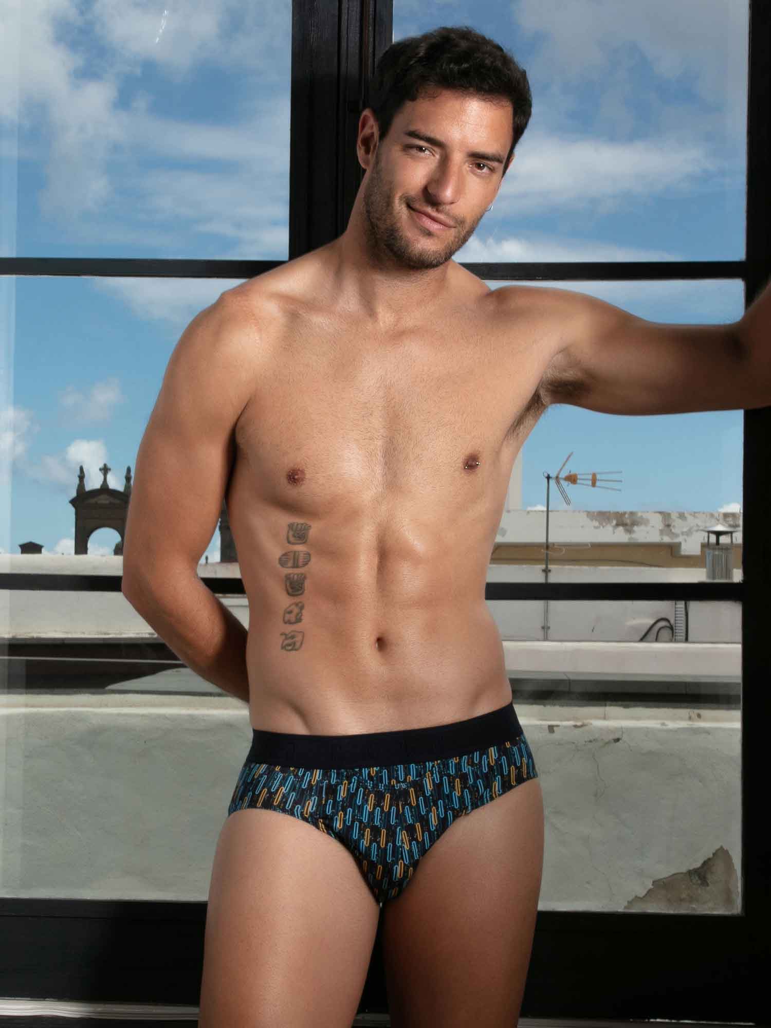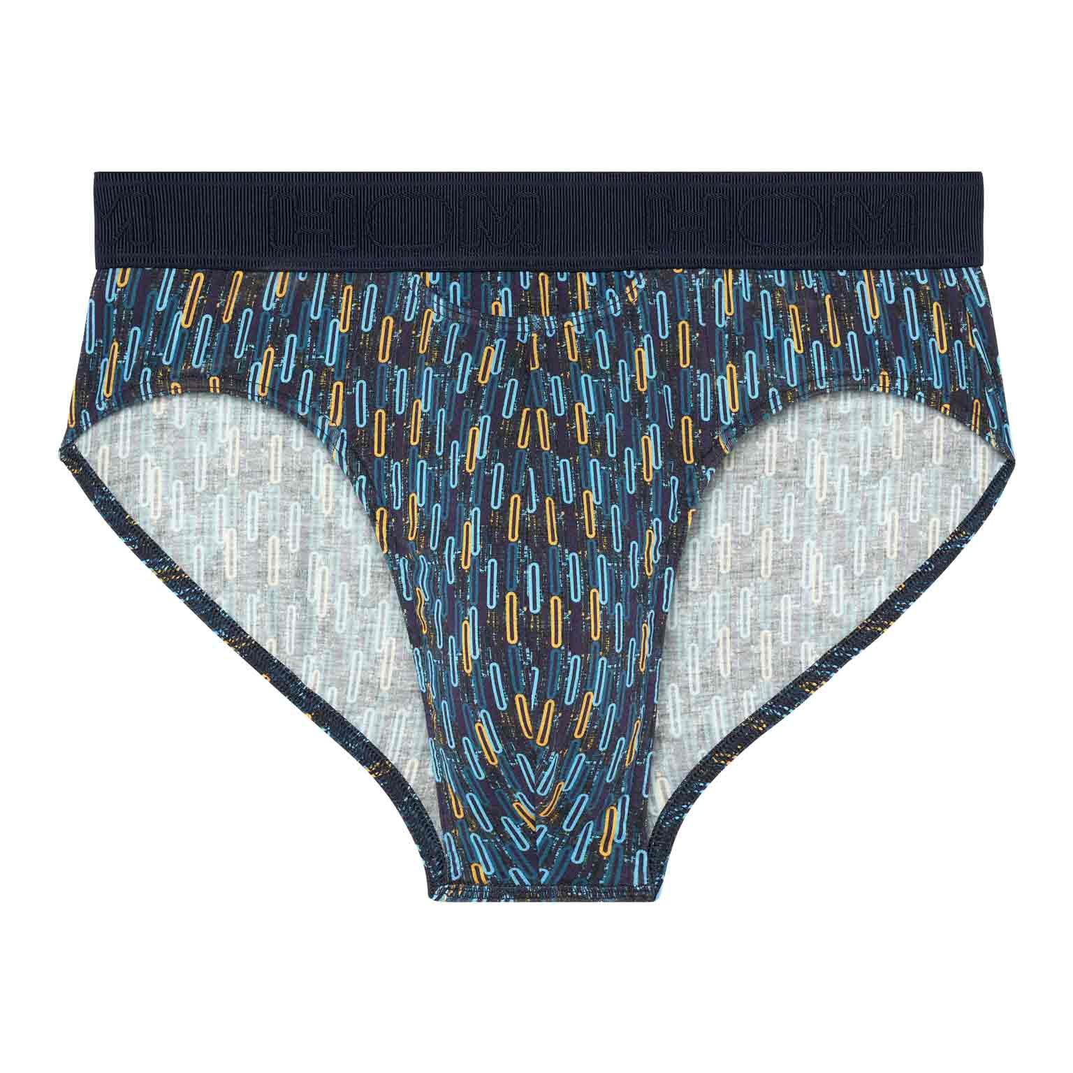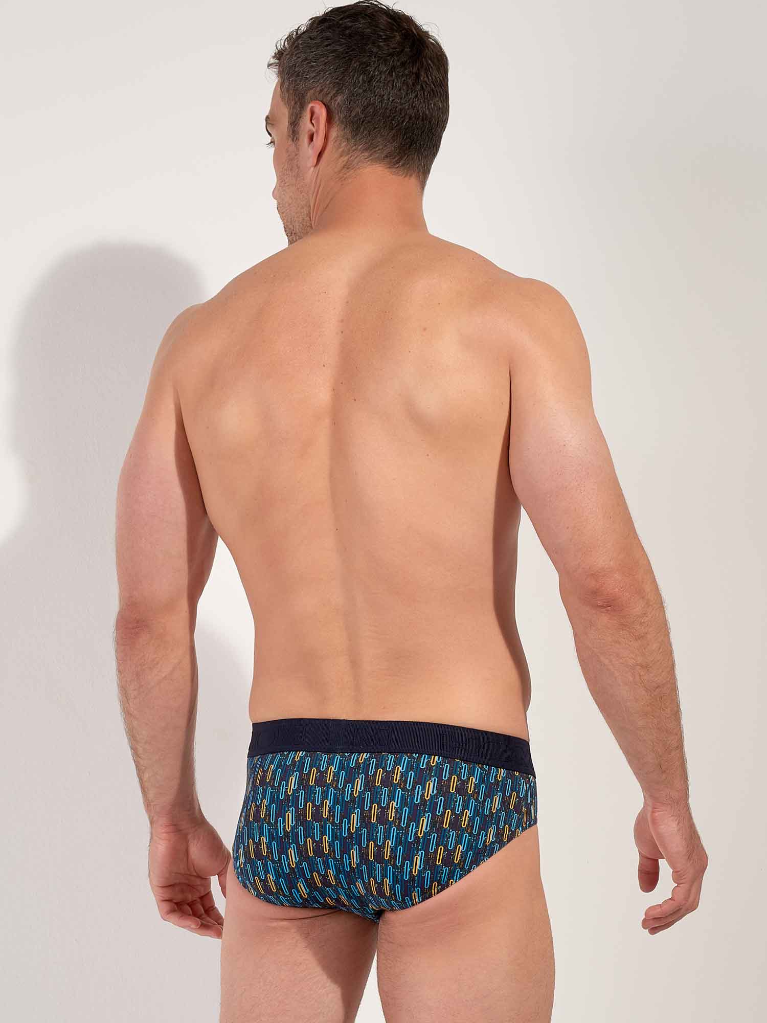 Los HOM Westgate mini briefs HO1 ofrecen una silueta limpia y ajustada con la misma energía retro. Los motivos ovalados en azul y amarillo, sobre un fondo navy, evocan el dinamismo del arte geométrico de los años 50, inspirado en la audacia visual de Las Vegas. La mezcla premium de algodón, modal y elastano se siente excepcionalmente suave y flexible, y mantiene su durabilidad para el día a día. La apertura HO1 patentada, también conocida como fly horizontal, aporta confort ergonómico y un acceso fácil tanto para diestros como para zurdos. Un refuerzo elástico discreto en la parte frontal asegura un ajuste natural y preciso, mientras que el ligero detalle voile en la pierna mantiene las líneas impecables y refinadas bajo la ropa. Un esencial con confianza y el inconfundible estilo HOM.
