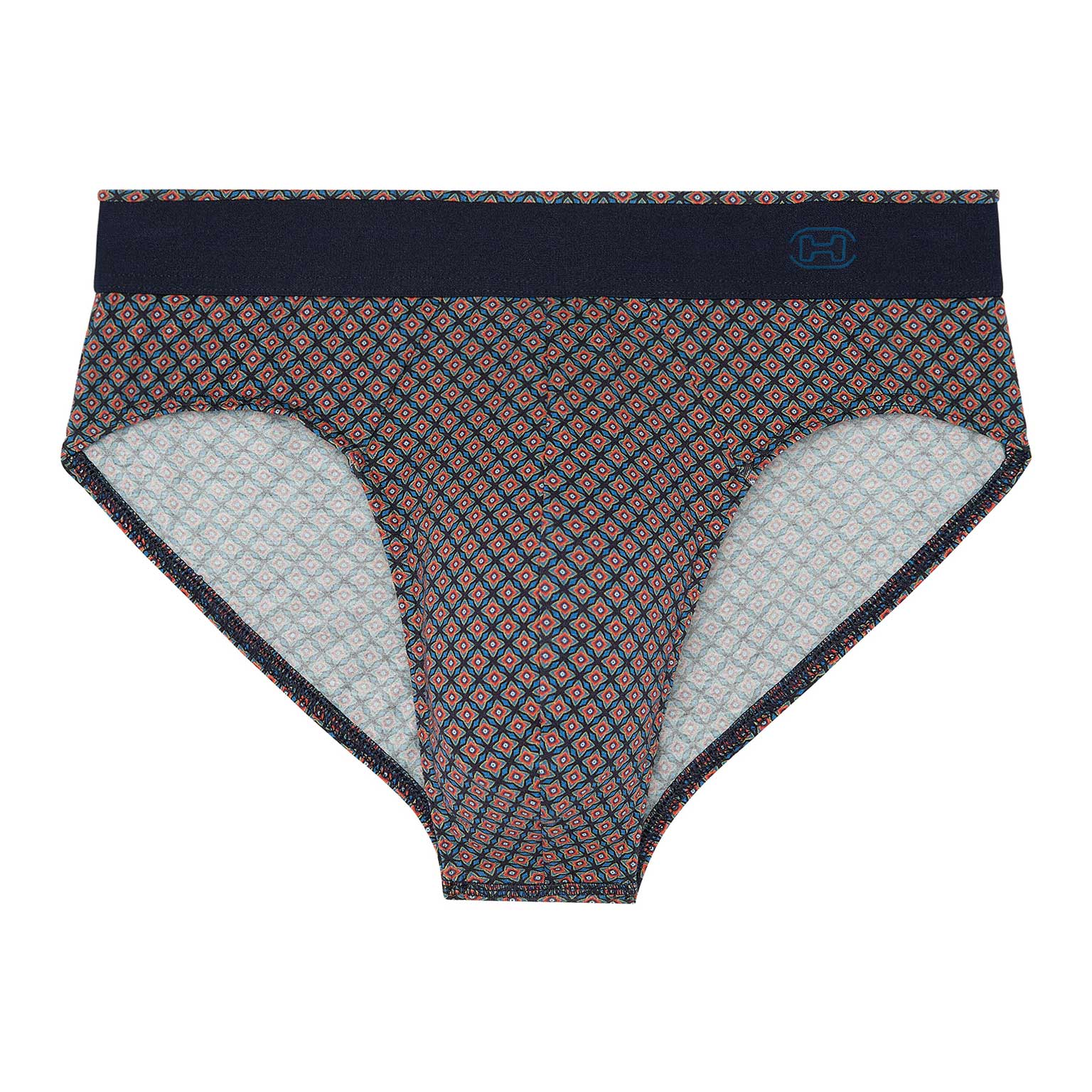 The Jordan - Comfort Mini Briefs están hechos de algodón-modal de alta calidad, una tela natural que se siente maravillosamente suave. Estos slips para hombre cuentan con un llamativo estampado con un patrón de cuadros en tonos cálidos sobre un fondo azul marino. Los slips para hombre están diseñados con una pretina de comodidad, donde la tela se tira sobre la pretina elástica para mayor comodidad y un look moderno. La banda es de color azul marino sólido con el logo de HOM bordado en la parte delantera izquierda.
