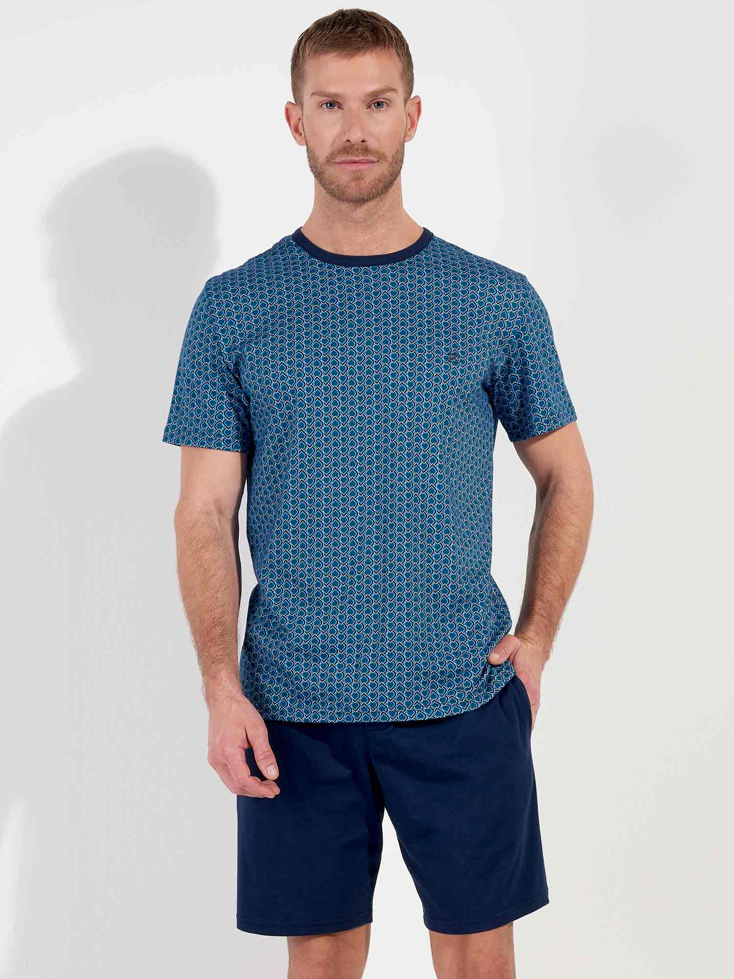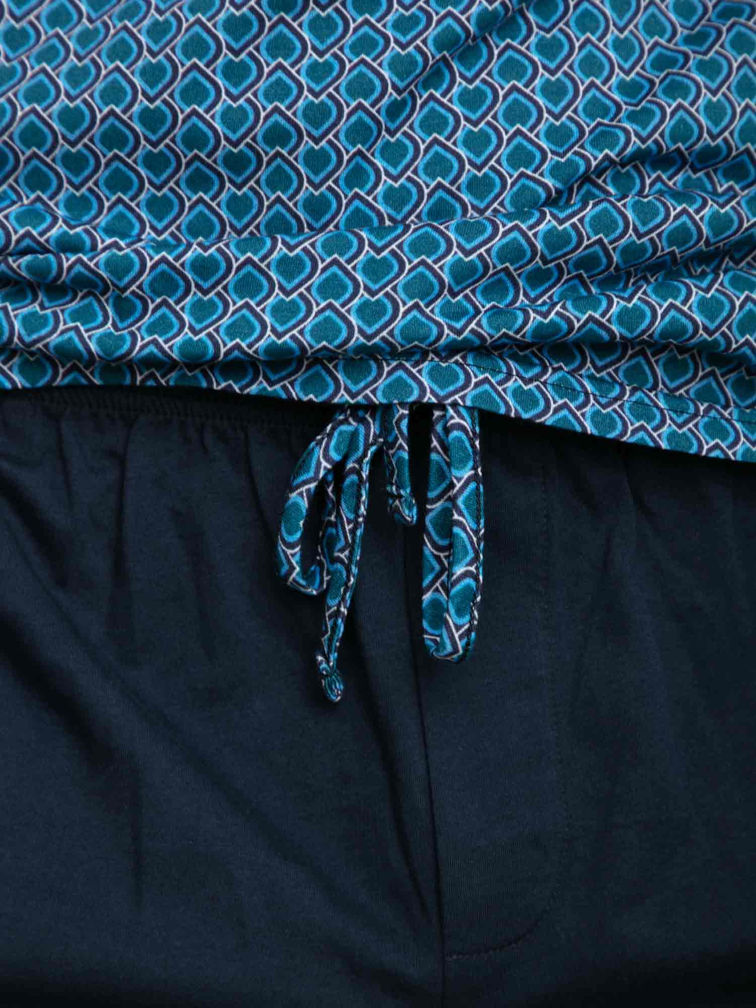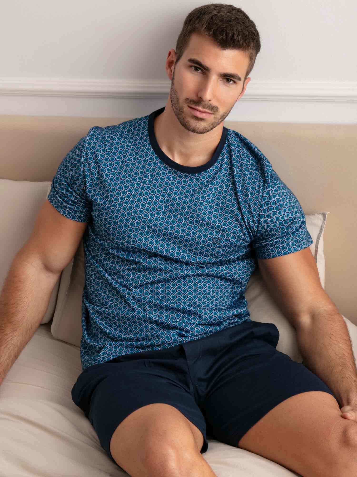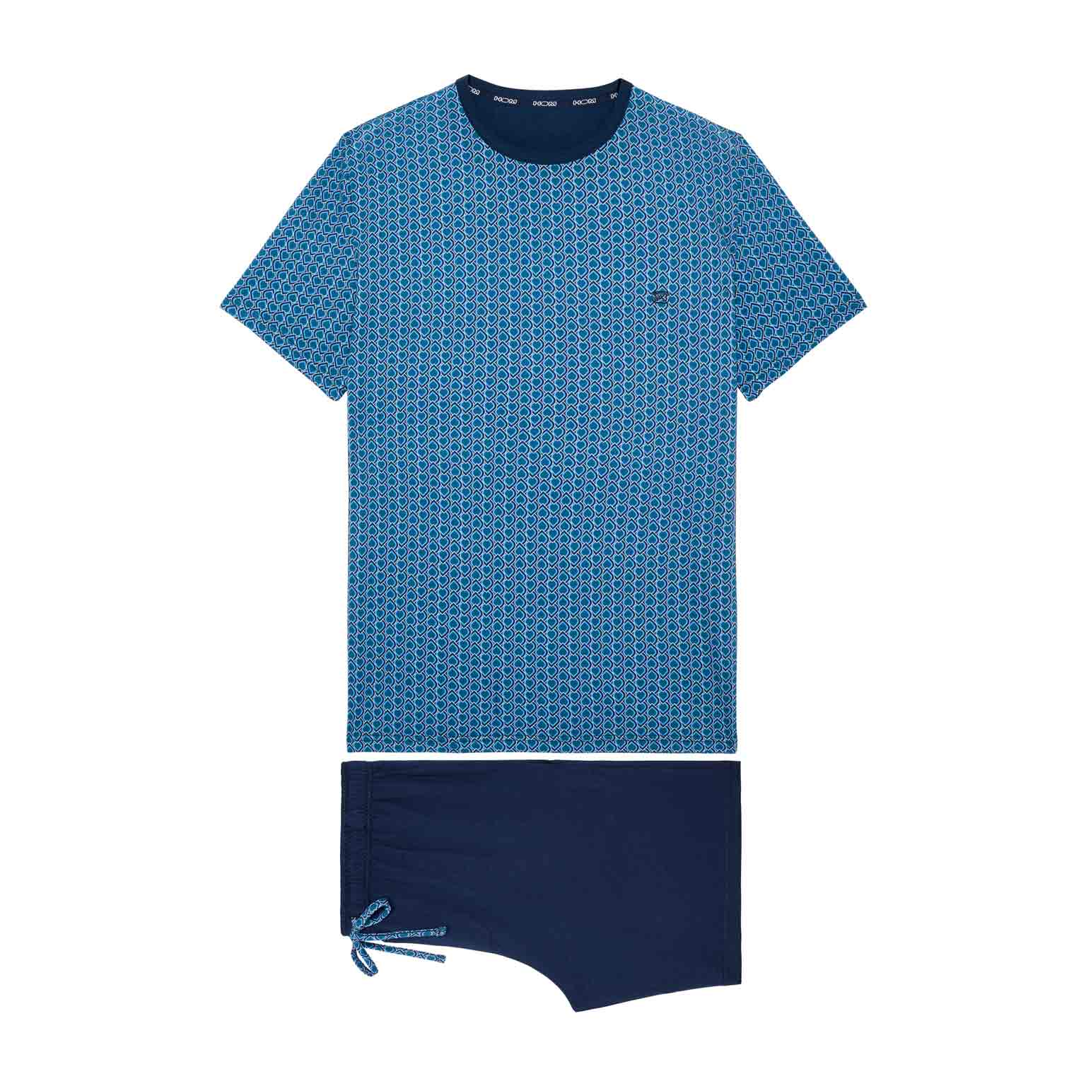 Con su estampado gráfico y elegante combinación de colores, el shortama Martinez de HOM es una opción sofisticada para noches cálidas o mañanas relajadas. La camiseta de manga corta luce un diseño Art Decó azul con sutiles referencias a ornamentos egipcios. El pantalón corto azul marino cuenta con bolsillos laterales y una cintura elástica con cordón estampado a juego. Fabricado en 100% algodón, este conjunto ofrece suavidad y confort duradero. Clase atemporal con un corte moderno.