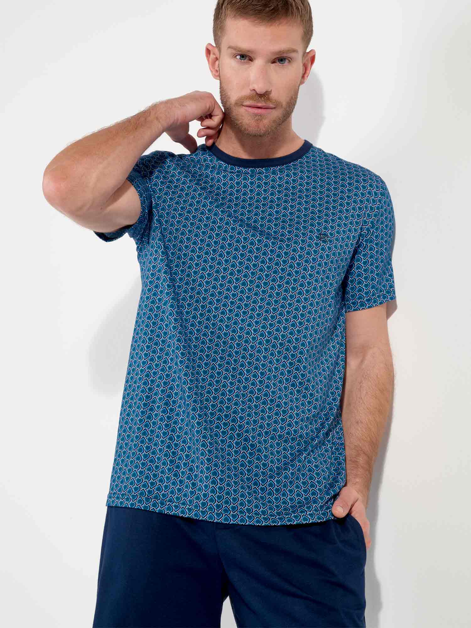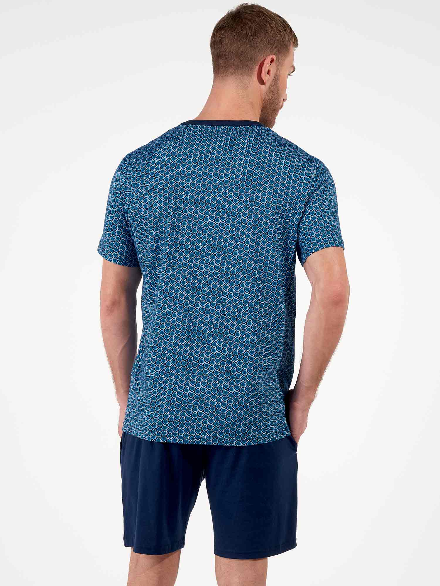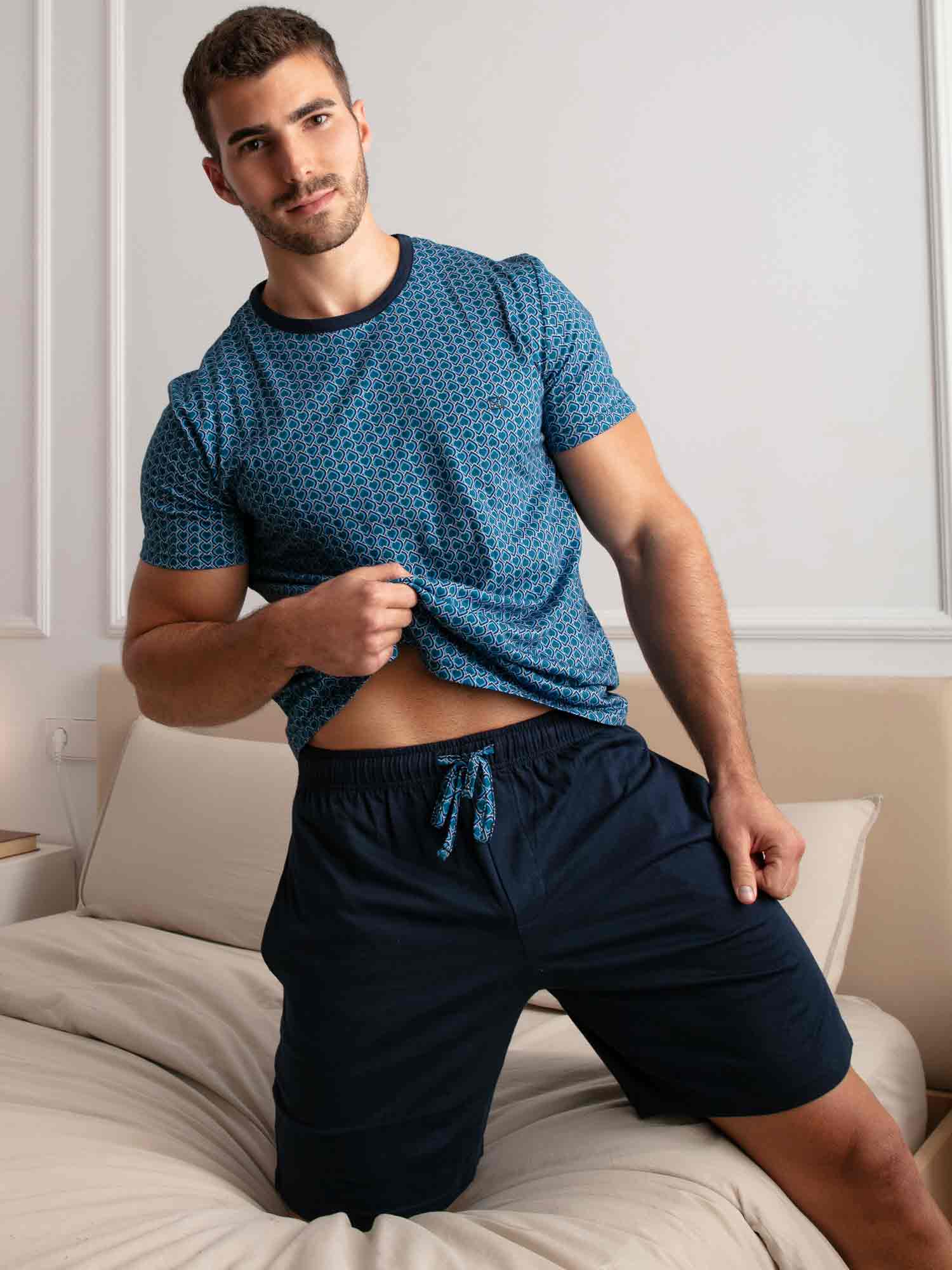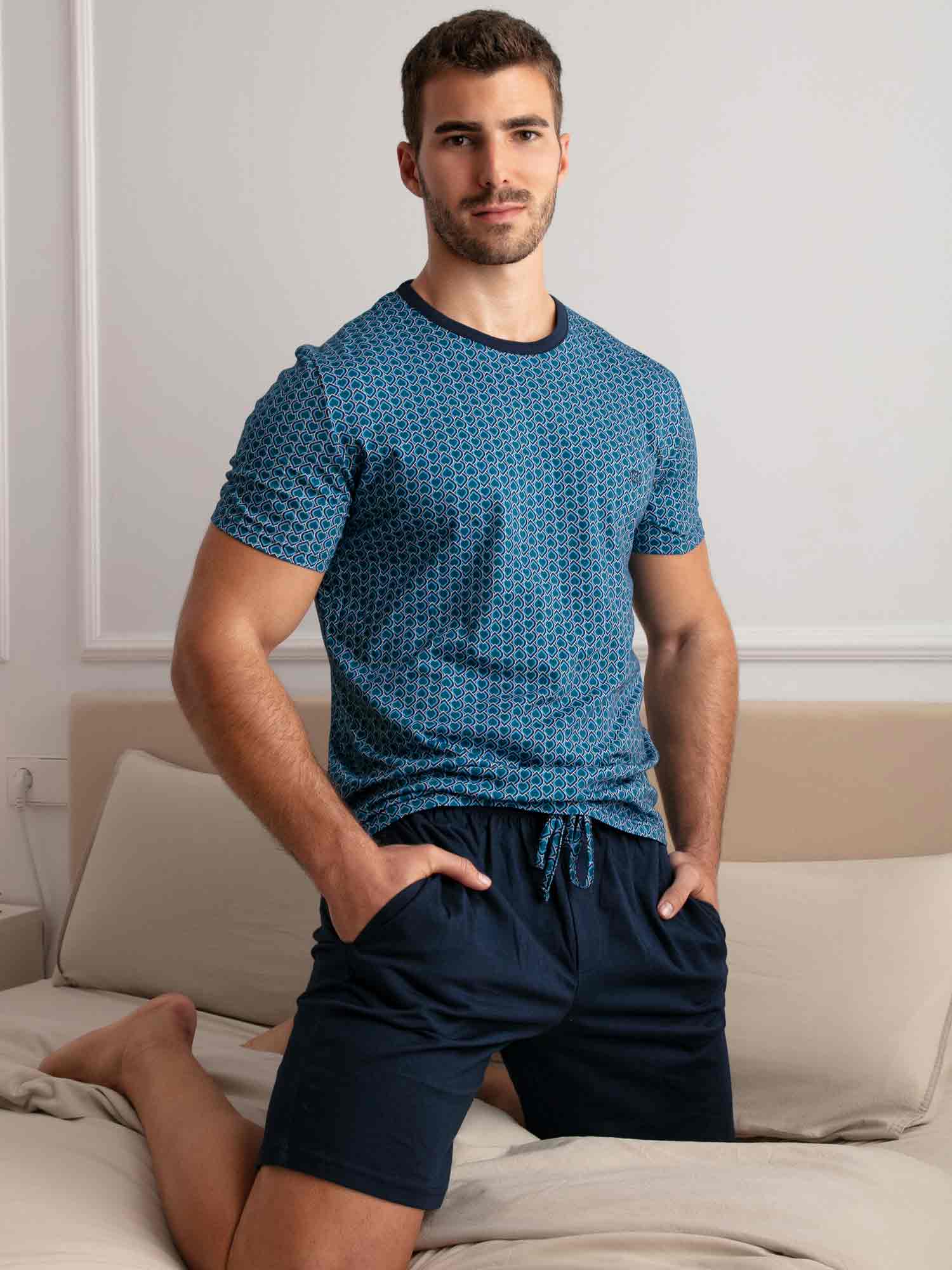 Con su estampado gráfico y elegante combinación de colores, el shortama Martinez de HOM es una opción sofisticada para noches cálidas o mañanas relajadas. La camiseta de manga corta luce un diseño Art Decó azul con sutiles referencias a ornamentos egipcios. El pantalón corto azul marino cuenta con bolsillos laterales y una cintura elástica con cordón estampado a juego. Fabricado en 100% algodón, este conjunto ofrece suavidad y confort duradero. Clase atemporal con un corte moderno.
