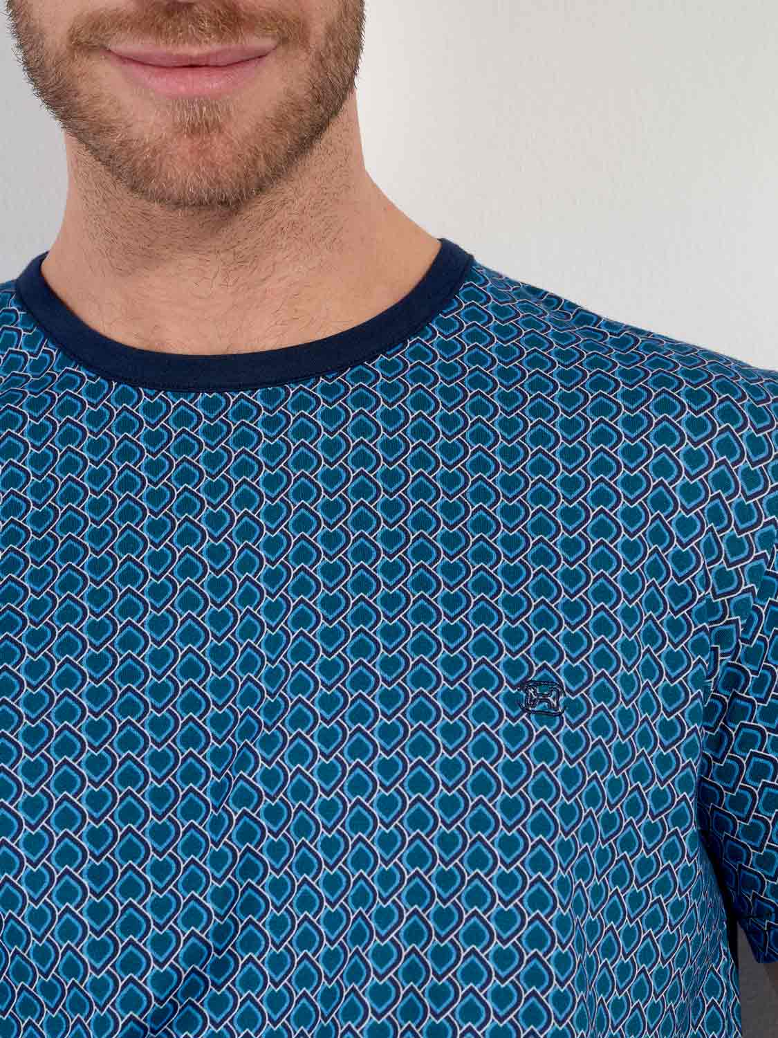 - Estampado geométrico en tonos azul y turquesa