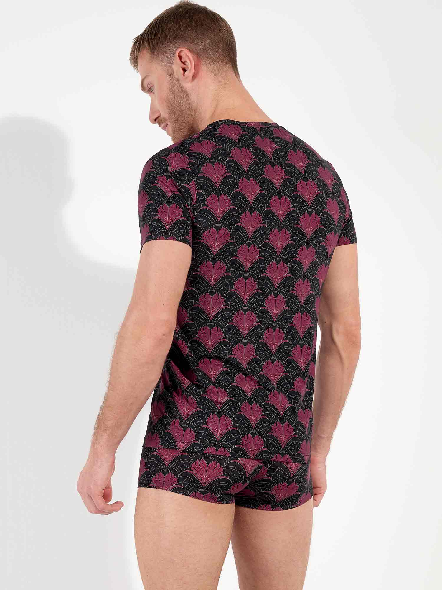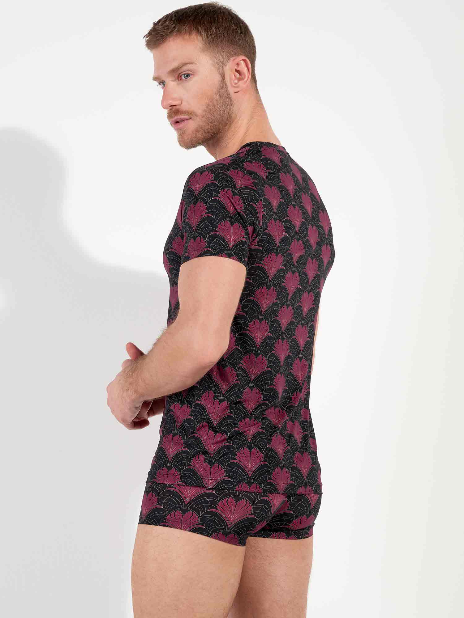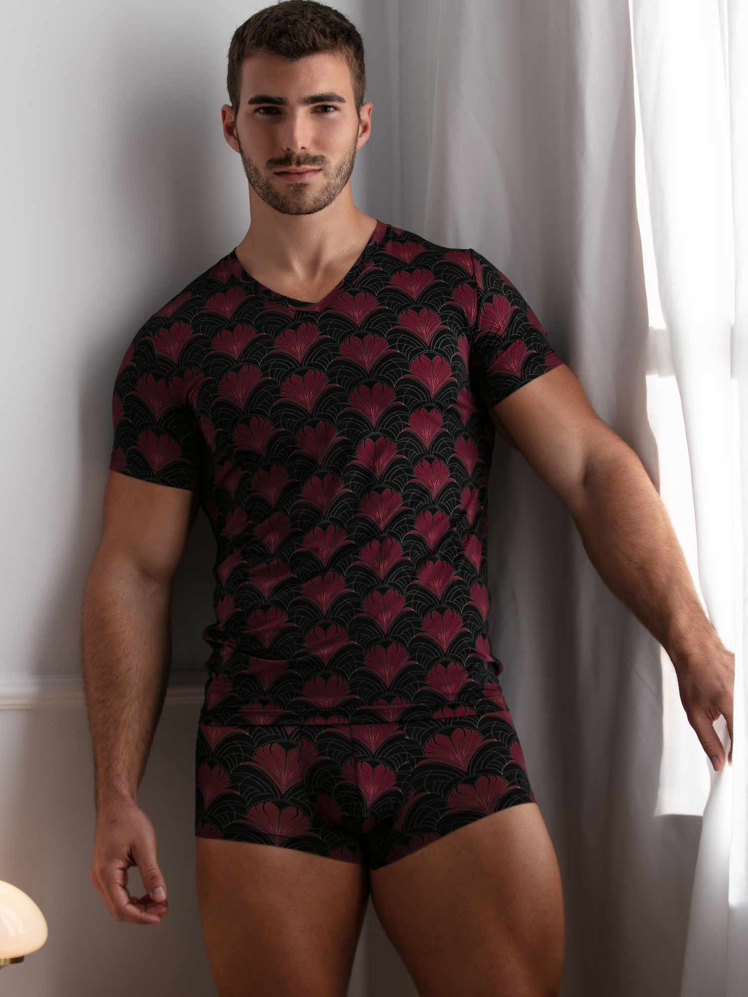 La camiseta Carlyle es más que una prenda básica para estar en casa: es una declaración de estilo y sofisticación. El lujoso patrón Art Deco en burdeos y dorado resalta maravillosamente sobre el fondo negro intenso. La microfibra suave y transpirable se siente como una segunda piel y se adapta a todos tus movimientos. Con un elegante cuello en V, esta camiseta se puede combinar con el trunk a juego para un conjunto completo.