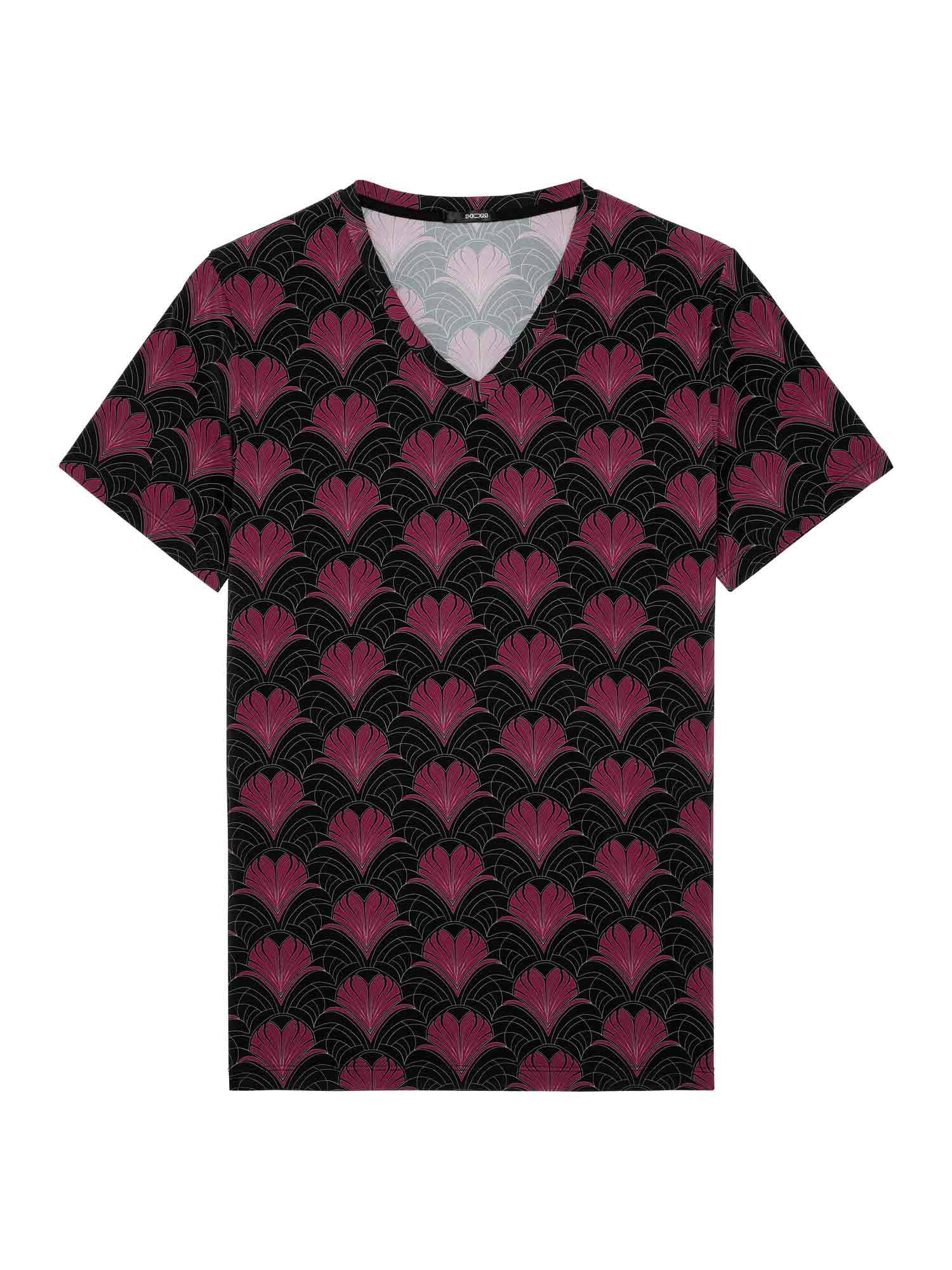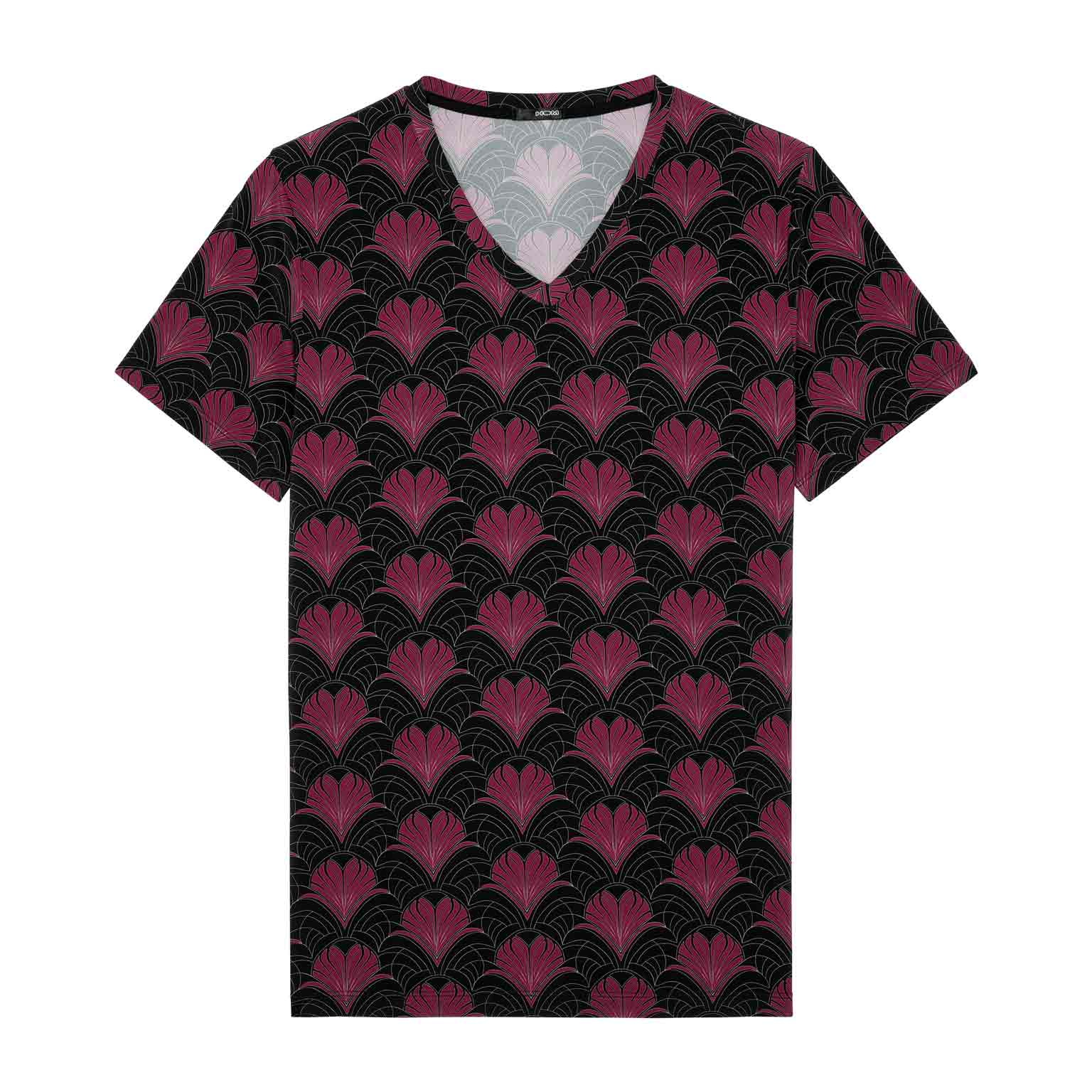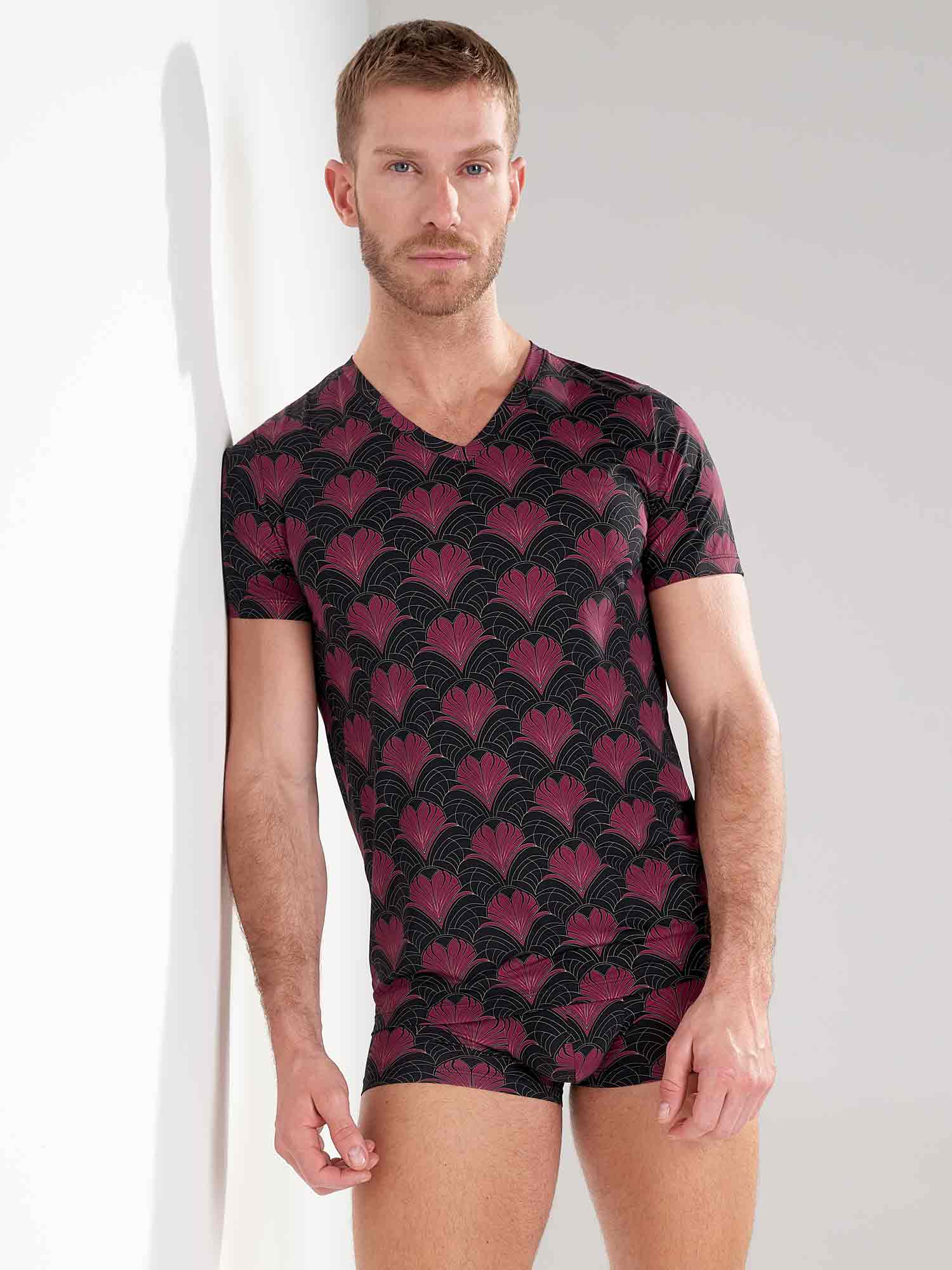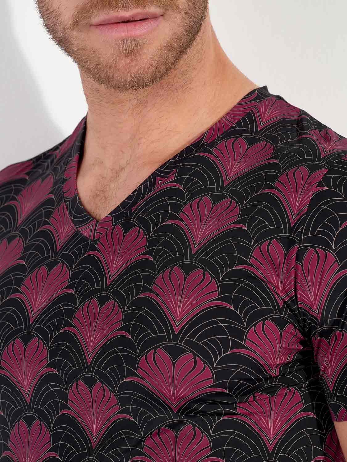 La camiseta Carlyle es más que una prenda básica para estar en casa: es una declaración de estilo y sofisticación. El lujoso patrón Art Deco en burdeos y dorado resalta maravillosamente sobre el fondo negro intenso. La microfibra suave y transpirable se siente como una segunda piel y se adapta a todos tus movimientos. Con un elegante cuello en V, esta camiseta se puede combinar con el trunk a juego para un conjunto completo.