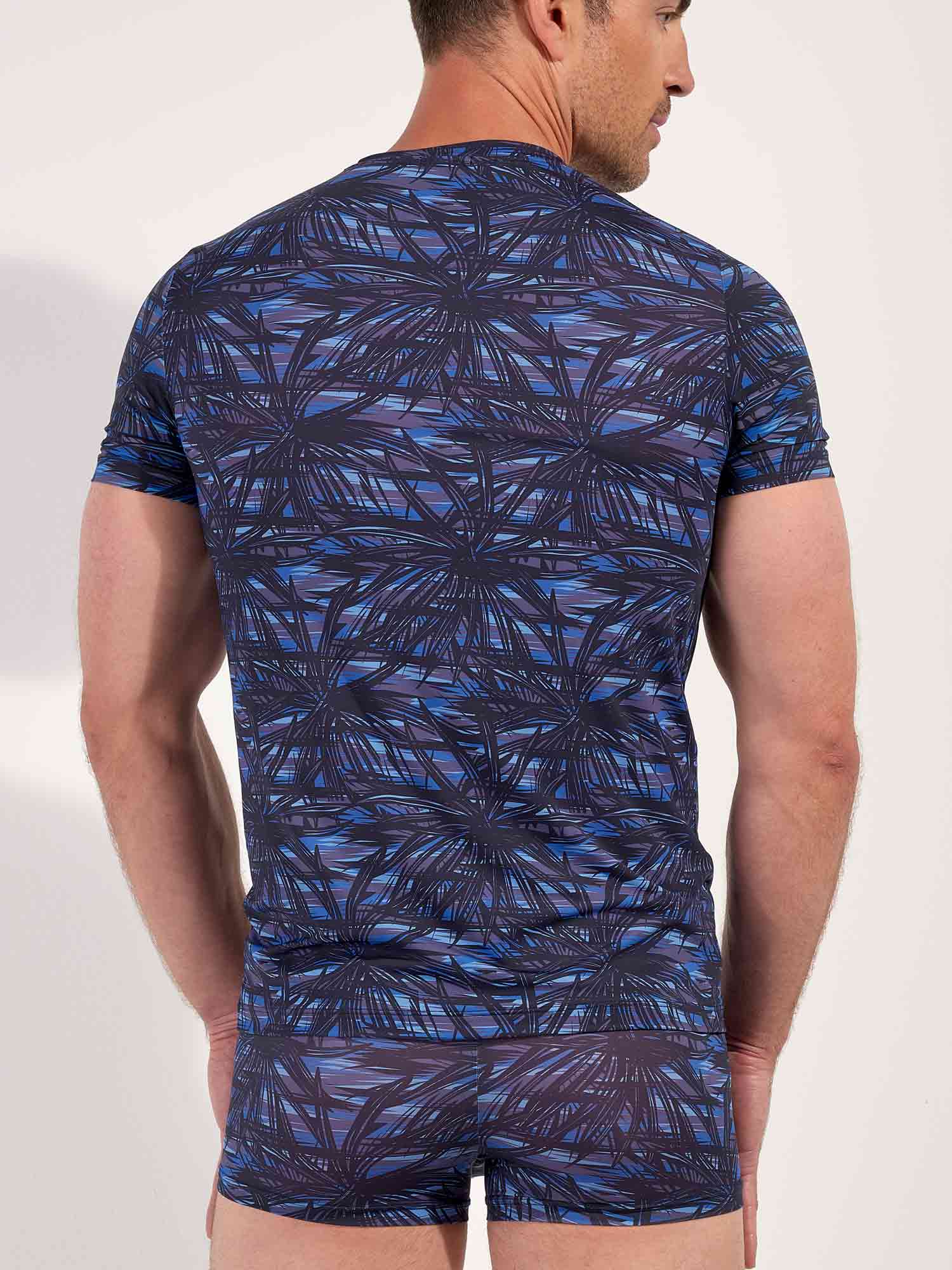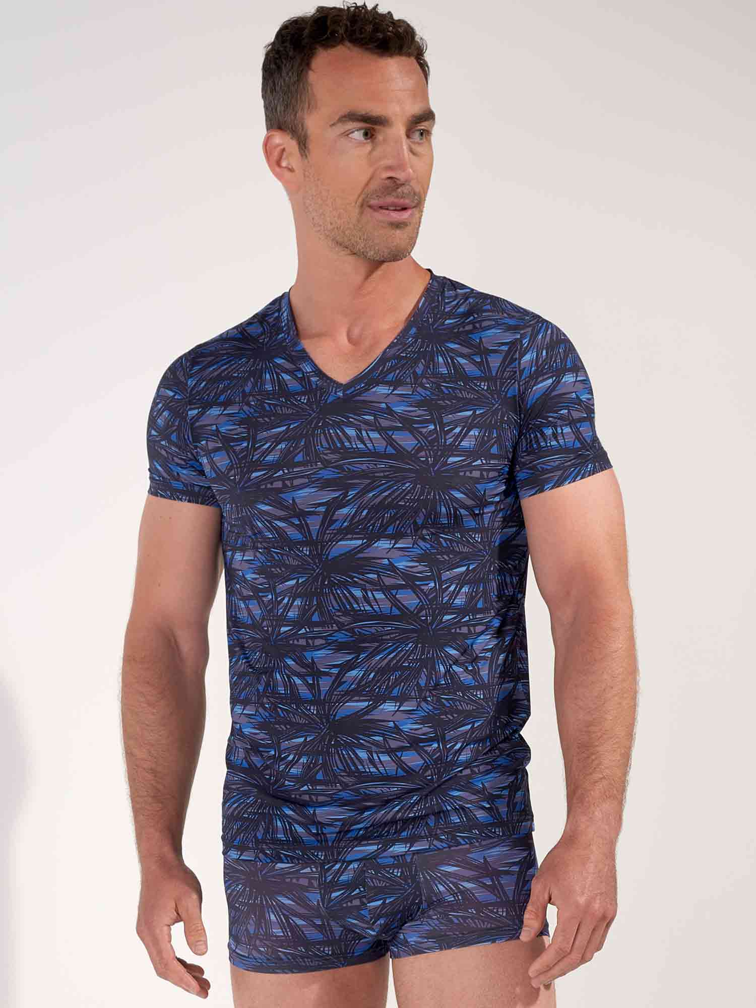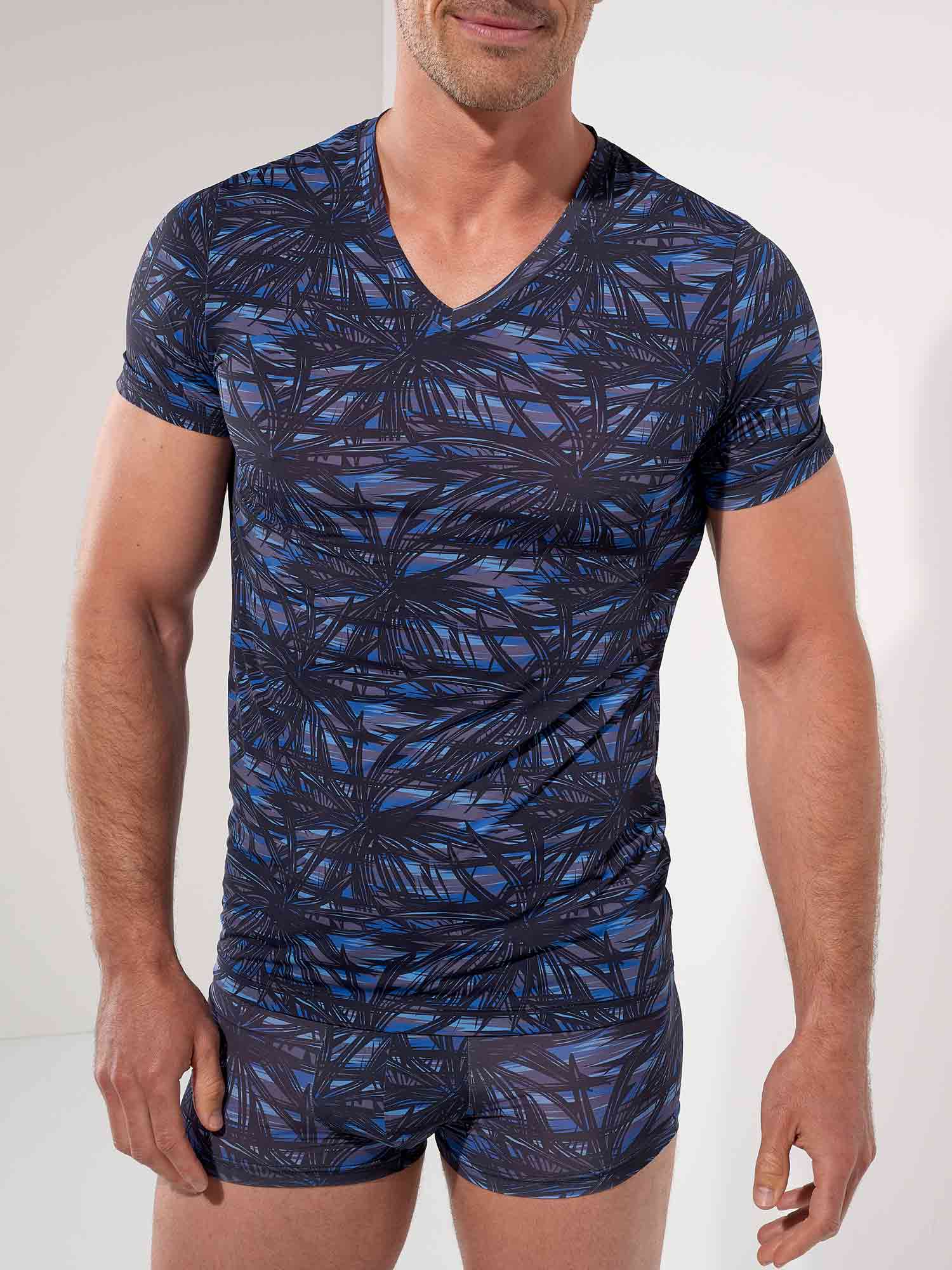 La camiseta HOM Star Island con cuello en V es la contraparte refinada del trunk a juego, pensada para hombres que aprecian el lujo coordinado. Los motivos gráficos de palmeras, inspirados en la noche de Las Vegas, destacan en negro profundo sobre capas de tonos azules para un look impactante y, a la vez, impecablemente elegante. Confeccionada en un tejido elástico y suave, se ajusta al cuerpo sin oprimir y ofrece una silueta estilizada que se mueve contigo. Llévala sola como statement o completa el conjunto con el trunk Star Island para un Temptation look perfectamente alineado.