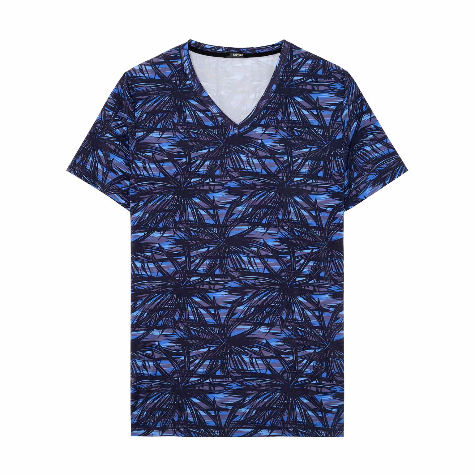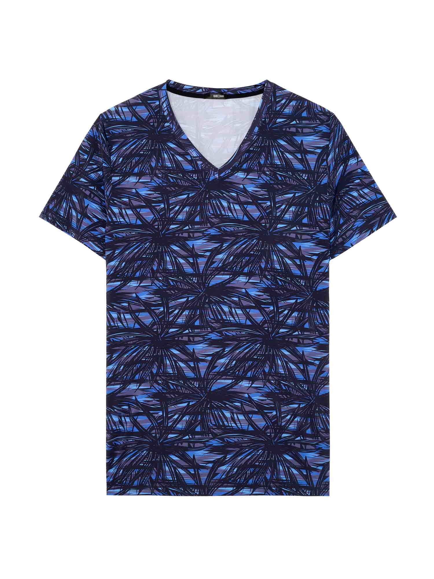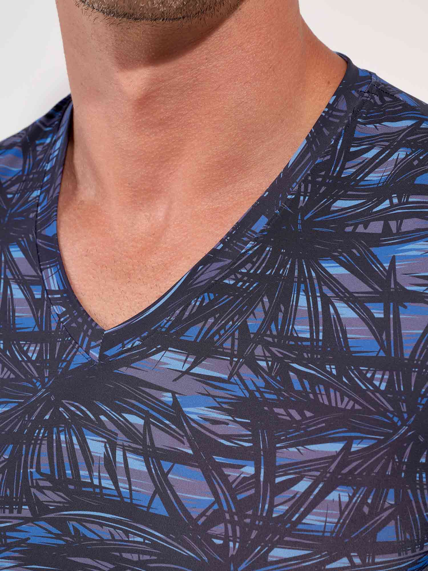 La camiseta HOM Star Island con cuello en V es la contraparte refinada del trunk a juego, pensada para hombres que aprecian el lujo coordinado. Los motivos gráficos de palmeras, inspirados en la noche de Las Vegas, destacan en negro profundo sobre capas de tonos azules para un look impactante y, a la vez, impecablemente elegante. Confeccionada en un tejido elástico y suave, se ajusta al cuerpo sin oprimir y ofrece una silueta estilizada que se mueve contigo. Llévala sola como statement o completa el conjunto con el trunk Star Island para un Temptation look perfectamente alineado.