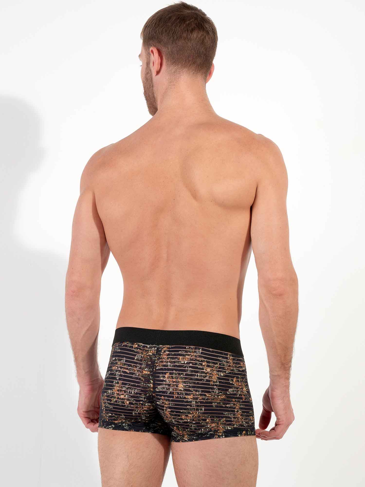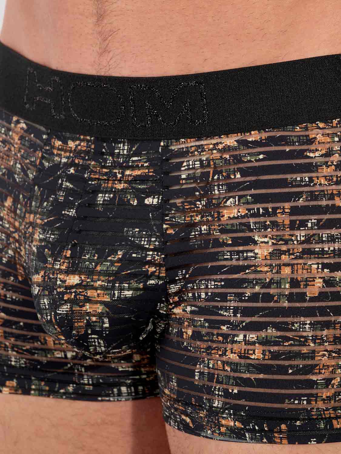 The Iraty trunk from the HOM Temptation collection is a masterclass in subtle seduction. It blends a sensual camouflage pattern in green, ochre, and black with floral details that invite closer inspection. Horizontal transparent lines reveal just enough skin for a tantalising silhouette, while the velvety microfiber hugs the body effortlessly. The lined pouch offers extra comfort and a discreet, flattering look. The Iraty trunk is made for men who dare to seduce with style and confidence.
