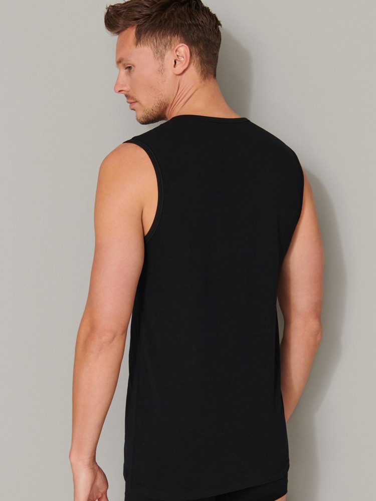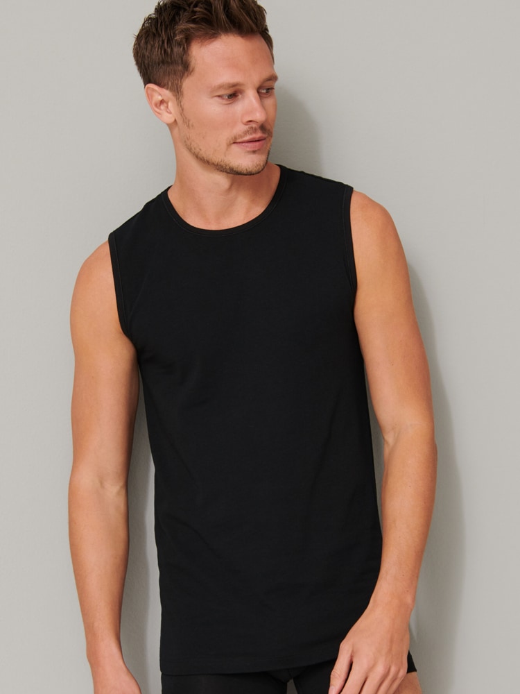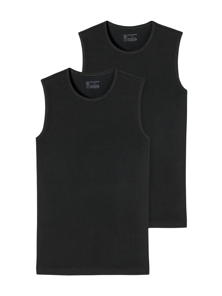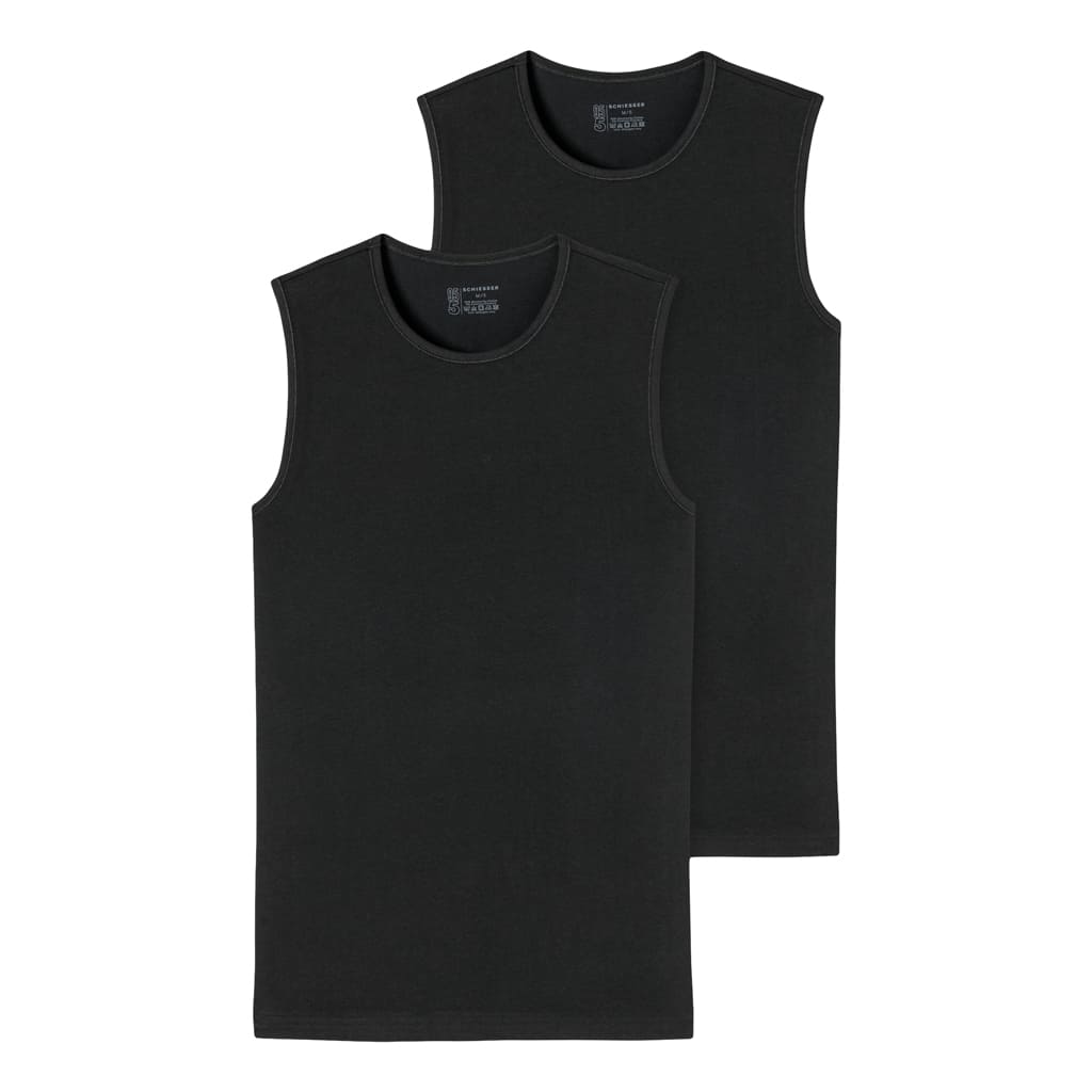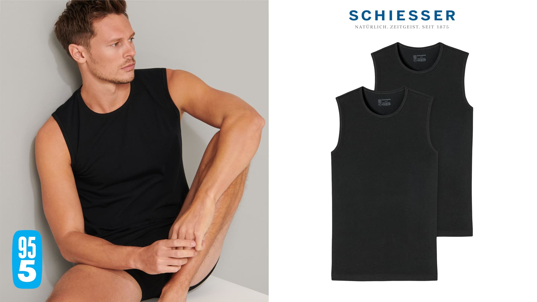 2 camisetas sin mangas para hombre en un paquete doble, de la popular serie SCHIESSER "95/5". Las camisetas sin mangas tienen cuello redondo y están hechas de 95% algodón orgánico natural y 5% elastano. Están tejidas en una calidad de jersey elástico perfectamente ajustada. Las camisetas sin mangas 95/5 se pueden lavar a una temperatura de hasta 60 grados.